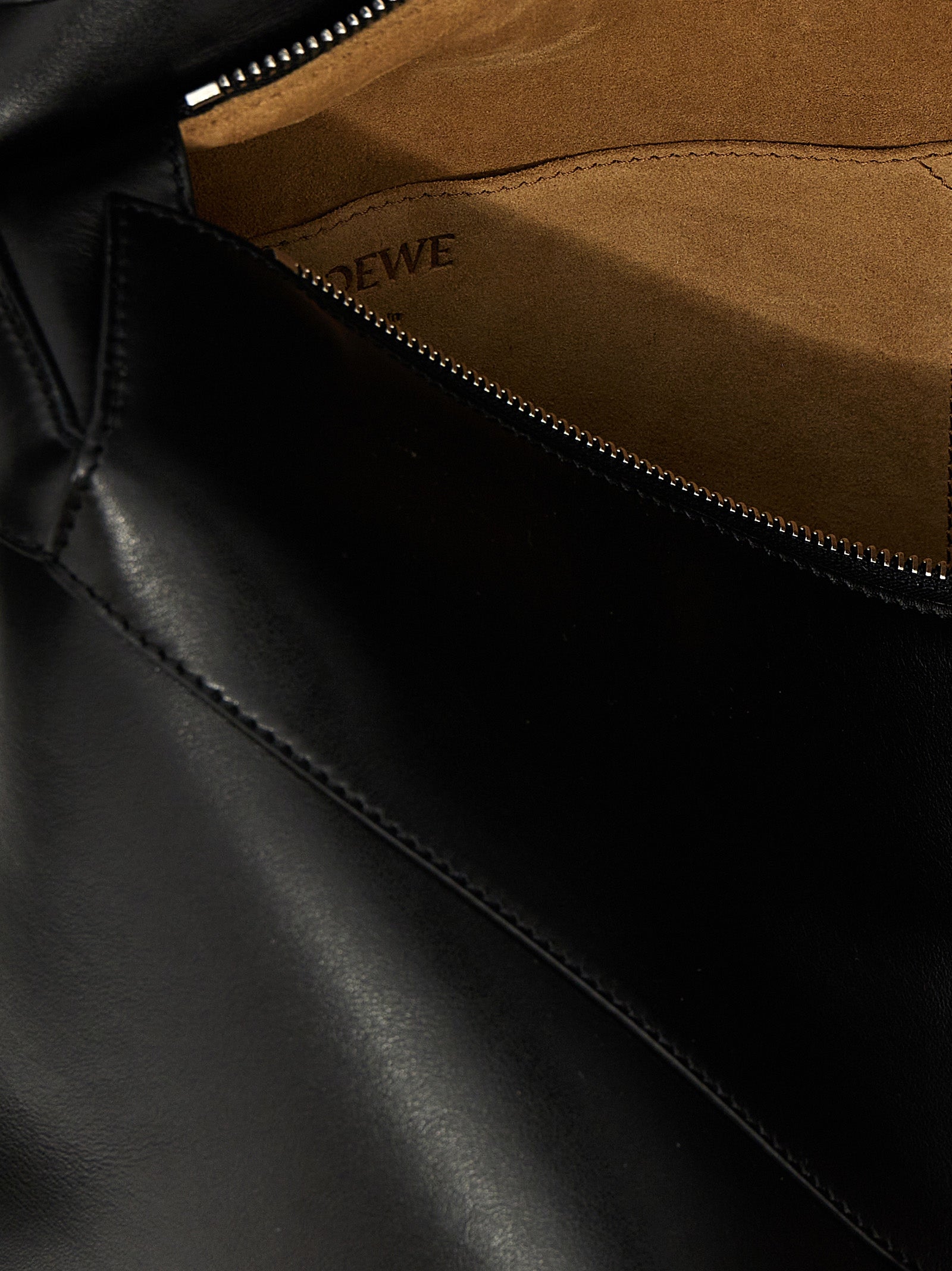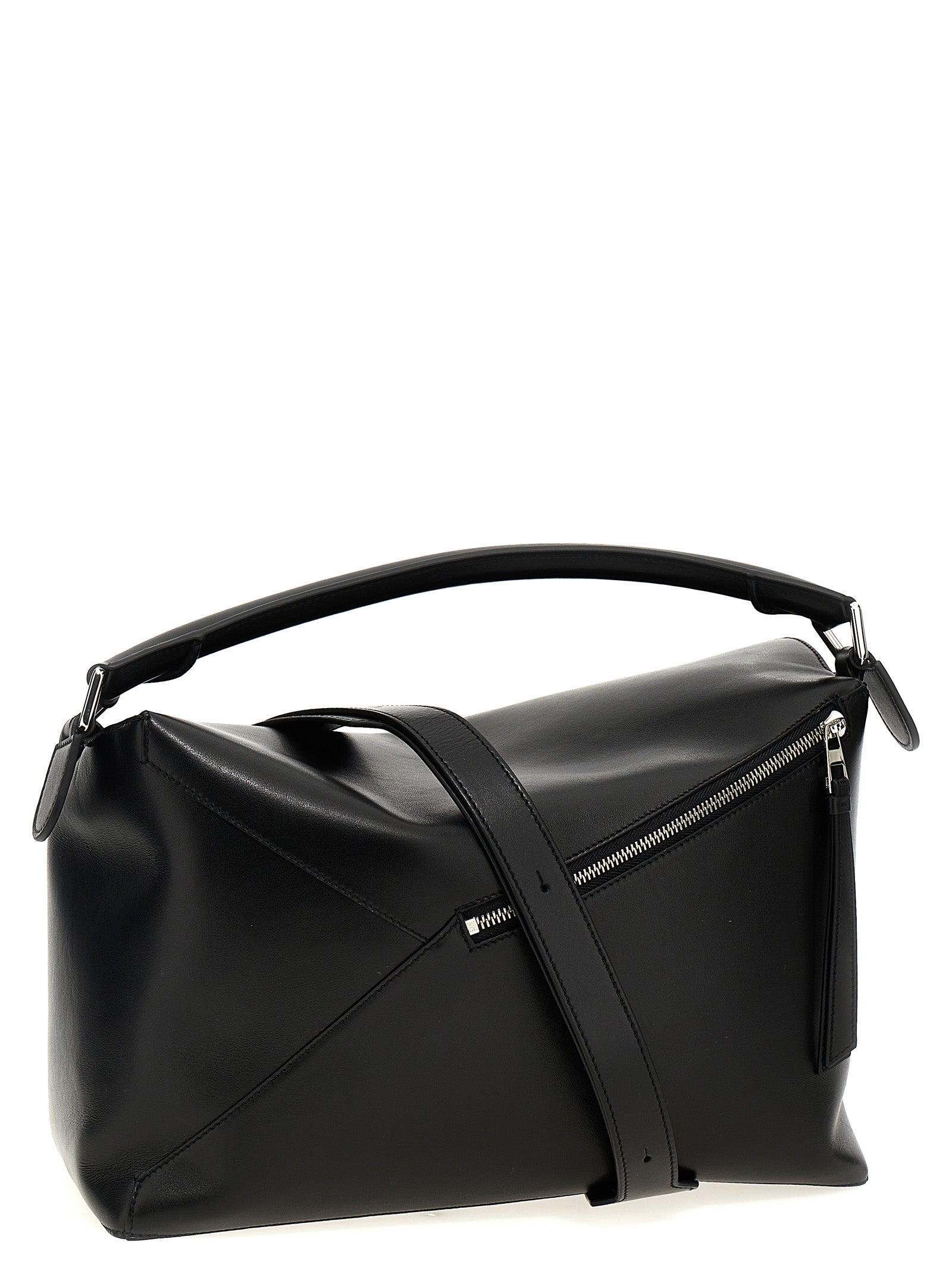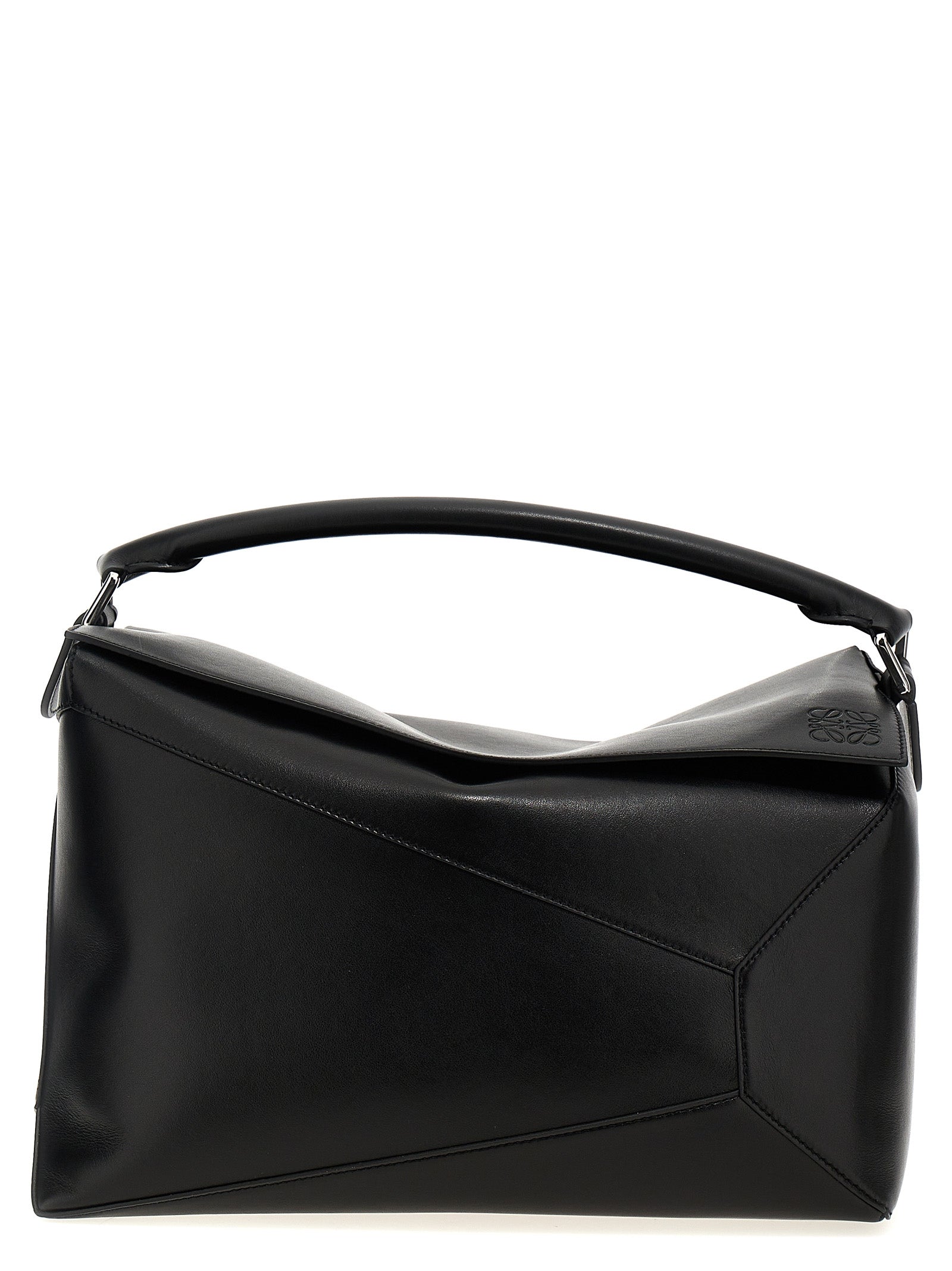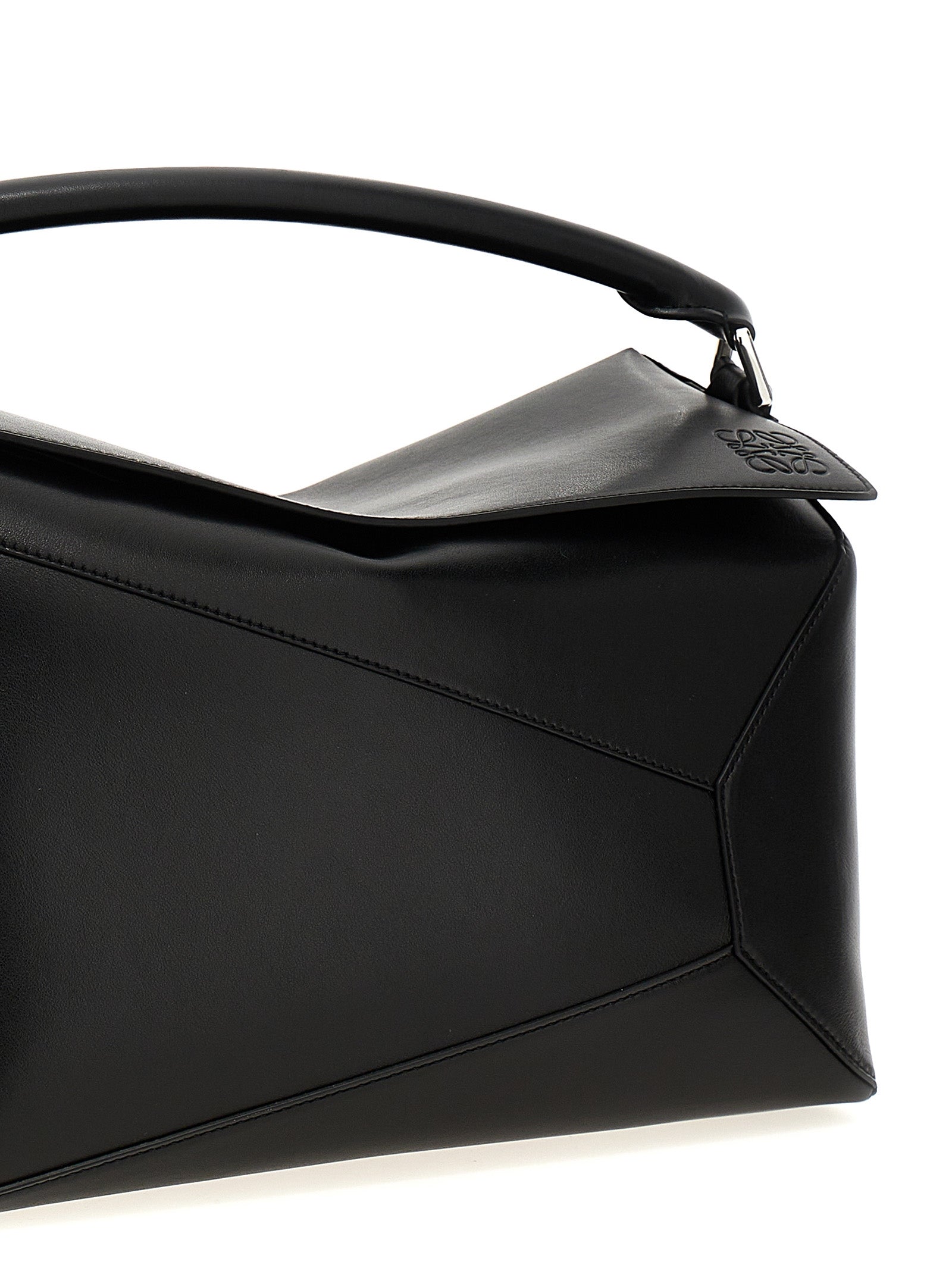'Puzzle' leather handbag with zip and flap closure, fixed handle, adjustable and removable shoulder strap, and front embossed logo.