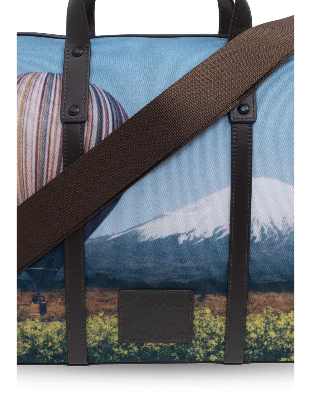 multicolour recycled polyester all-over graphic print leather top handles zip-fastening compartment detachable shoulder strap internal slip pocket internal zip-fastening pocket This item is made from at least 50% recycled or upcycled materials. For recycled synthetic clothing products, we highly recommend using a microfibre-catching washing bag to ensure that no microplastics that can pollute water are released in the process. Learn more about what makes a product Conscious on our Conscious Criteria page