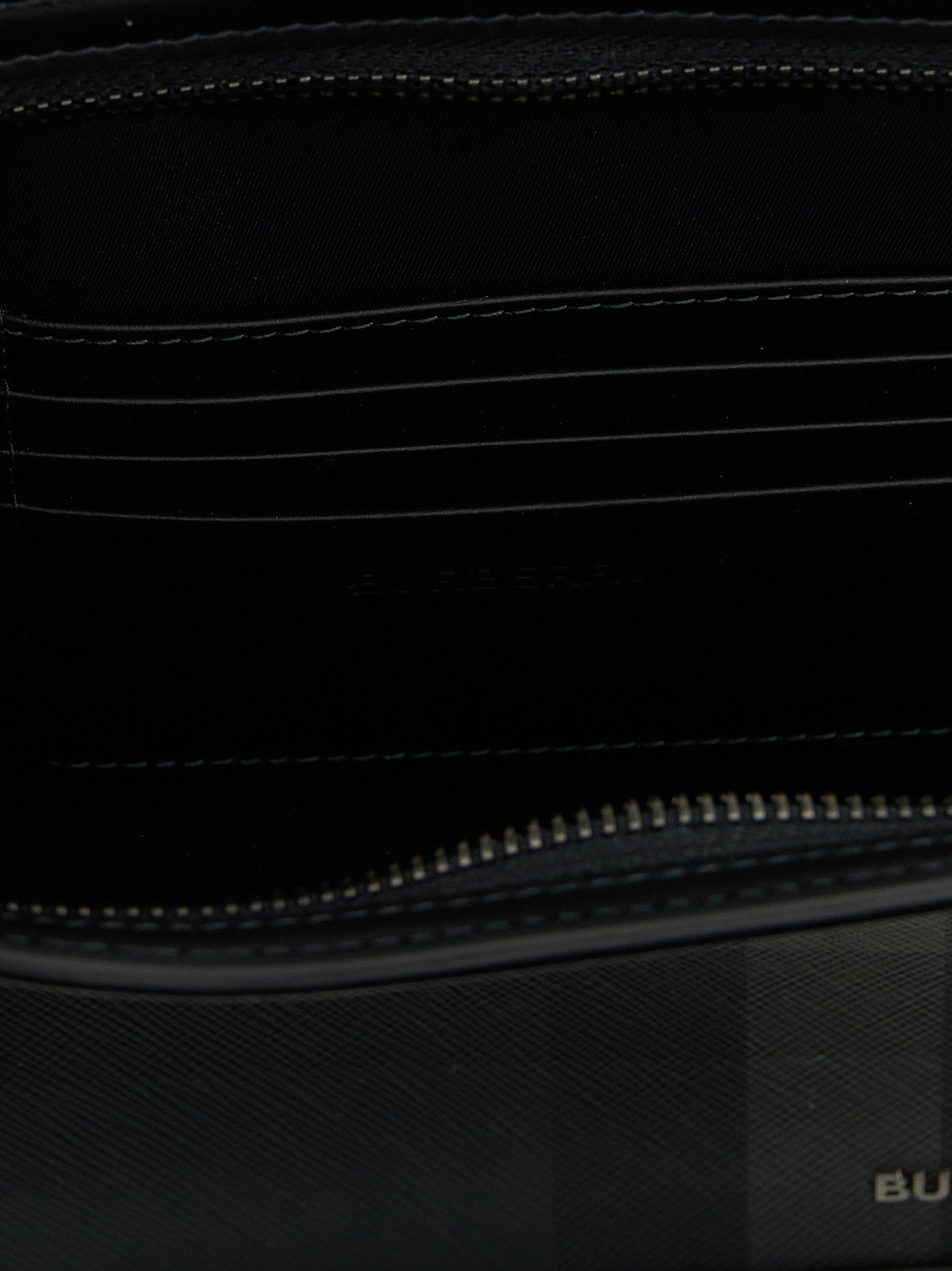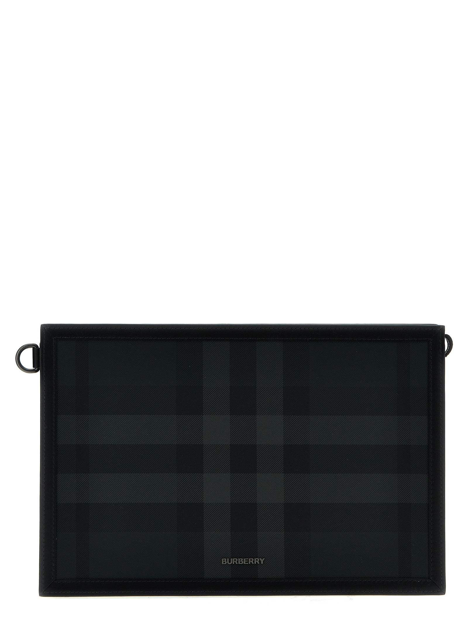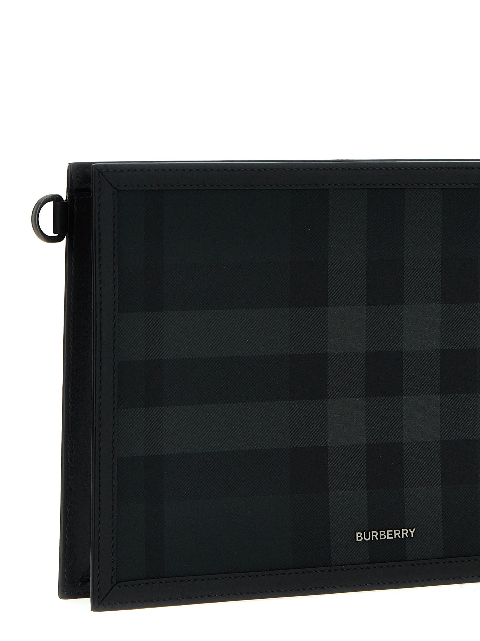 Check-print fabric clutch bag, leather details, zip closure, removable wrist handle.