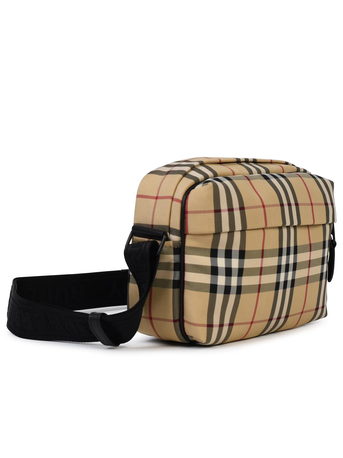 Nylon shoulder bag with 'Burberry Check' pattern and calf leather trim, adjustable ribbon shoulder strap with jacquard logo, on top zip closure, front zip pocket, flat pocket with magnetic closure at the back