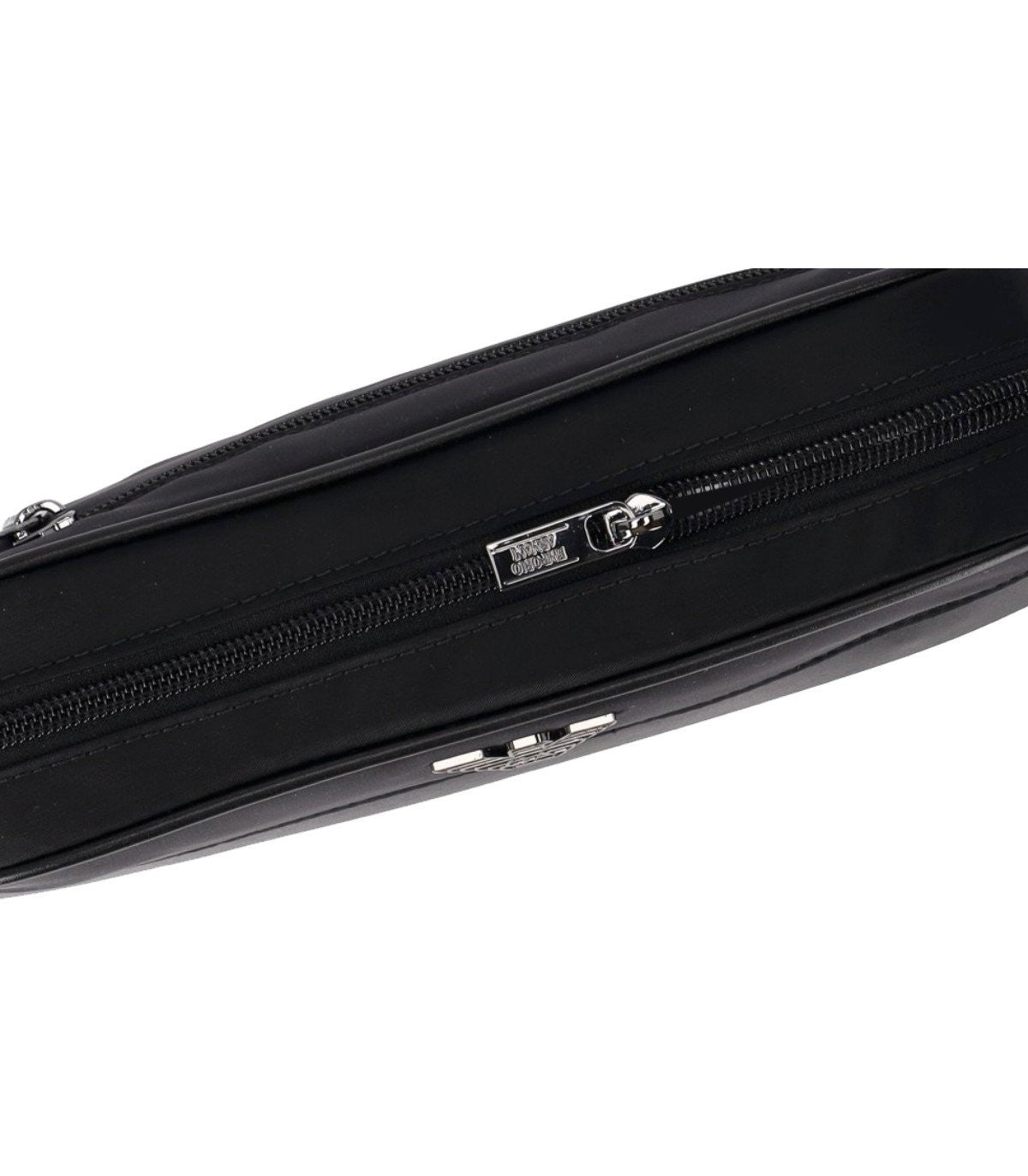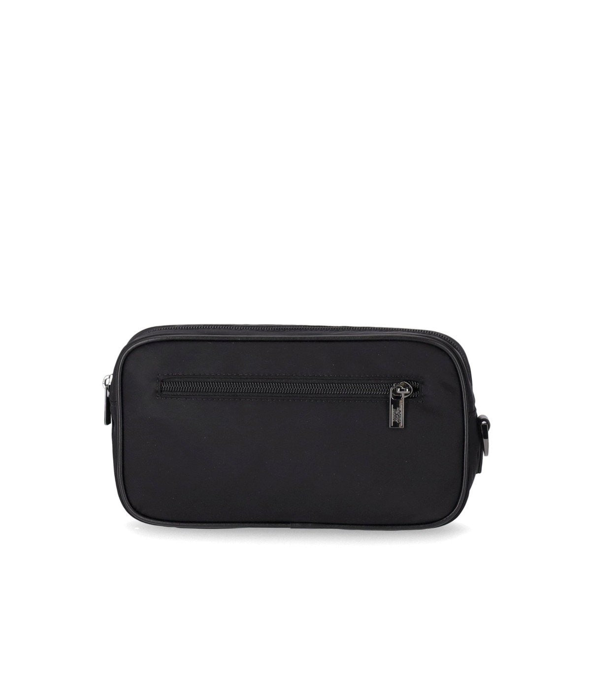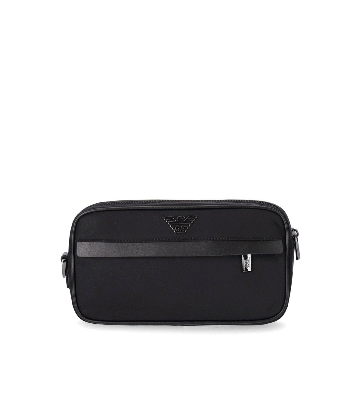 Beauty case by Emporio Armani made of black nylon with regenerated leather inserts, in tone. Interior equipped with flat compartments, external pockets with zip and metal logo on the front. Zip closure, logoed fabric wrist strap, detachable. Size 23x13x5.5 cm. Composition: 100% polyamide.