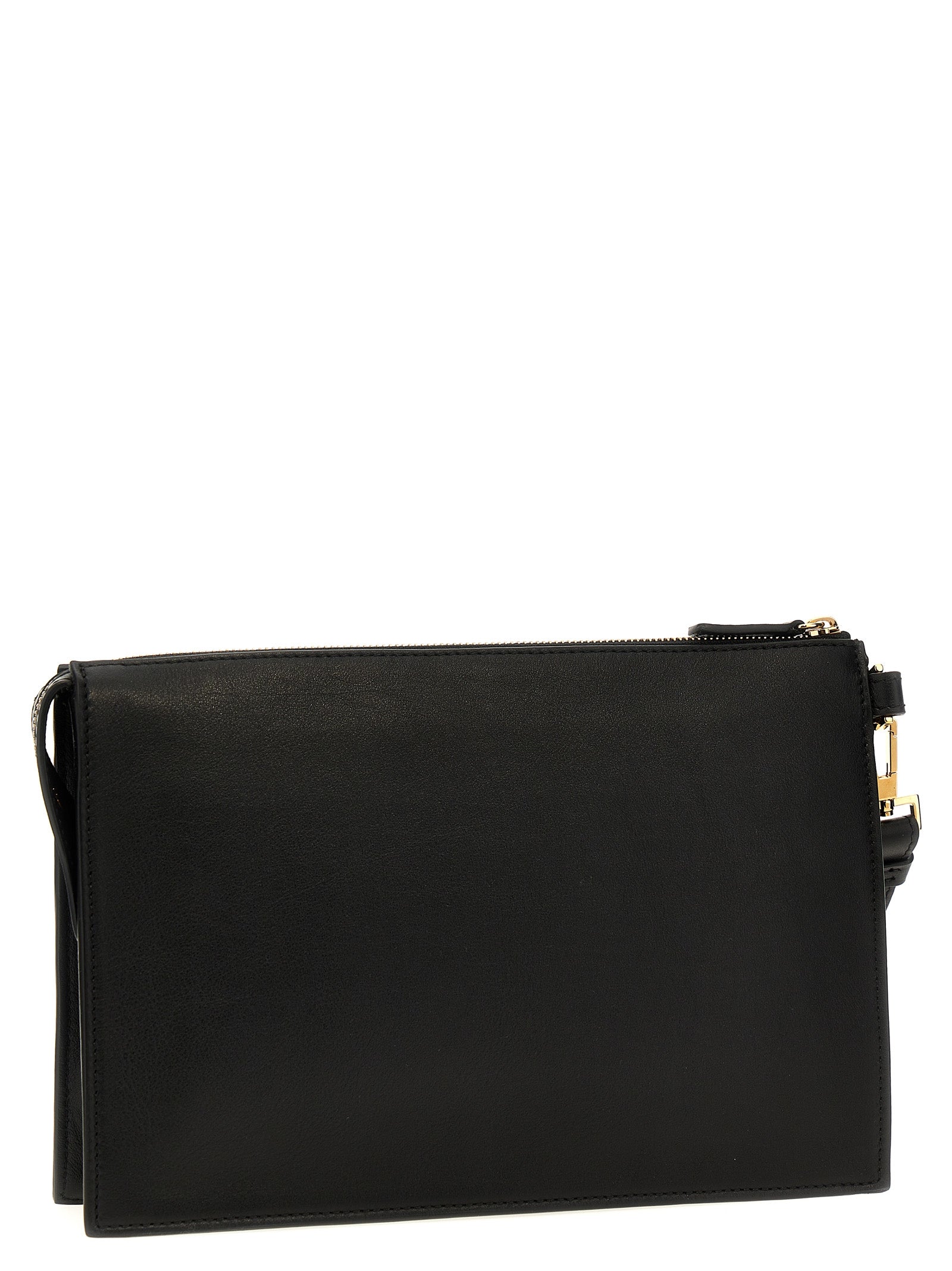 Leather clutch bag with metal 'Medusa Biggie' detail, zip closure, removable wrist handle.