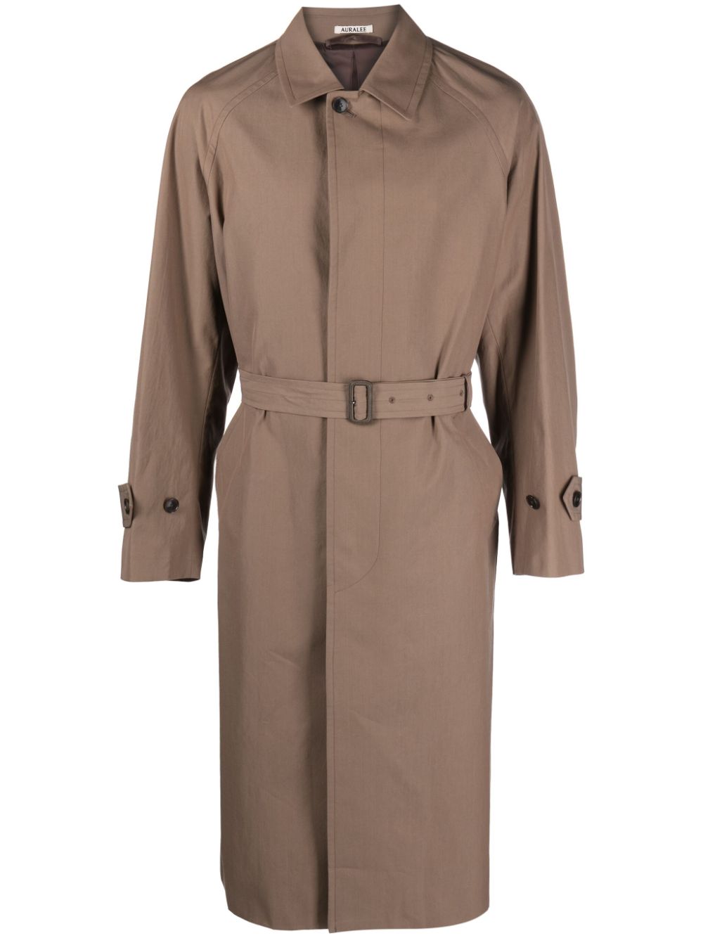 belted button-up cotton coat from AURALEE featuring brown, cotton, tonal stitching, detachable and adjustable waist belt, spread collar, concealed front button fastening, long sleeves, belted cuffs, straight hem and calf-length.