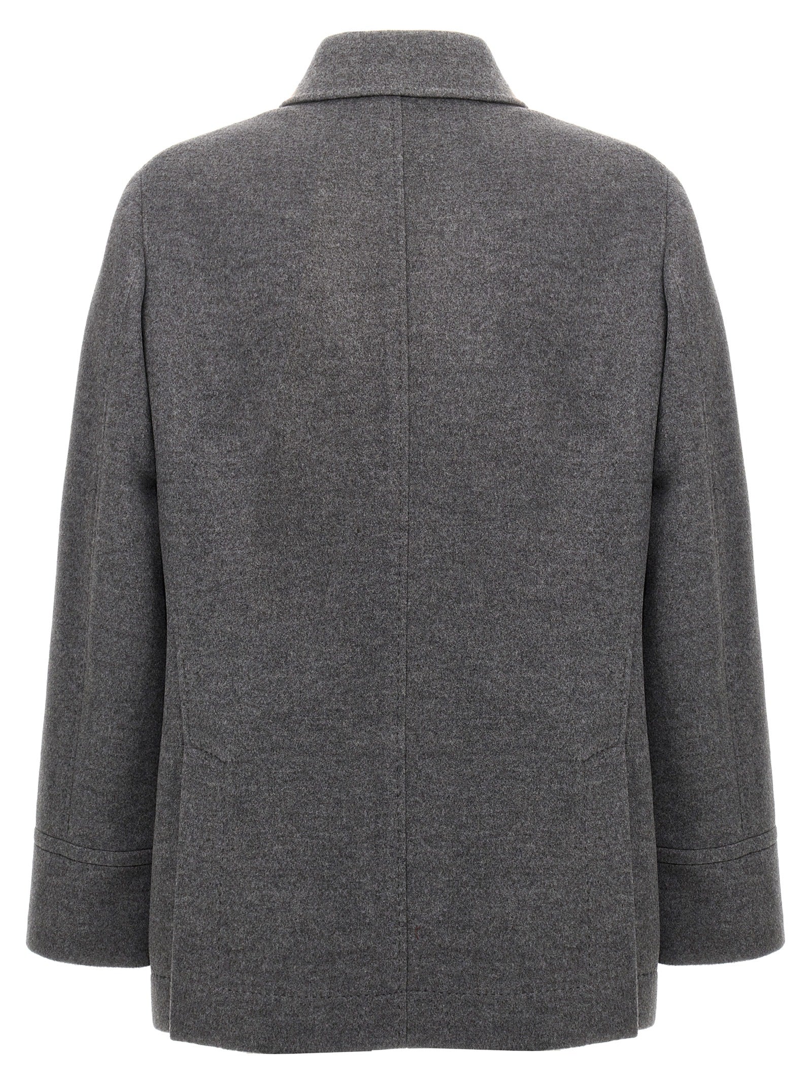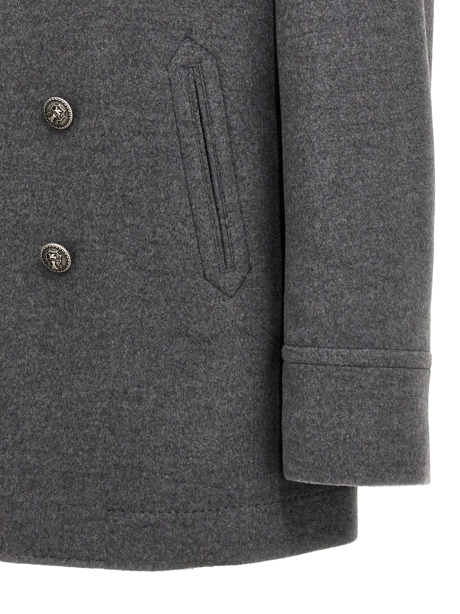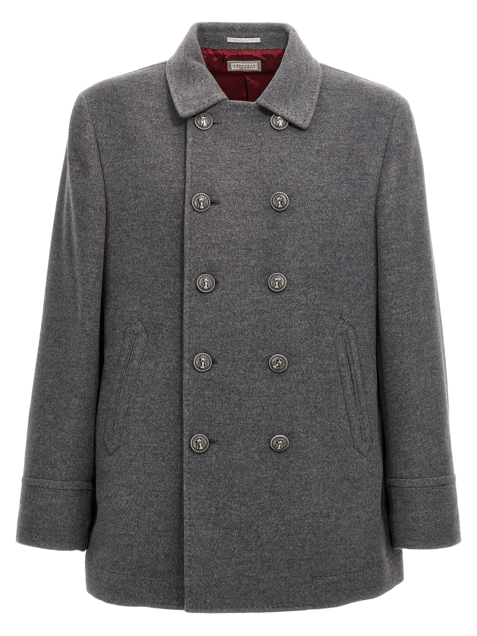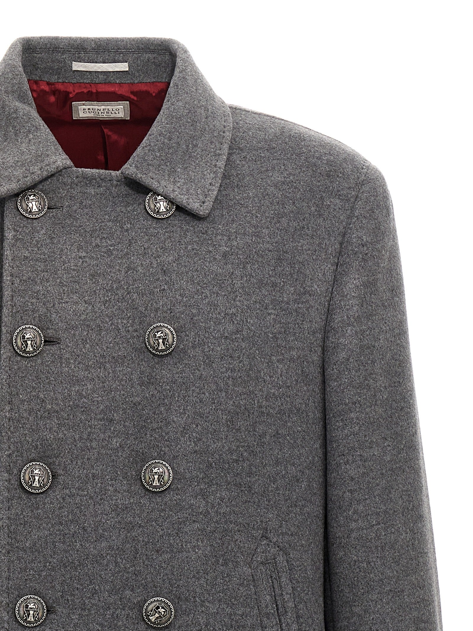 Double-breasted cashmere coat with button closure, pockets, long sleeves, back vents.