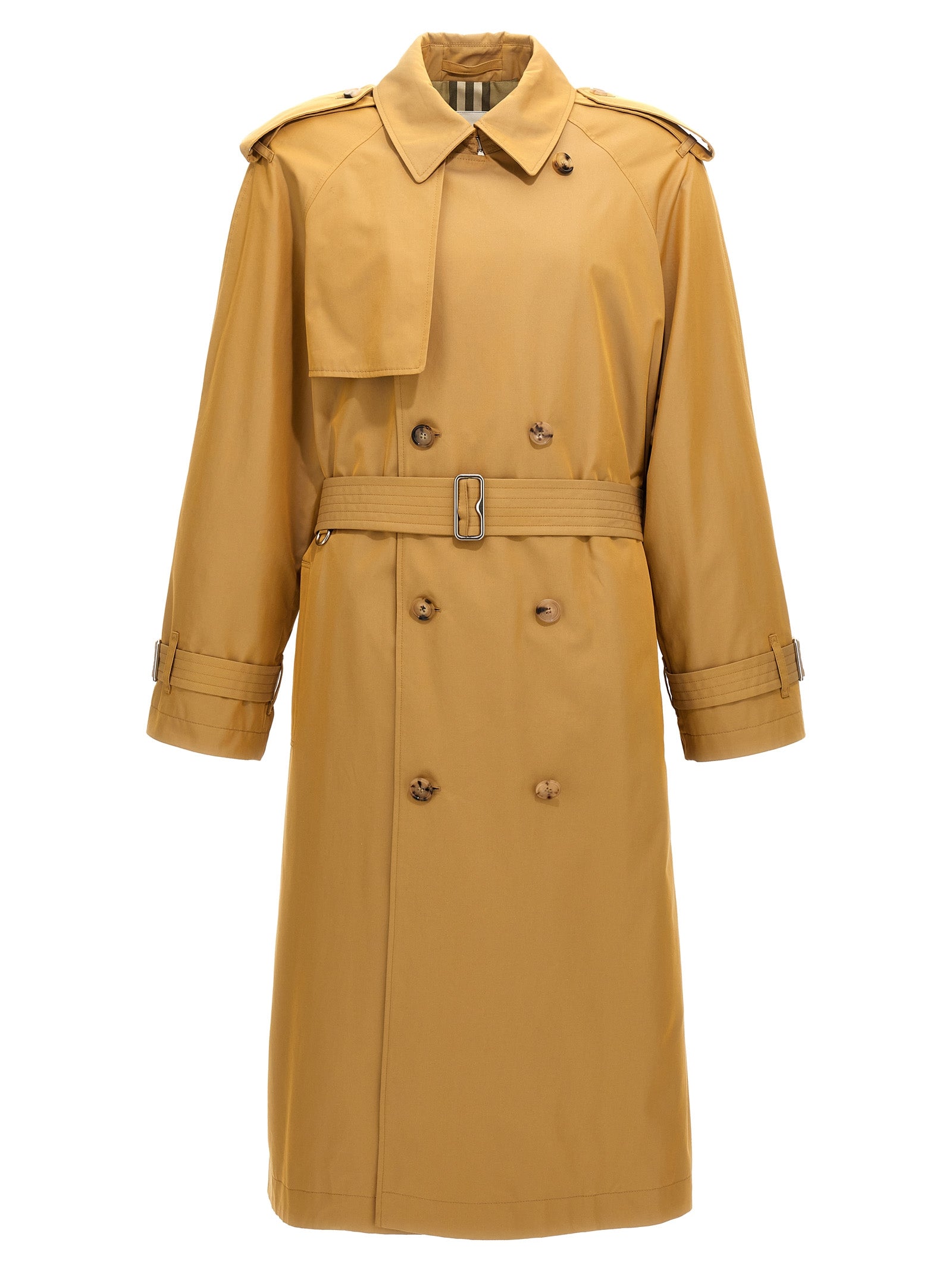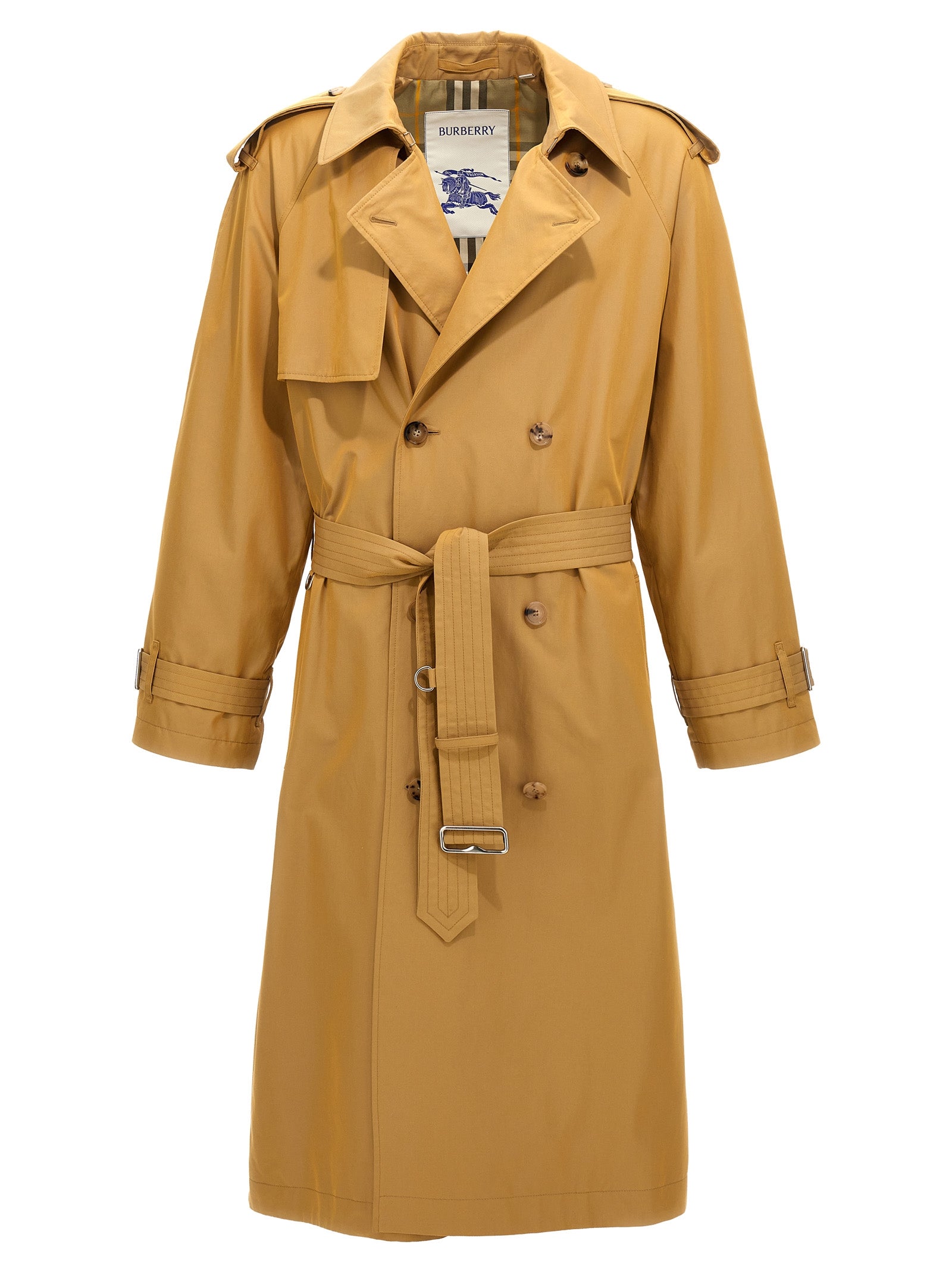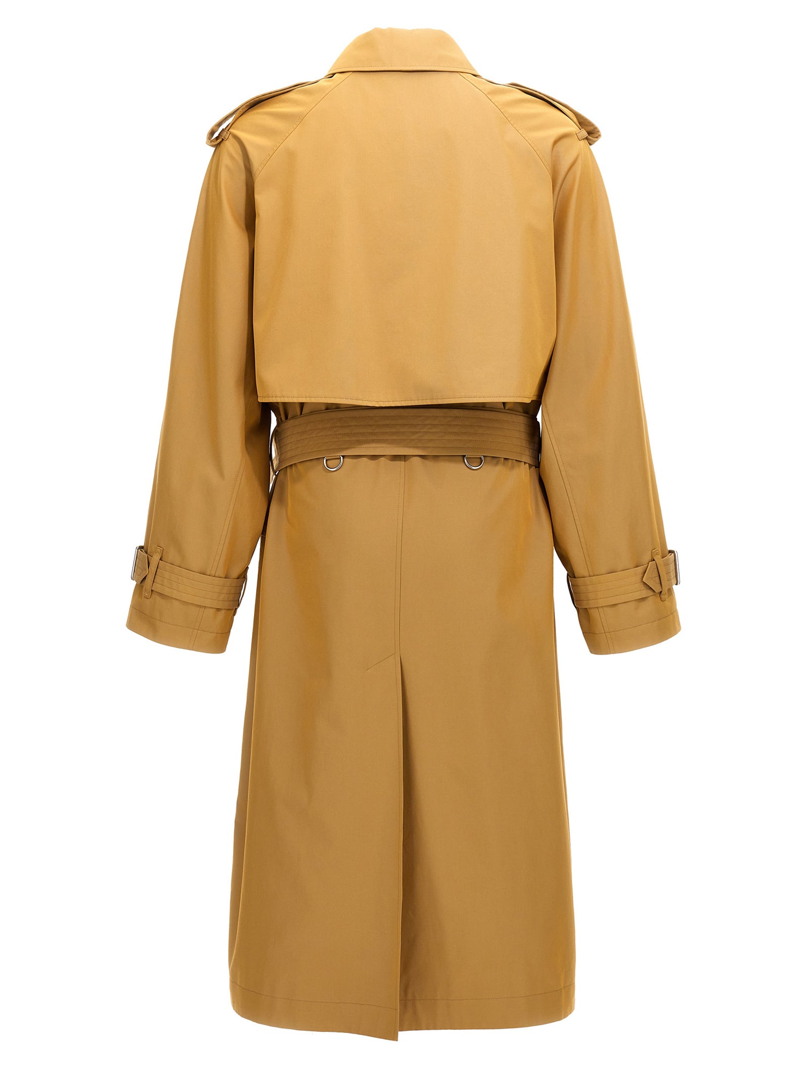 Double-breasted long trench coat in silk blend with snap button closure, belt at the waist, pockets, long sleeves with adjustable straps, and back split.
