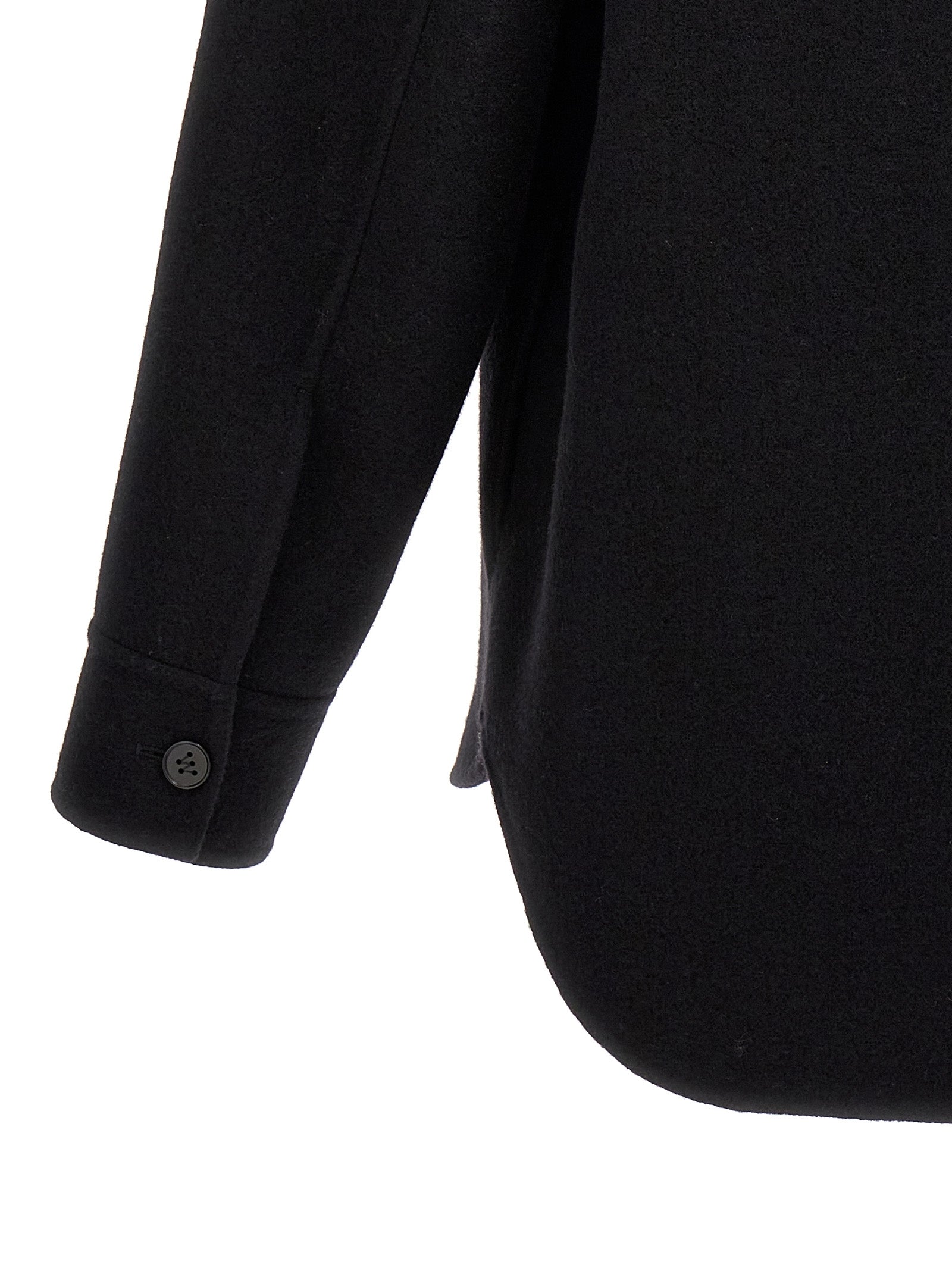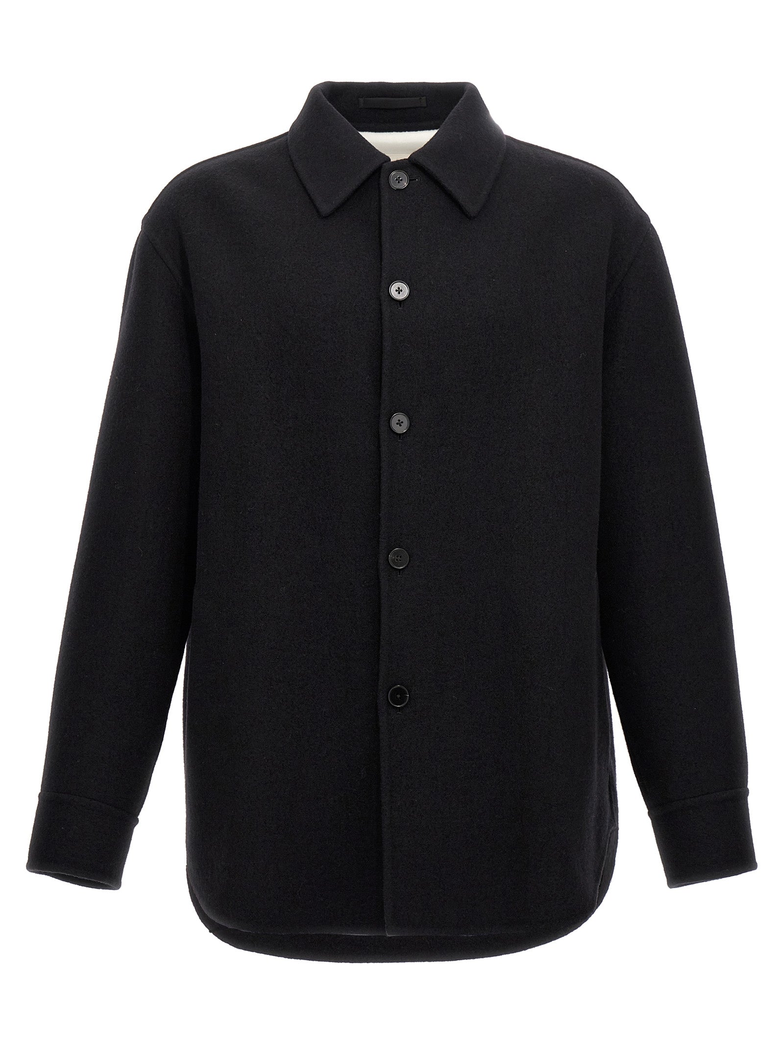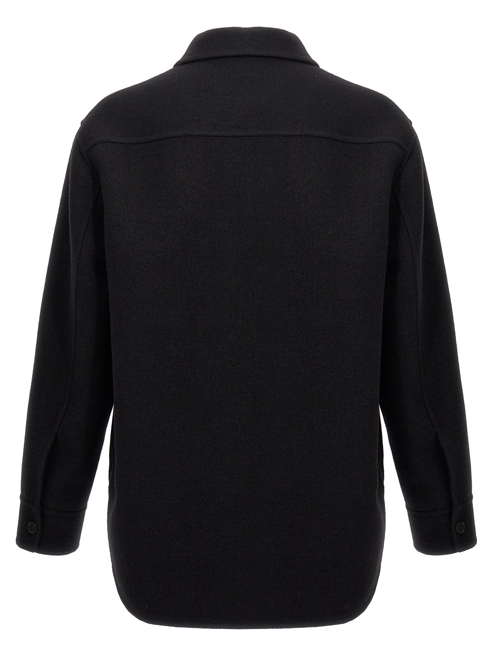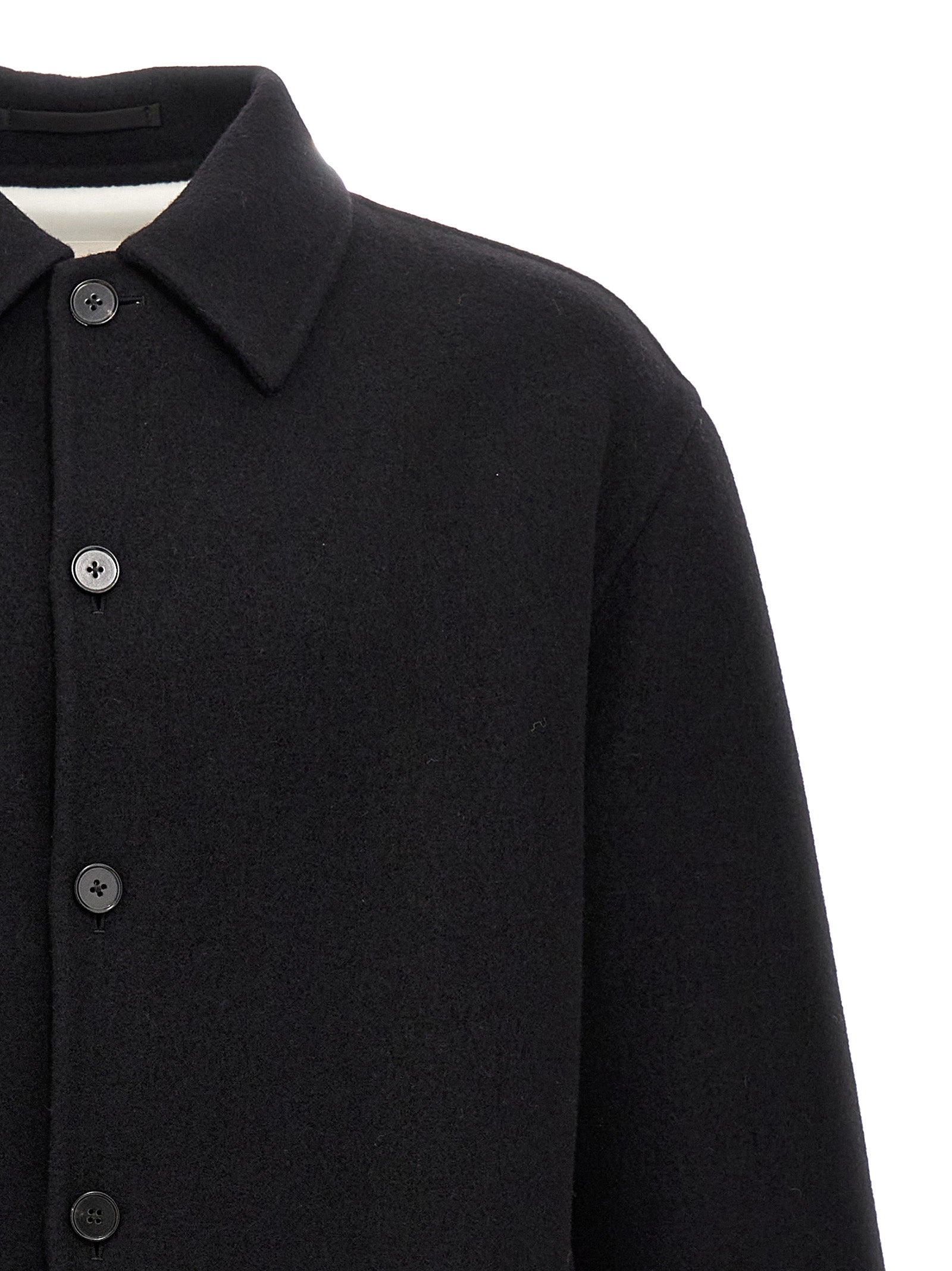 Wool coat with button closure, pockets, long cuffed sleeves.