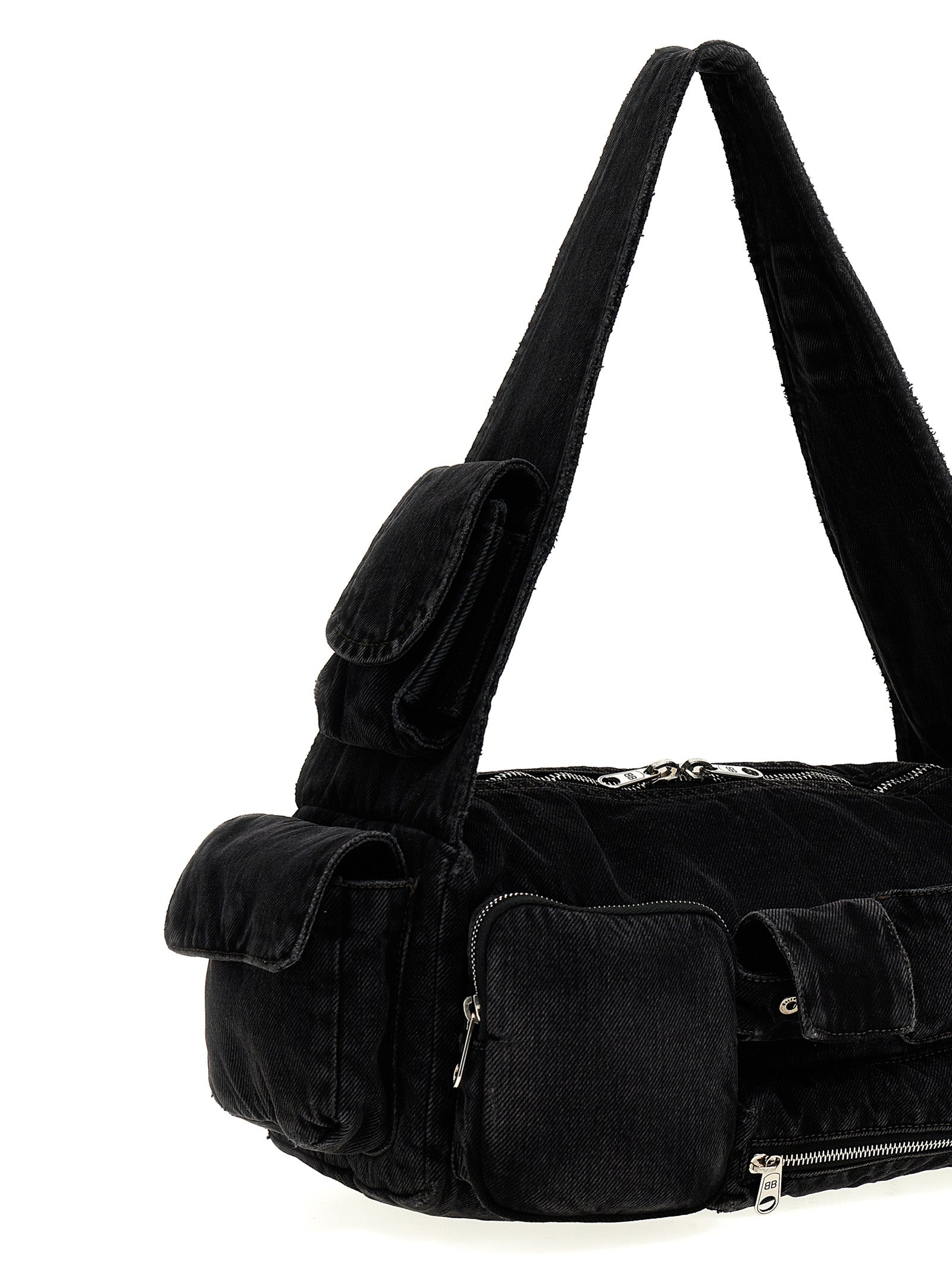 'Superbusy' washed denim small crossbody bag, outer zip pockets, zip closure, front AirPods Pro pocket, fixed handle.