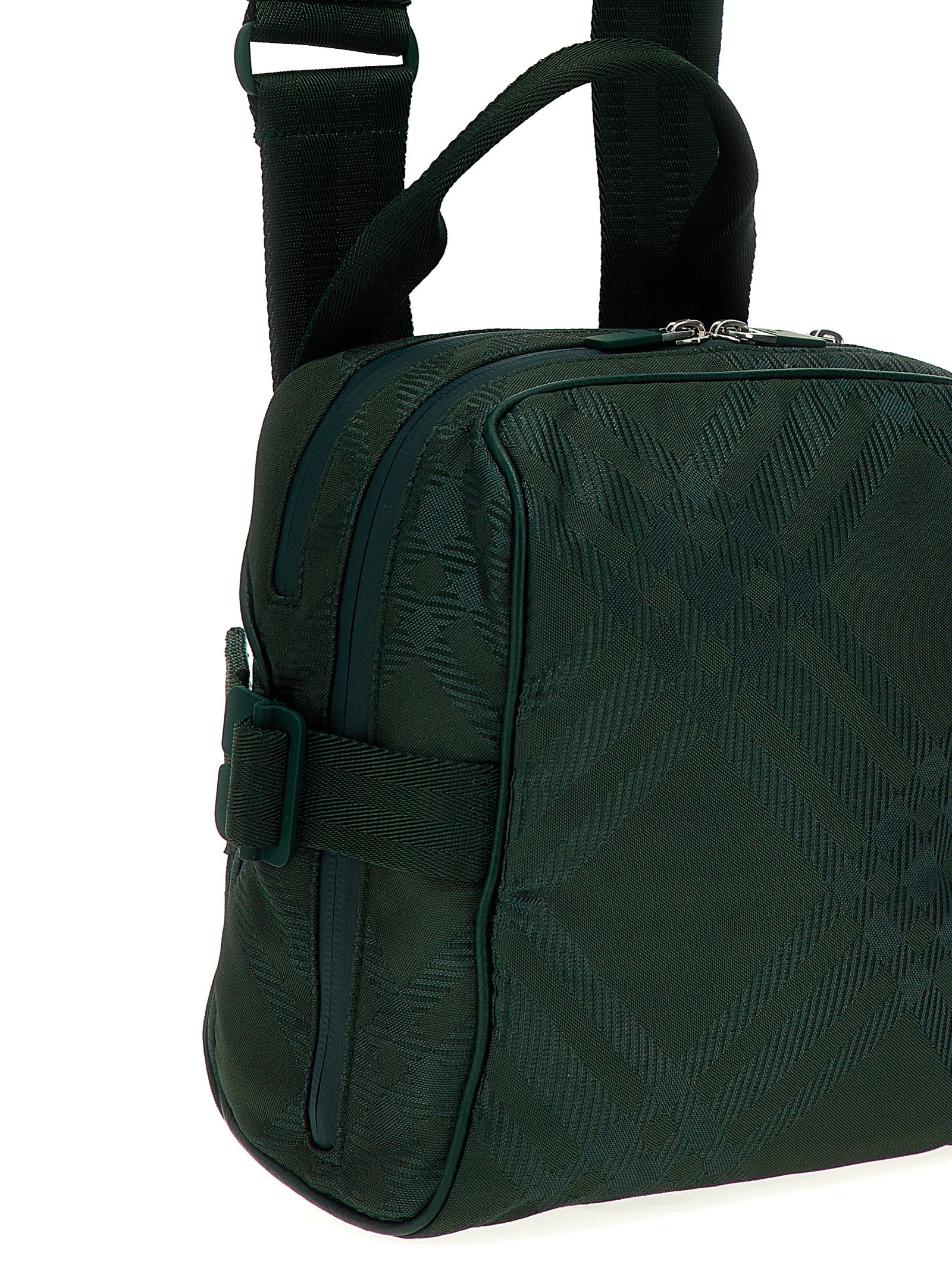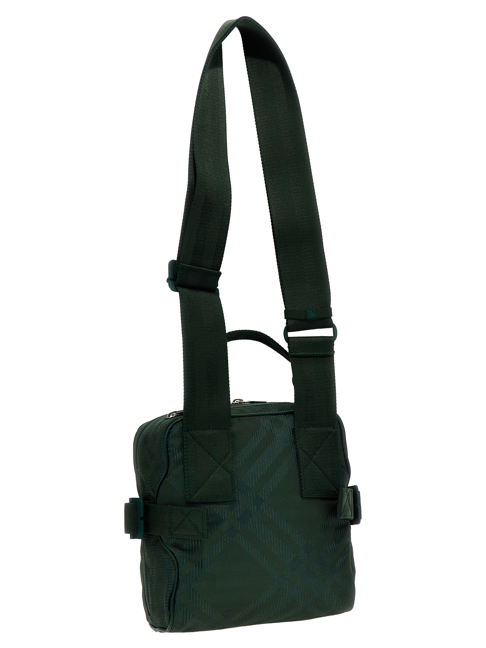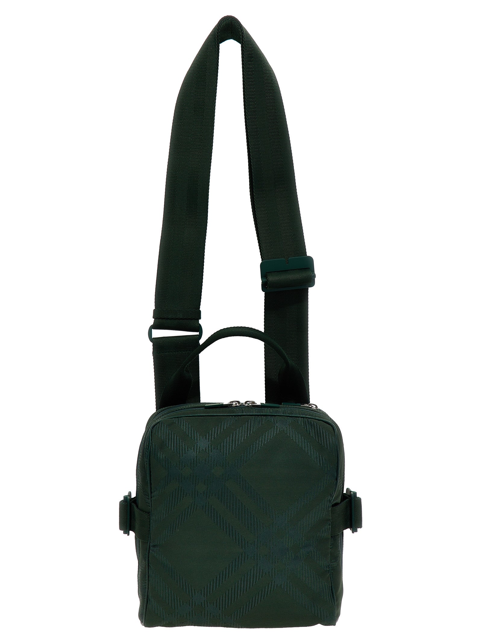 Check fabric shoulder strap, zip closure, adjustable shoulder strap.