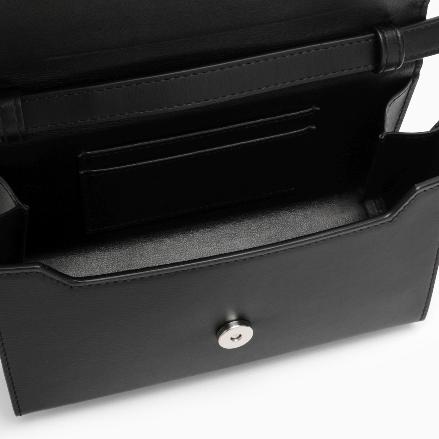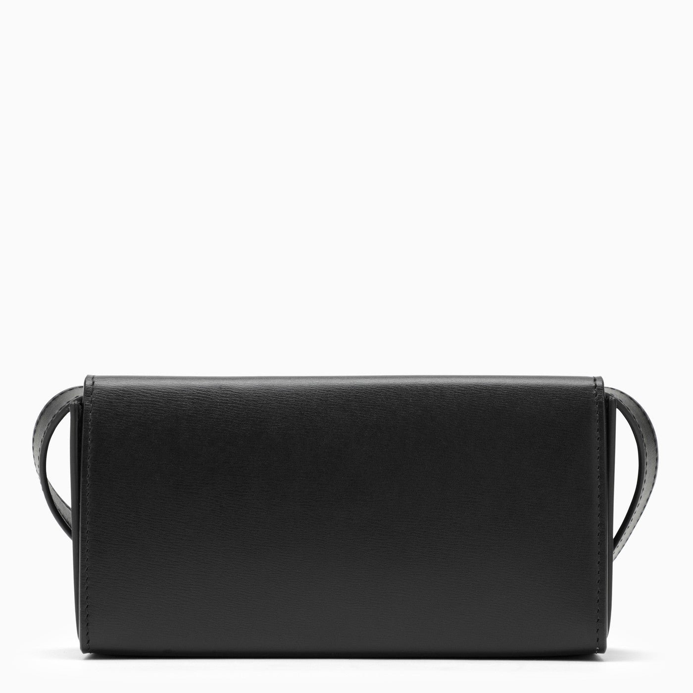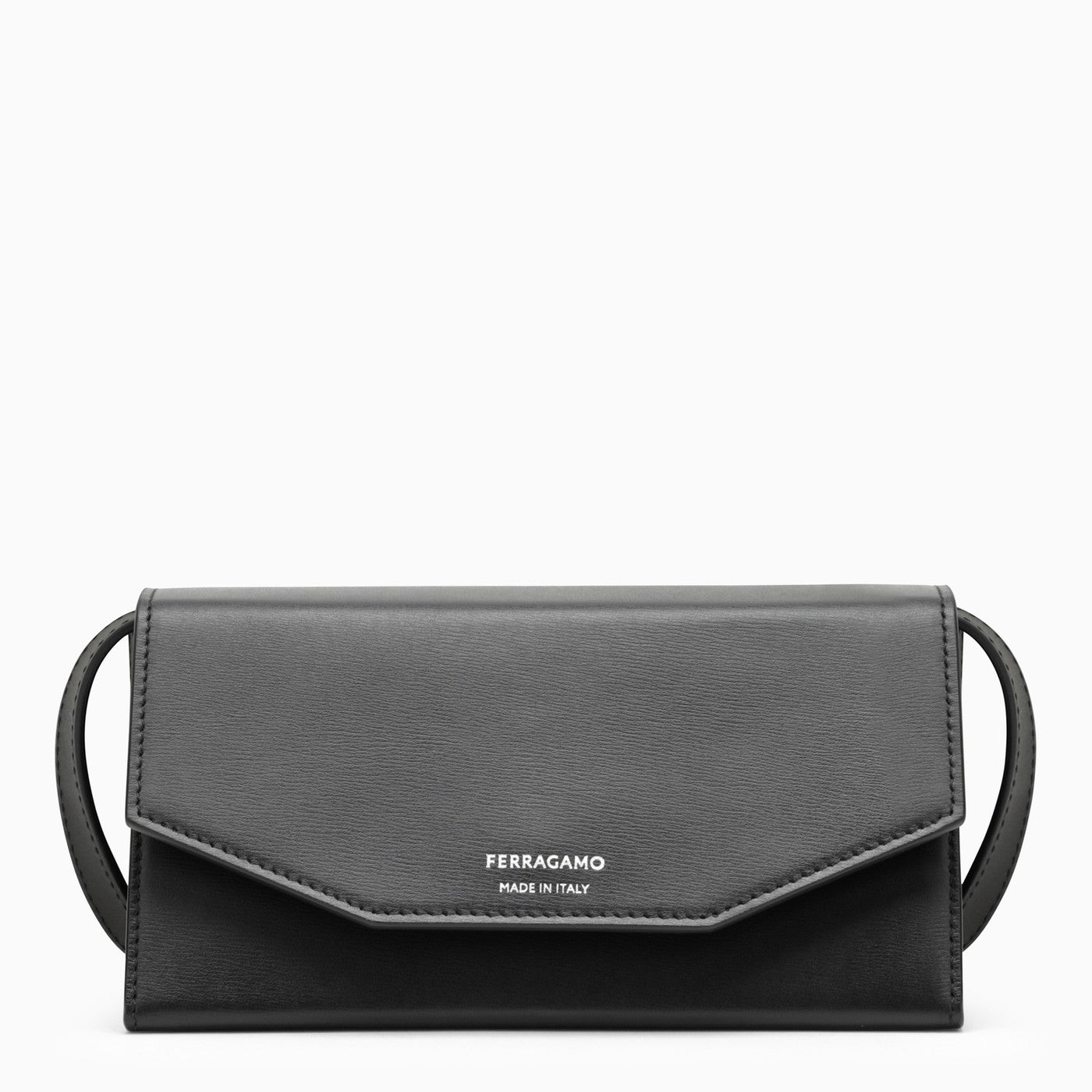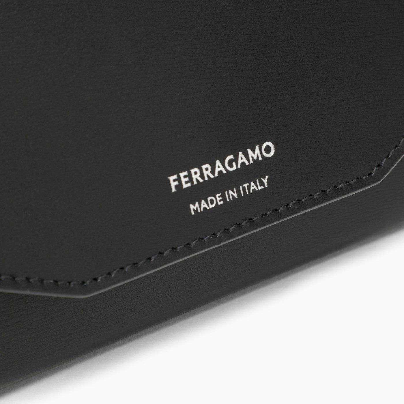 Black leather shoulder bag by Ferragamo featuring a semi-rigid flap closure, front lettering logo, adjustable and removable shoulder strap and internal card compartments.