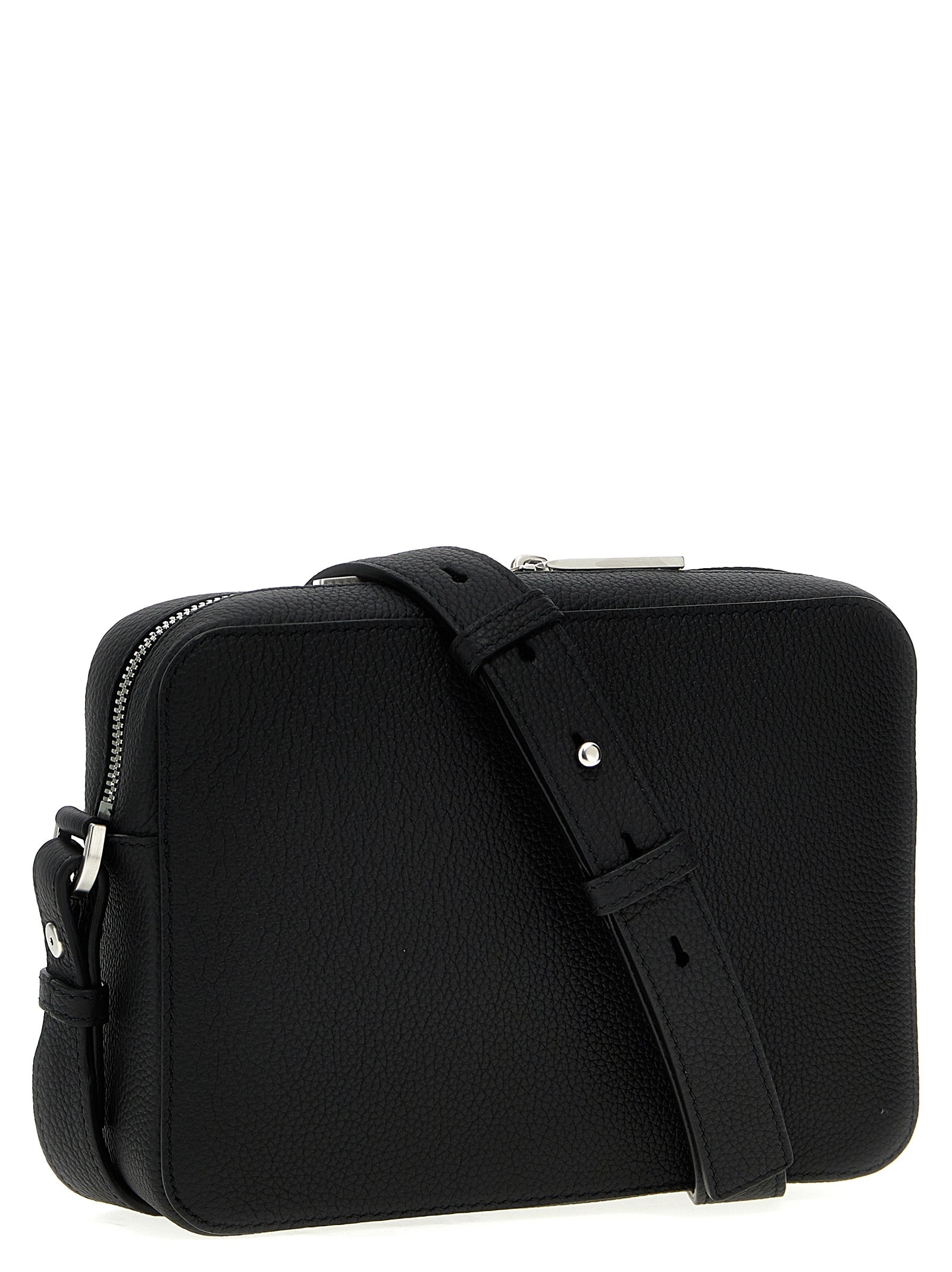 Leather logo crossbody bag, front panel with embossed logo, zip closure, adjustable shoulder strap.