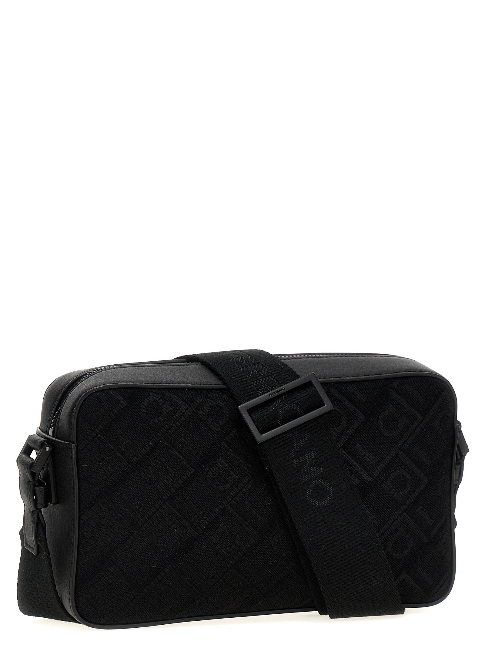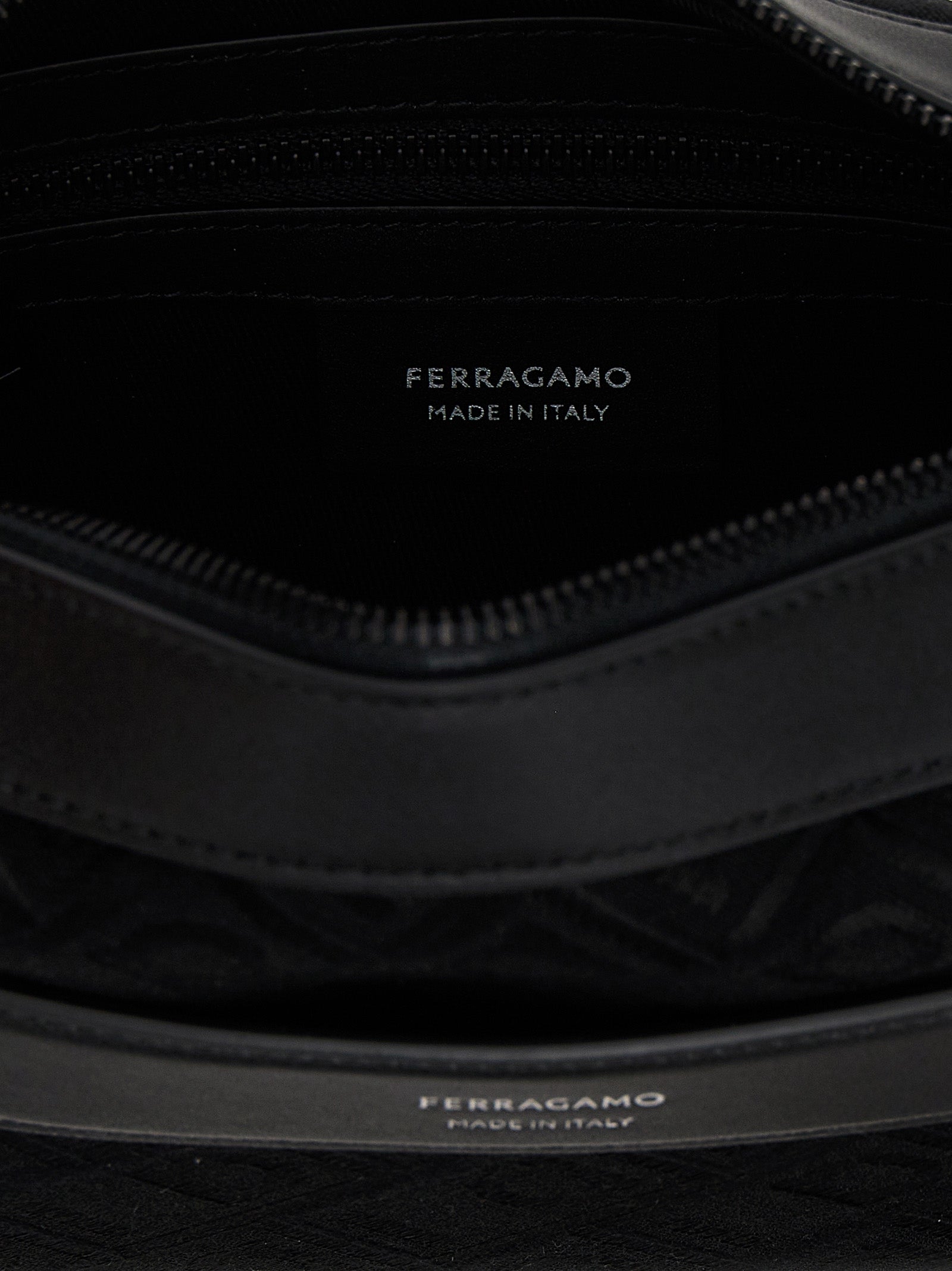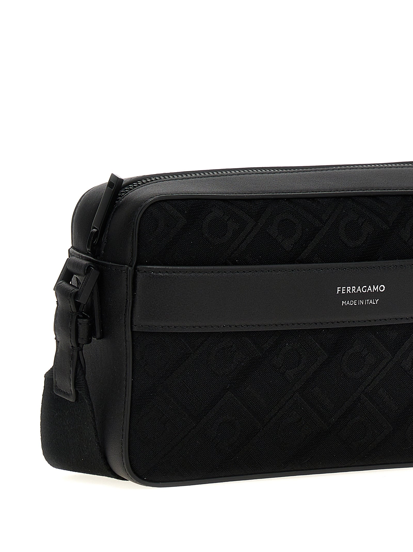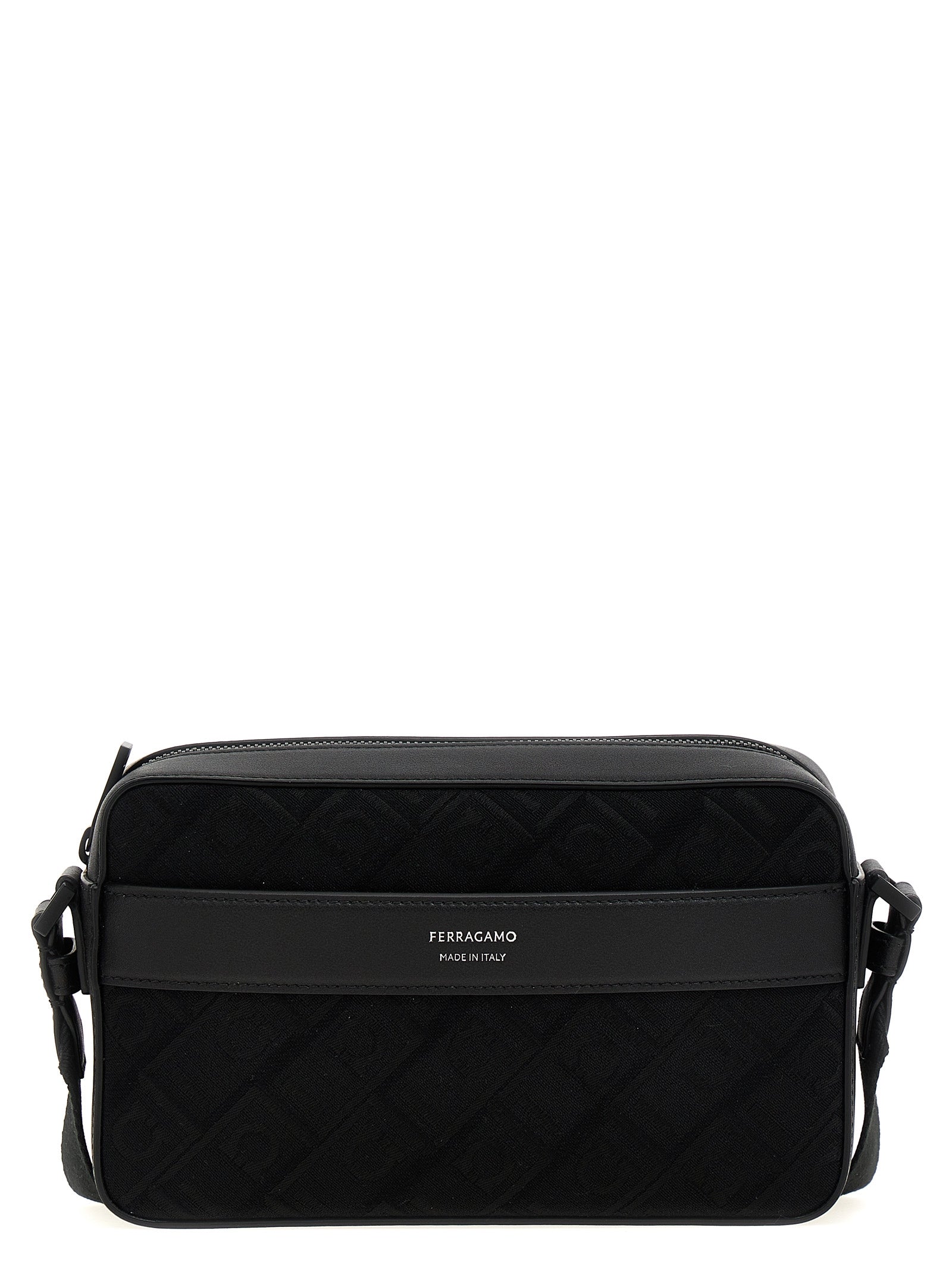 'Gancini' jacquard fabric and leather shoulder strap, front embossed logo, zip closure, adjustable shoulder strap.