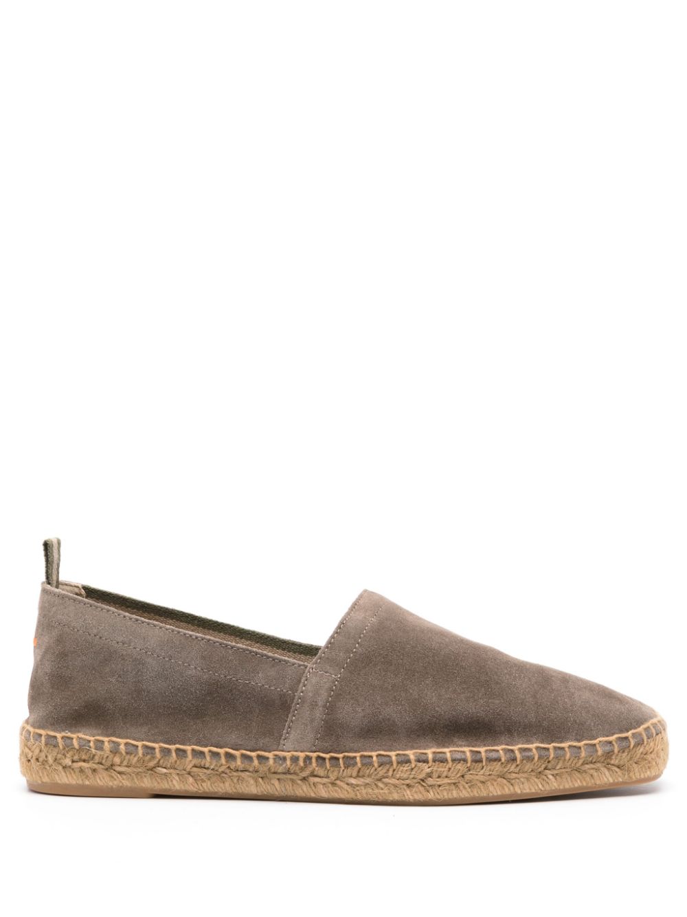 grey calf suede tonal stitching contrast stitching to the rear logo at the sole pull-tab at the heel almond toe segmented branded leather insole braided raffia sole rubber outsole slip-on style