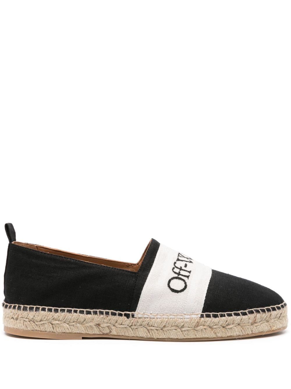 black/white/light beige linen/flax logo-embroidered stripe detail slip-on style round toe pull-tab at the heel leather lining branded insole jute-wrapped flat rubber sole This item contains at least 50% materials which are certified or widely recognised as having a lower environmental impact through production and/or manufacturing processes that reduce water consumption and the use of harmful chemicals, or re-use by-products of the production process. Learn more about what makes a product Conscious on our Conscious Criteria page