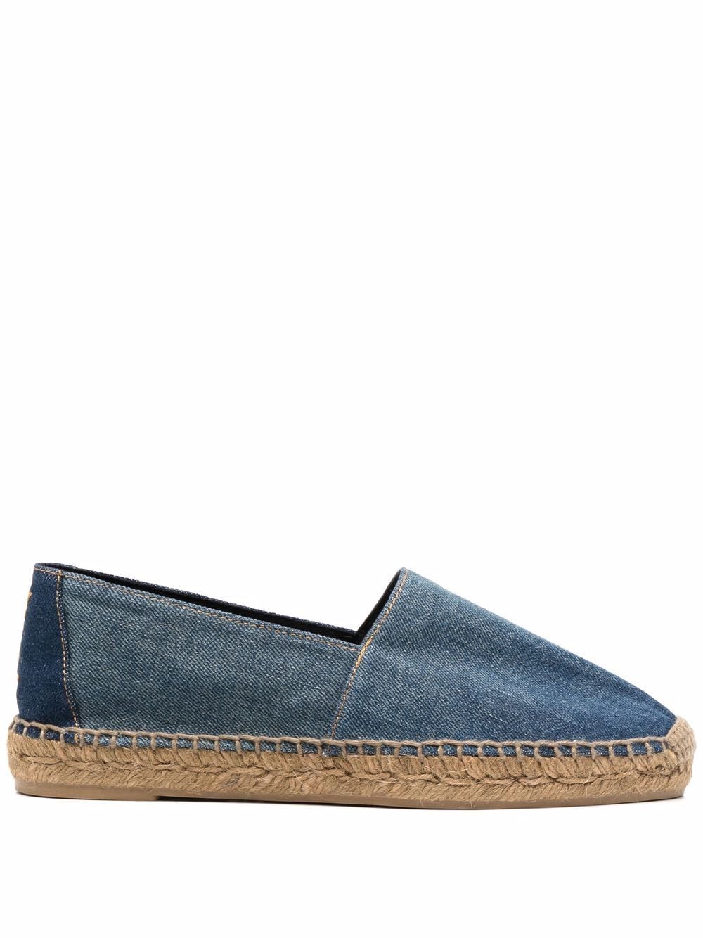 Dark blue logo-embroidered denim espadrilles from SAINT LAURENT featuring embroidered logo to the rear, branded leather insole, almond toe, slip-on style, jute sole and denim upper.