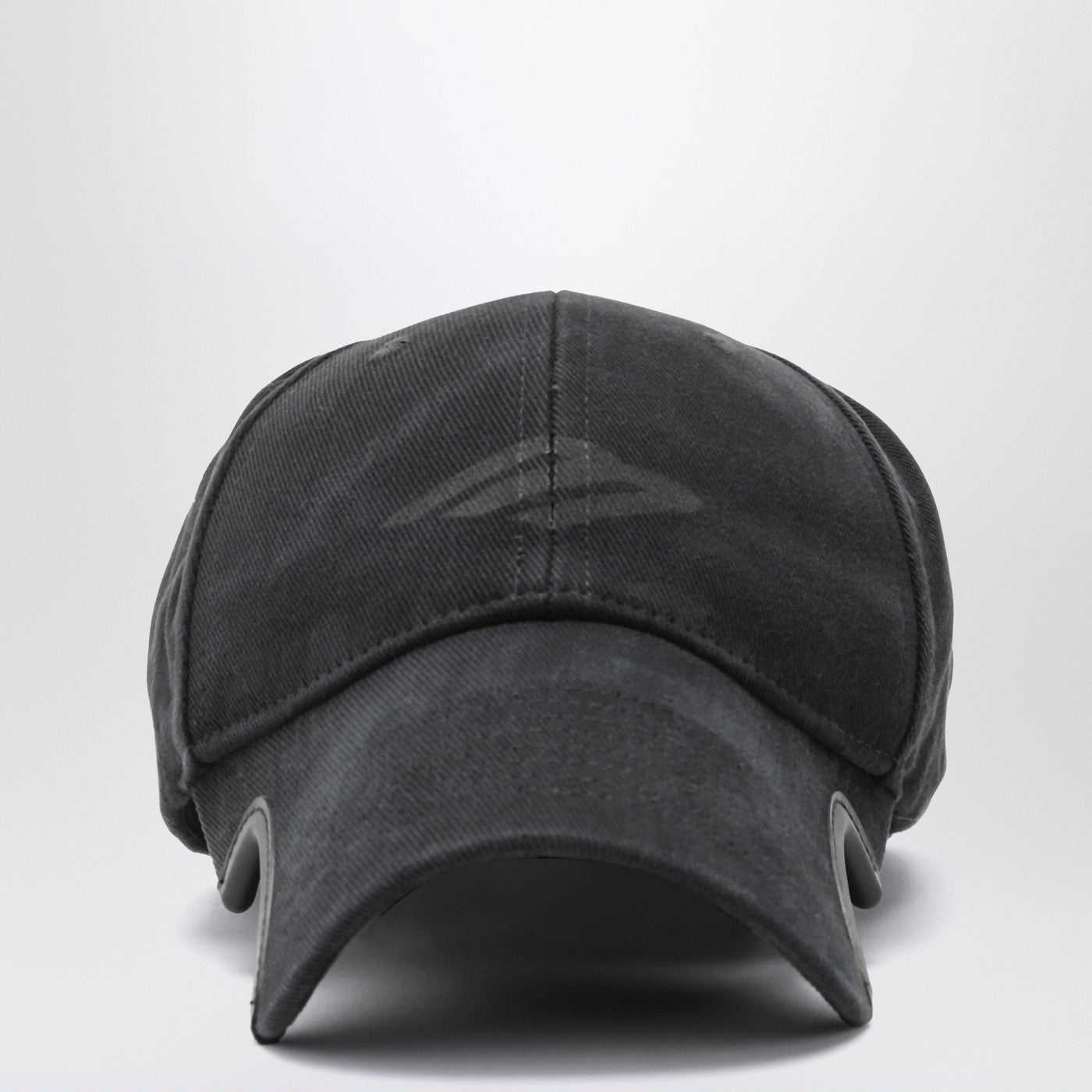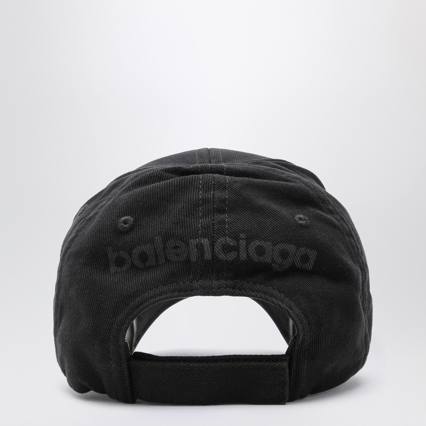 Black washed cotton visor hat by Balenciaga features a front logo, a visor with cut-out details and an adjustable fastening at the back.