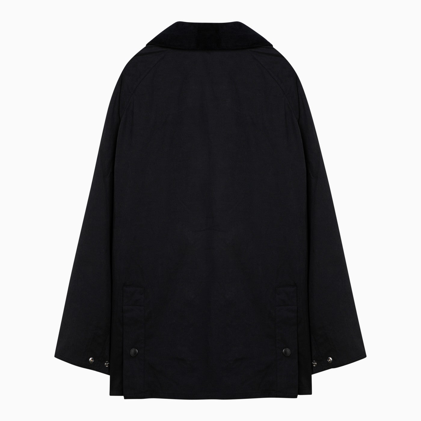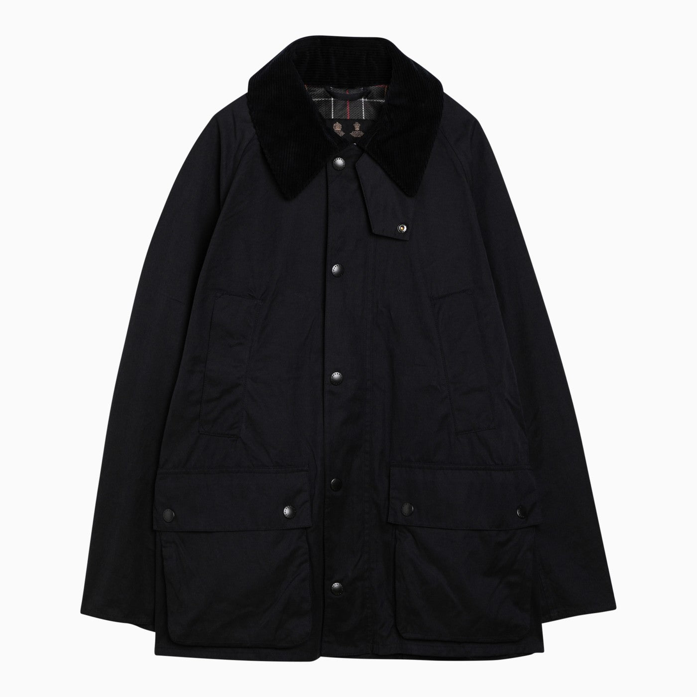 Bedale jacket by Barbour in waxed navy blue cotton, featuring a corduroy collar, front button placket, side welt pockets, front gusset pockets with flap and button and straight hem.