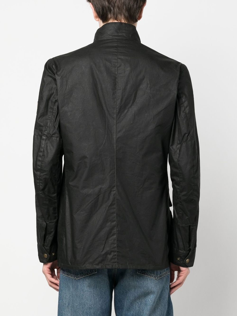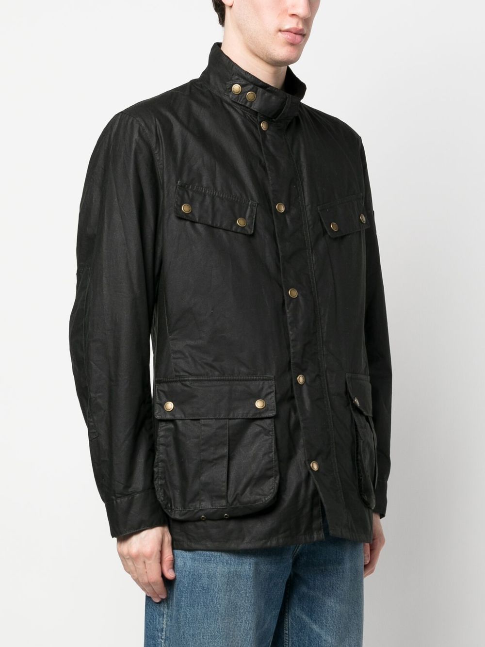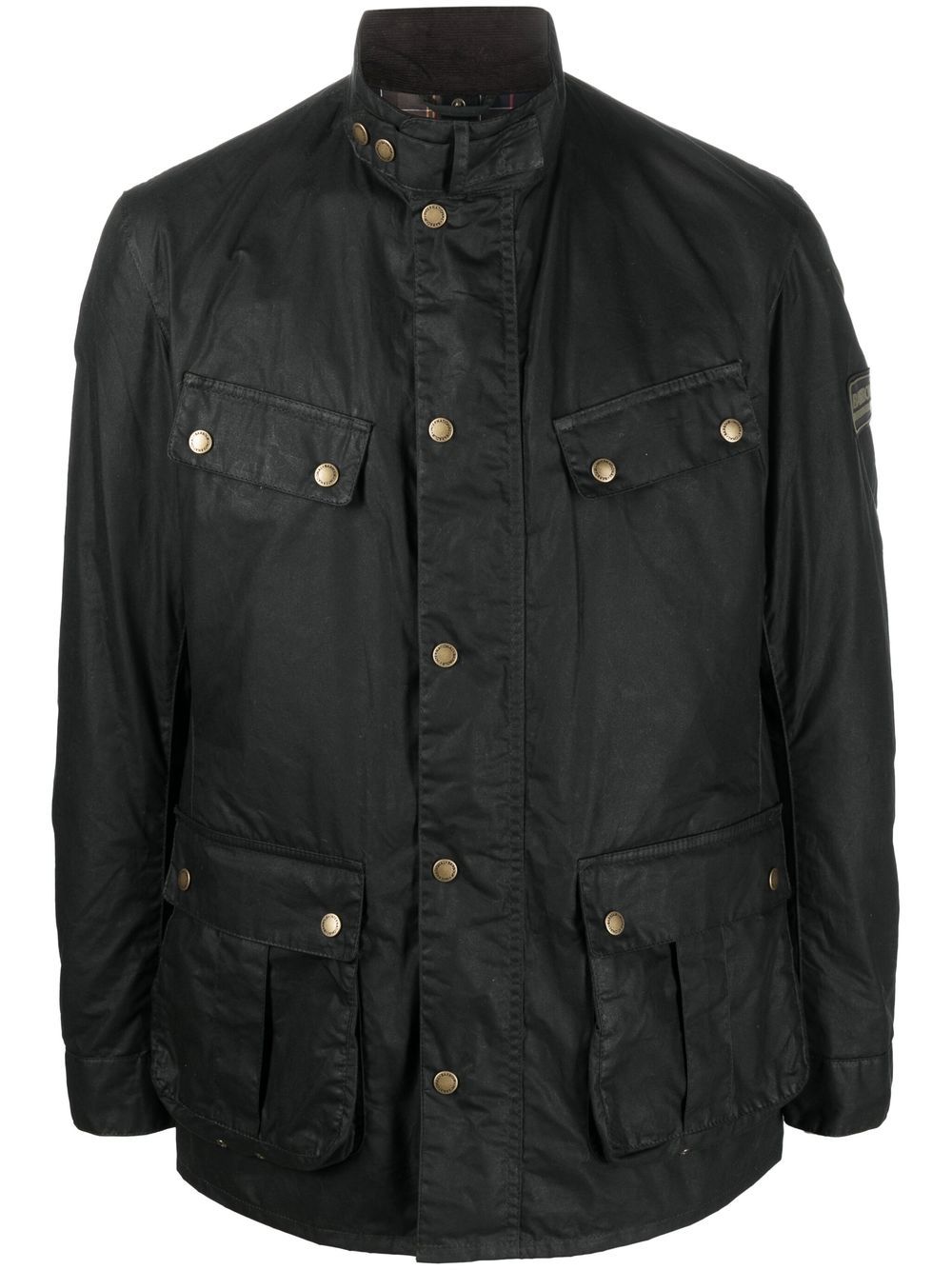 button-up jacket from BARBOUR featuring green, cotton, stand-up collar, front button fastening, two front flap pockets, two chest flap pockets and buttoned cuffs.