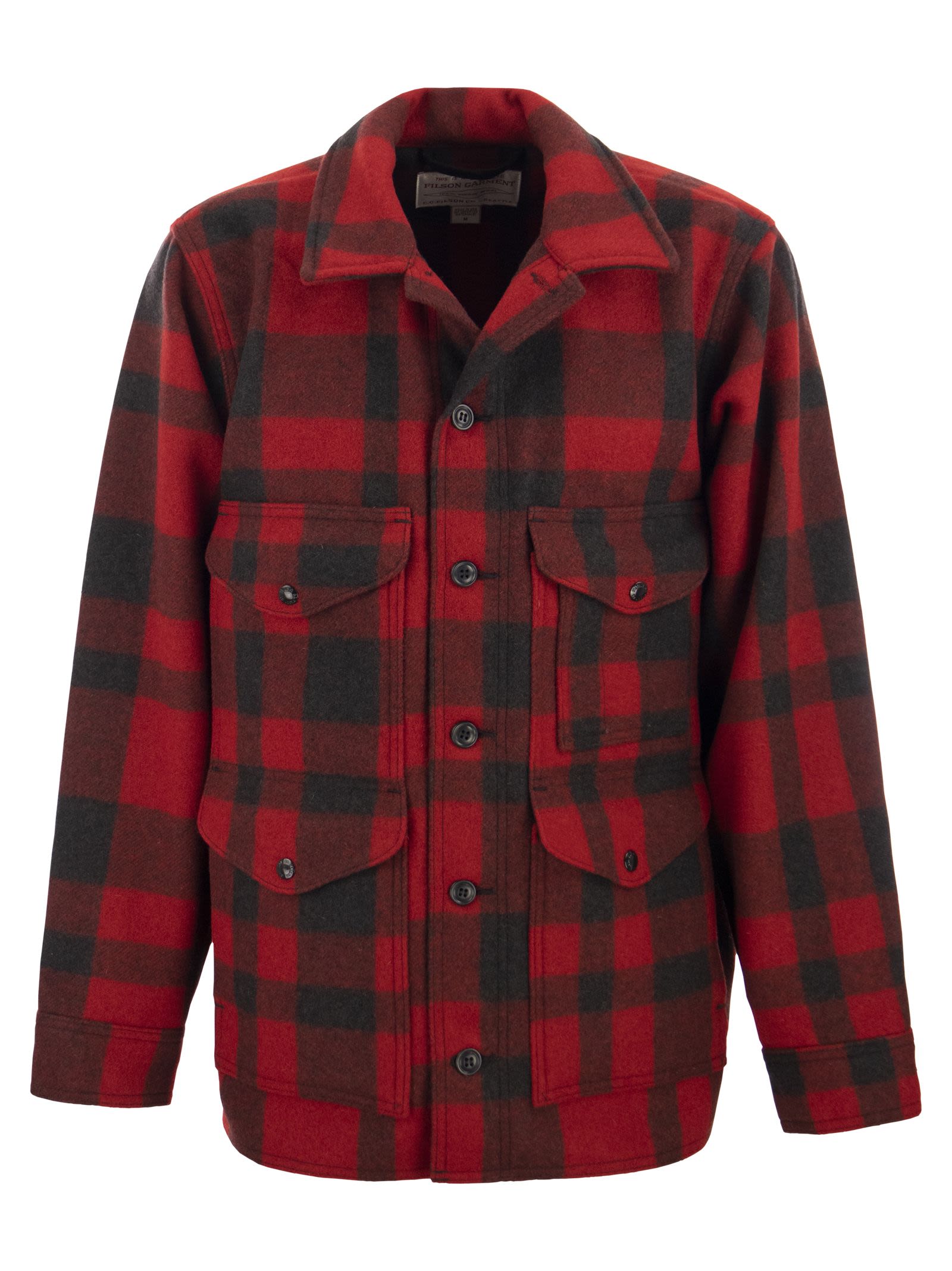 The Mackinaw Wool Cruiser is the most versatile cold weather protection you will find: when you want to wear one jacket, no matter how the weather changes, nothing works better. The extremely durable wool, sourced from Oregon's Pendleton Woollen Mills, has an extraordinarily dense weave that resists wind while remaining breathable. Mackinaw wool insulates perfectly in both wet and dry conditions: thanks to its complex fibre structure, it can absorb water up to 30% of its own weight without feeling wet or sticky. With the four flap pockets with snap fasteners at the front and a large map/card pocket covering the entire back, two layers of wool cover most of the torso, just where you need more protection. - Classic multi-pocket cruiser - Naturally water-repellent fabric is breathable and windproof - 4 flap pockets with snap fastener, slit pocket, 2 pockets with side hand entry, inside breast pocket and full-width back pocket - Front button closure; adjustable cuffs with buttons DESIGNER ID: FMCPS0015 W0253 645