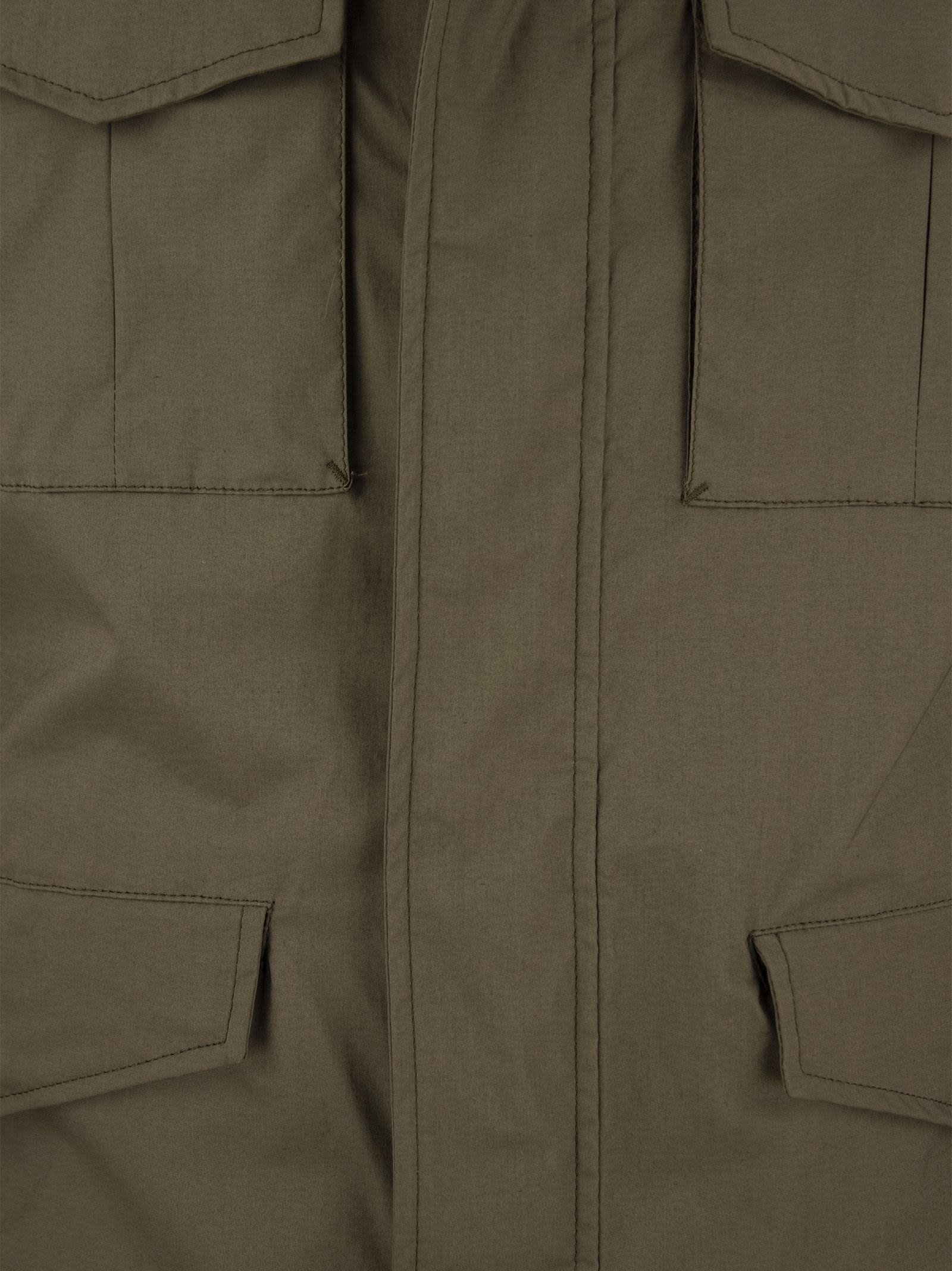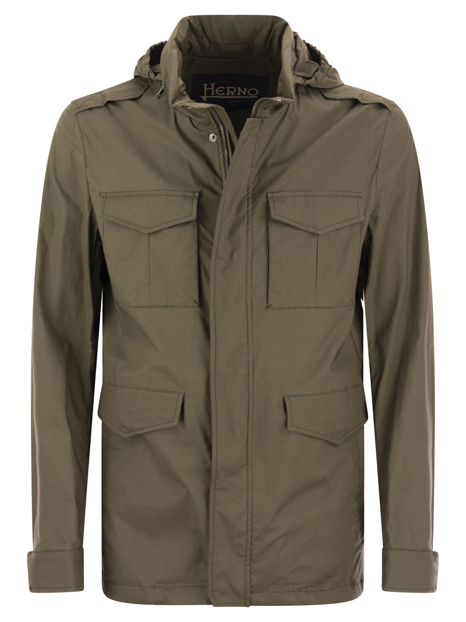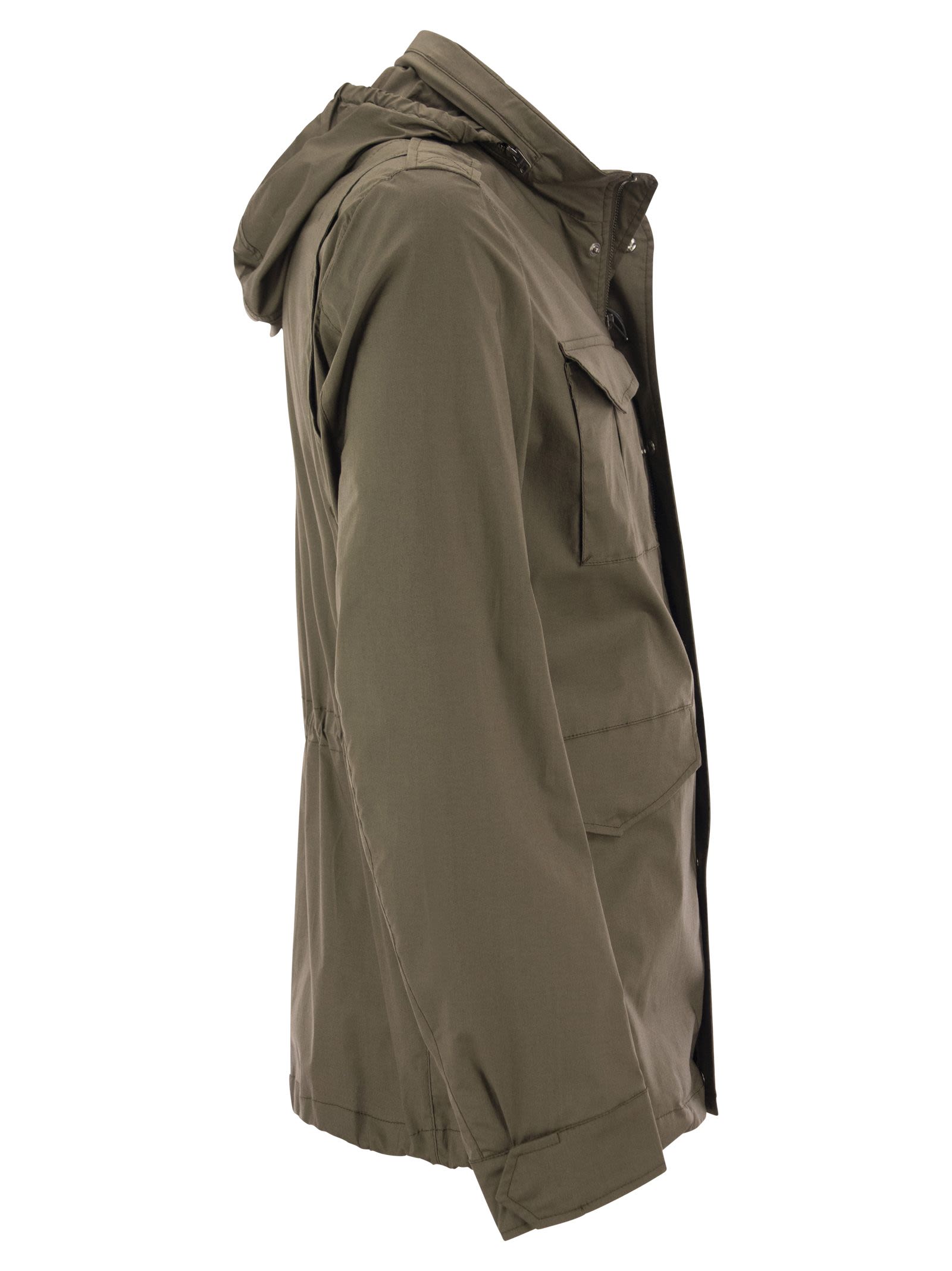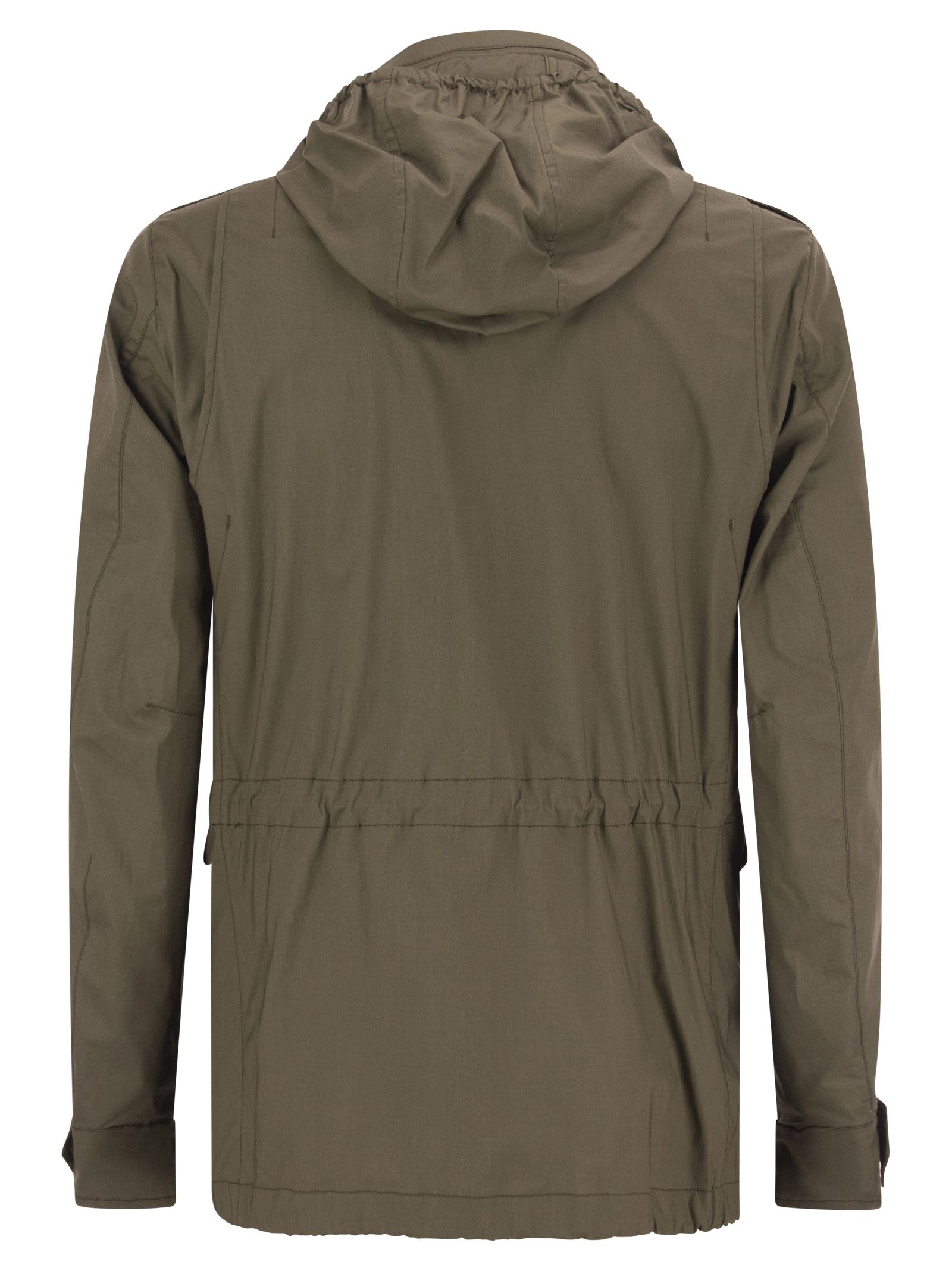Field Jacket made of dyed stretch cotton, waterproofed and treated to create a light ruffled effect. The model reinterprets an outdoor clothing icon in a refined key and adds the smart detail of a service hood, useful in case of sudden rain. - Regular fit - Packable hood - Long sleeves - Covered zip and press stud closure - Bellows pockets with flap - Flap pockets - Adjustable cuffs - Made in Italy DESIGNER ID: FI000098U 13164 7730