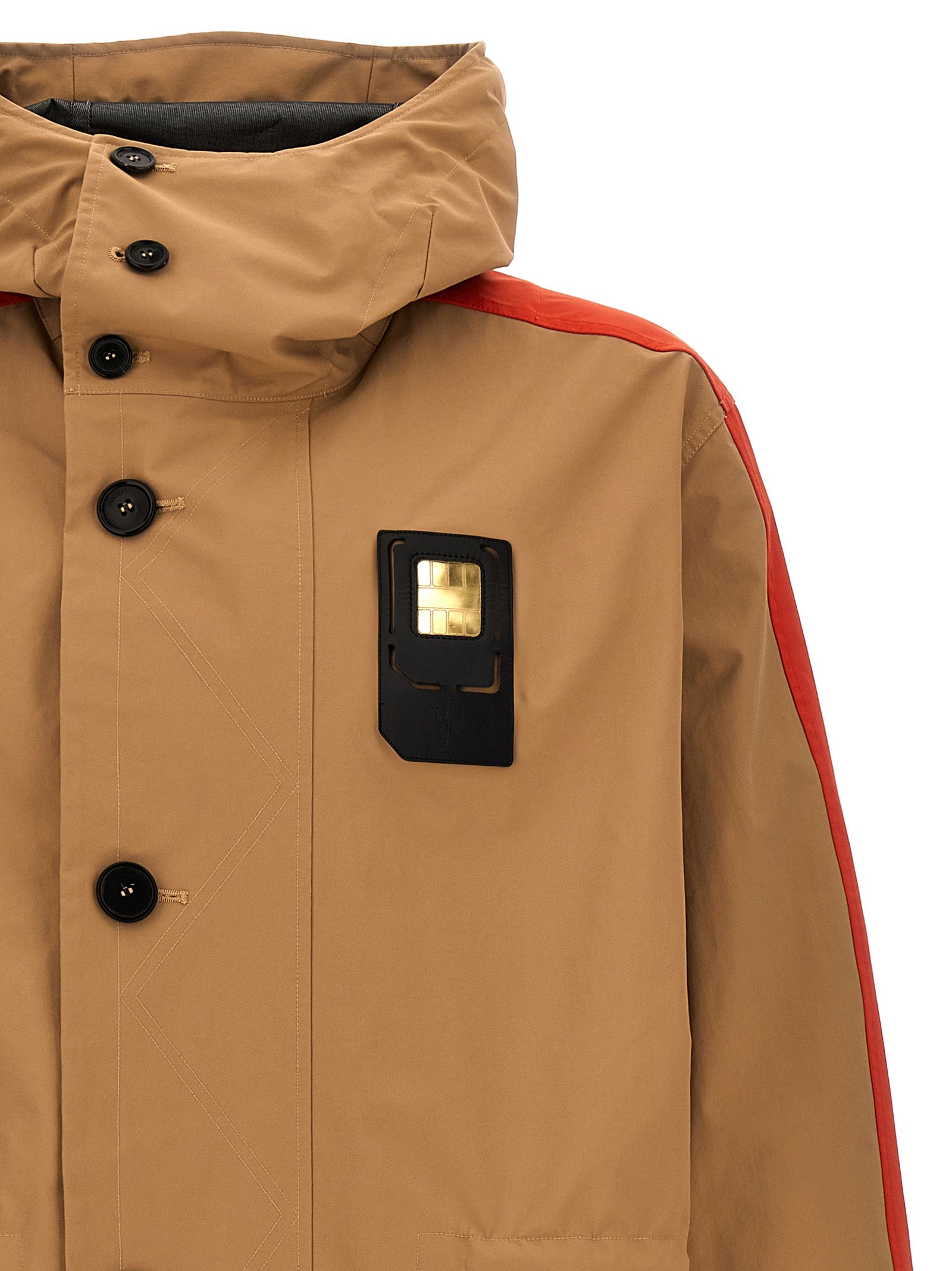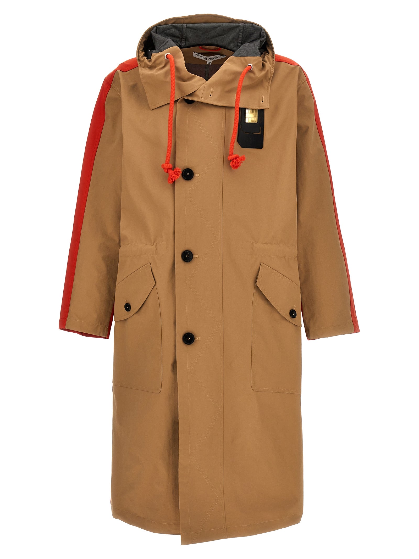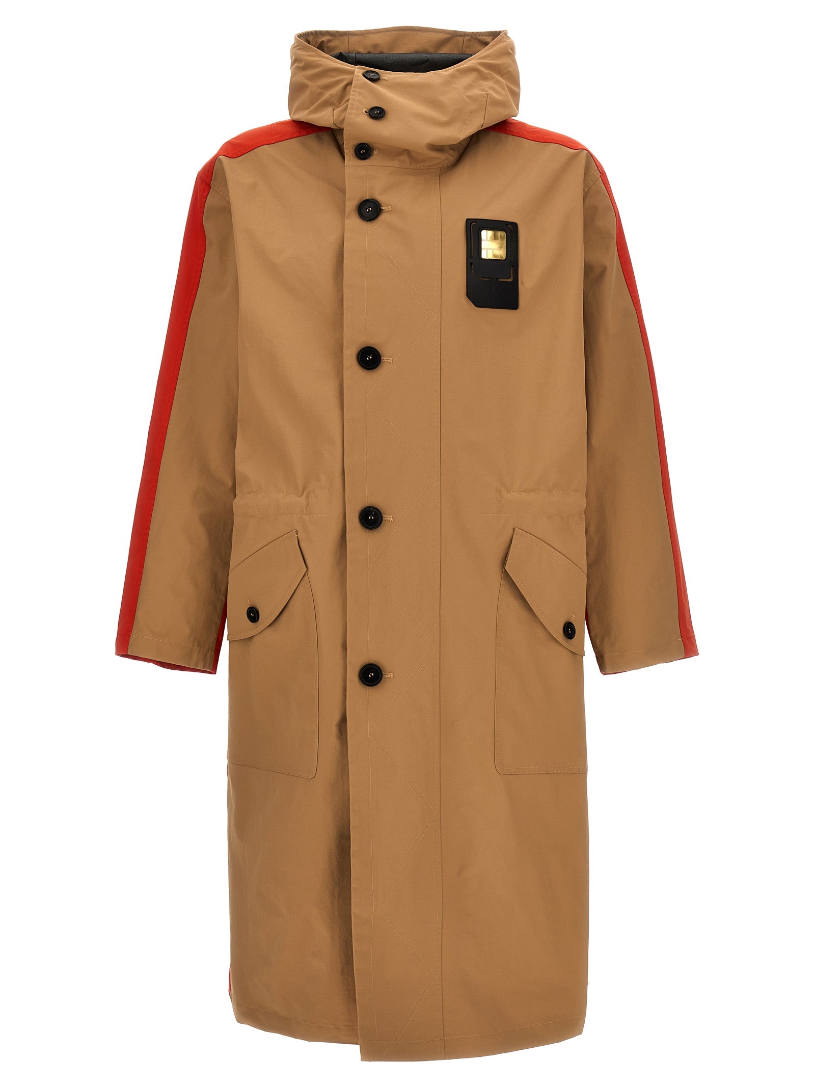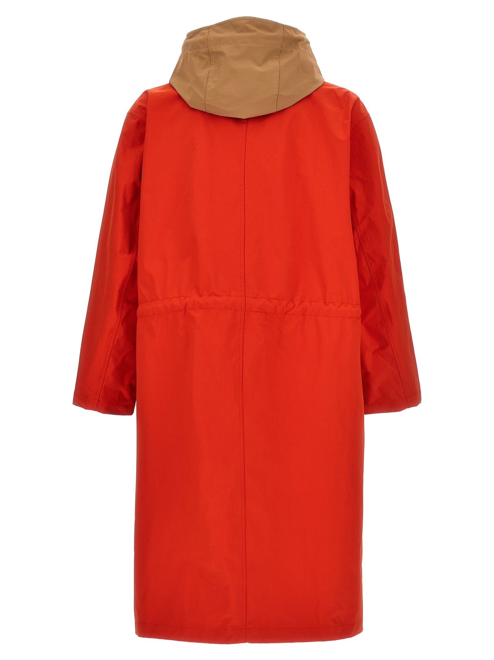 Oversize long nylon parka with button closure, hood and drawstring at the waist.