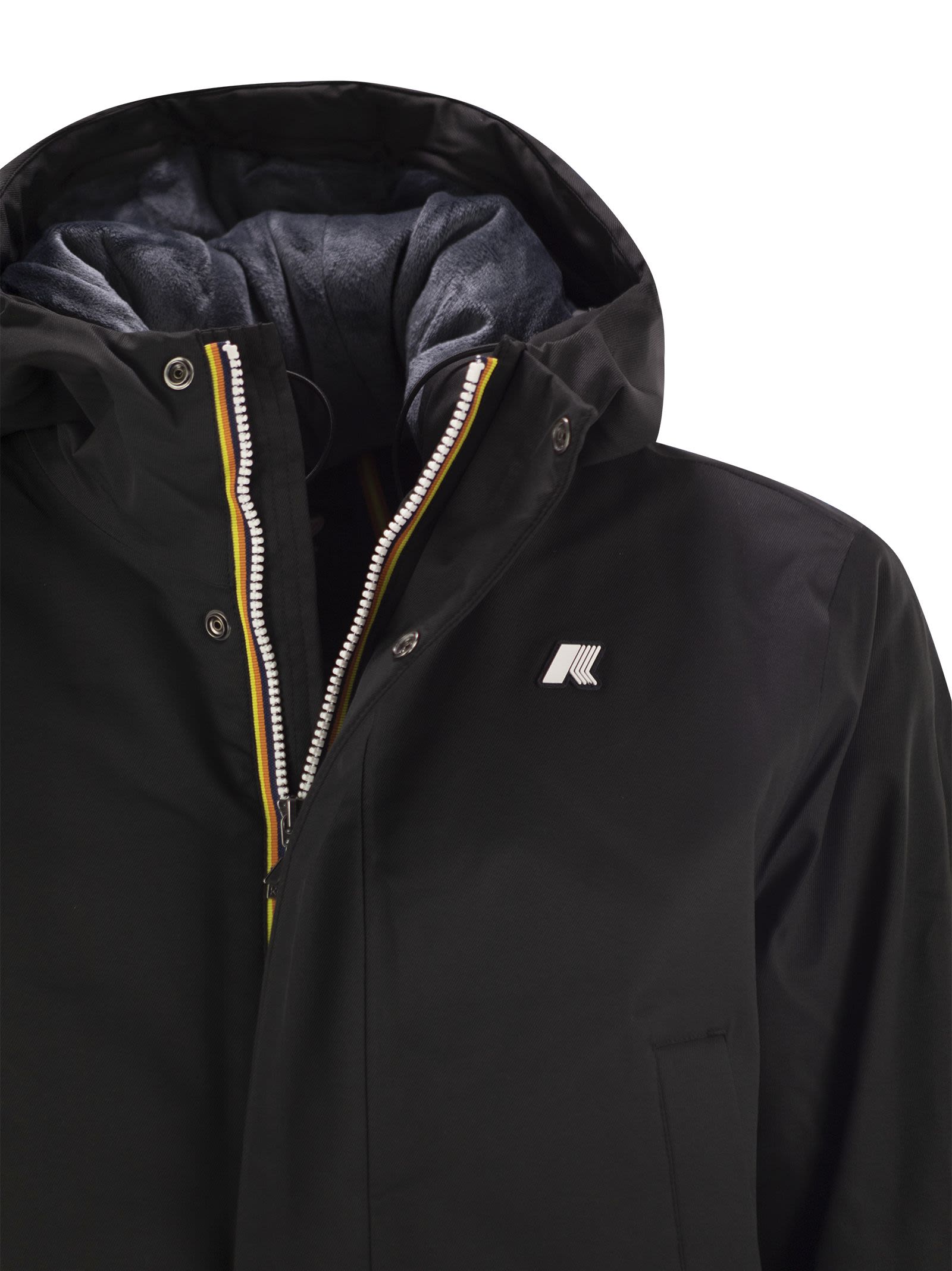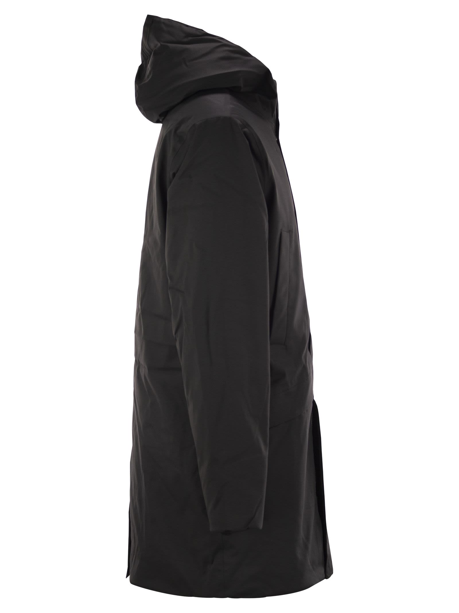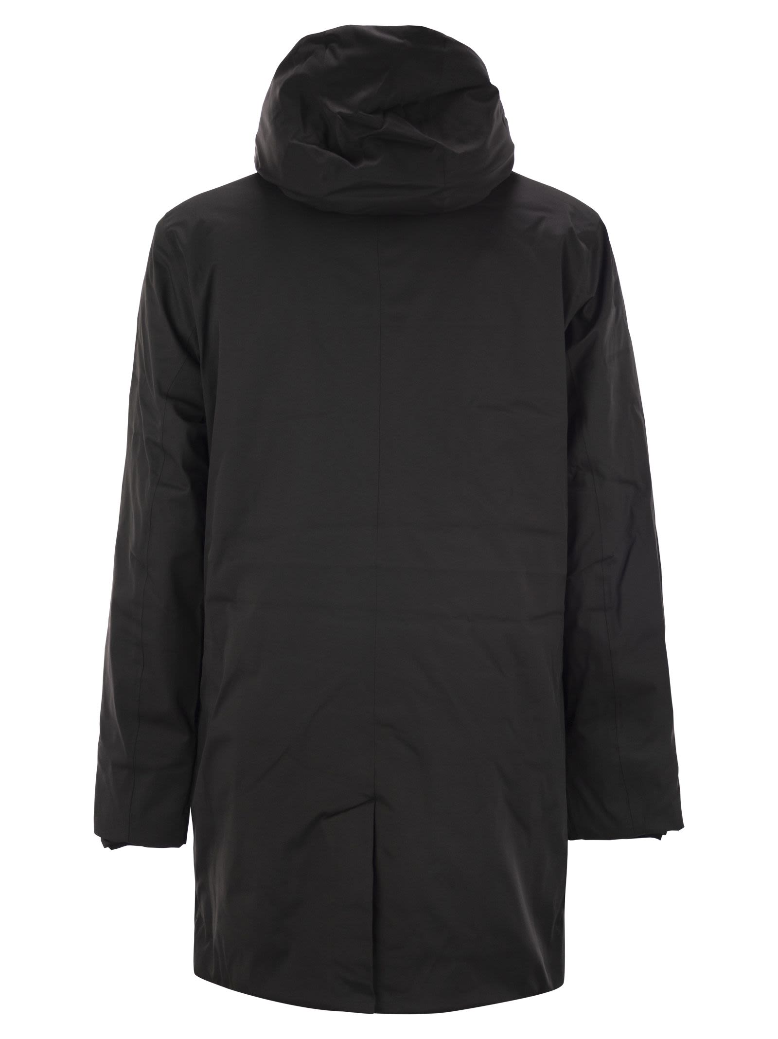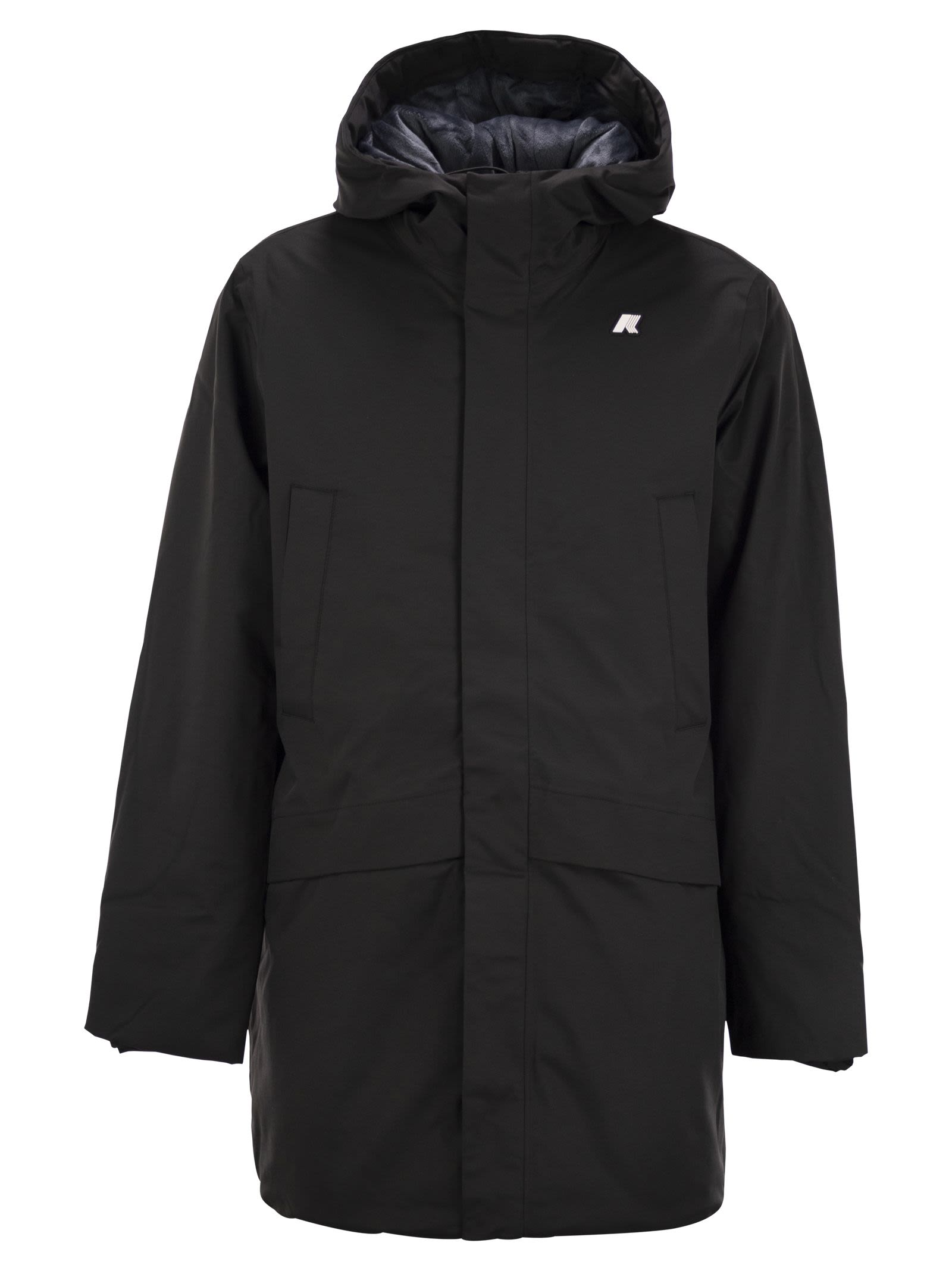 Jarno is a three-quarter length men's jacket, designed to withstand rain and offer good protection in autumn and the early winter months. The model has an essential, city-ready silhouette with a regular fit, adjustable hood and numerous pockets, and is made of water- and wind-resistant polyester twill. The filling made of PrimaLoft, a fibre derived from recycled polyester and highly insulating, ensures a medium degree of warmth with minimal bulk and quick drying. The classic soft fabric lining has been updated to ensure an even more pleasant feel against the skin. - Waterproof, water-repellent, windproof polyester twill fabric - Soft fabric lining - Light weight wadding - Medium degree of warmth - Taped seams - Non-detachable hood adjustable with elastic cord and cord stopper - Zip fastener covered by flap - Cuffs with inner gaiter - 2 hand-warming pockets on chest - 2 flap pockets with snap fasteners - Regular fit - Logo applied in white silicone DESIGNER ID: K8133FW AL8