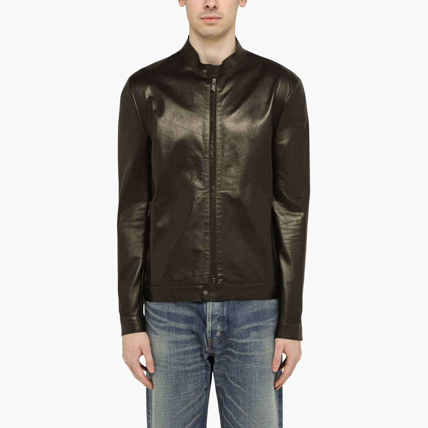 Black smooth leather Salvatore Santoro slim jacket, featuring a zip fastening, long sleeves and two zipped pockets on the front.