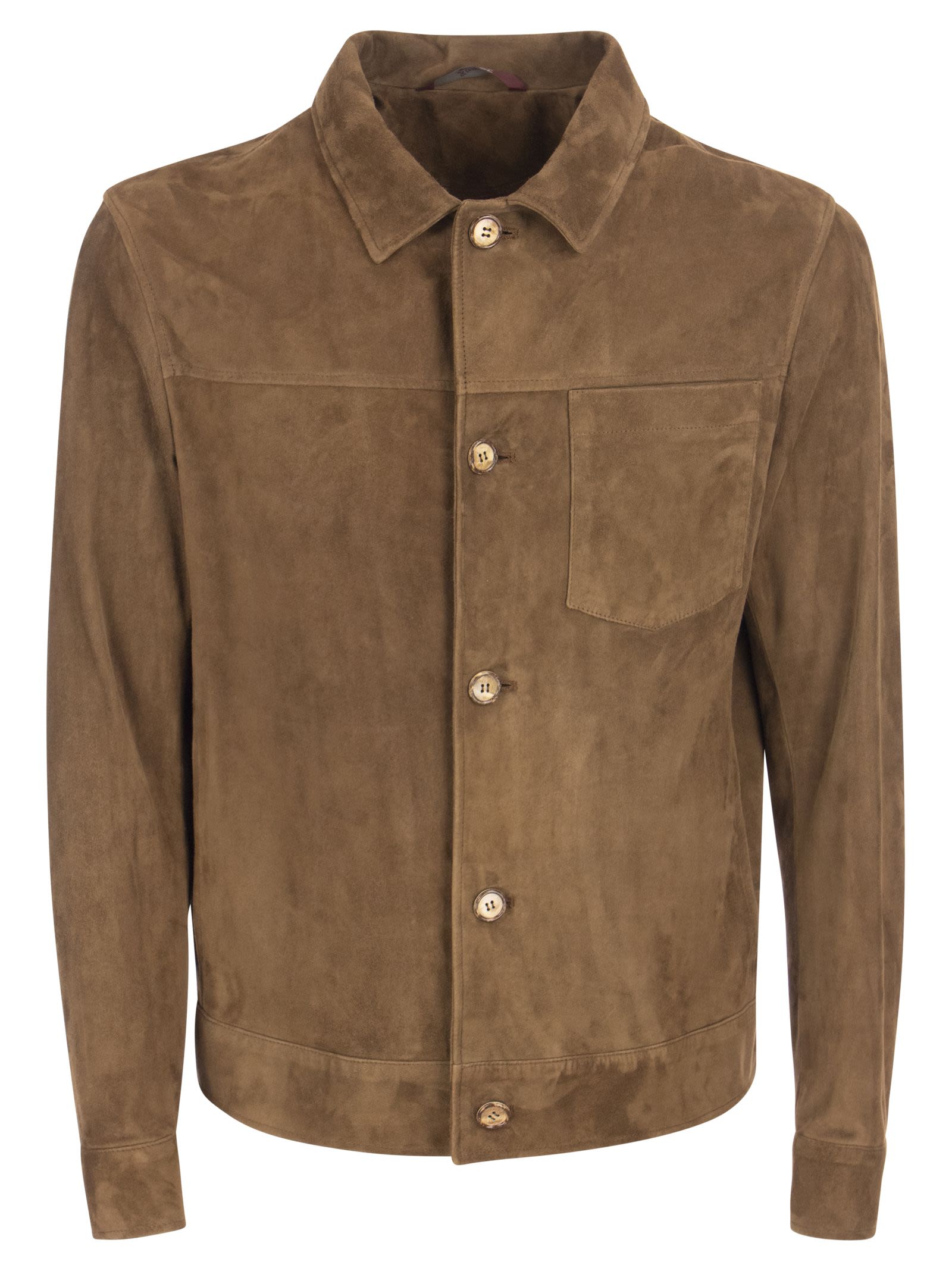 A jacket made entirely in Italy, in genuine leather, by highly talented craftsmen with many years of experience. The KARACHI model in suede, is unlined and features a button fastening and shirt collar. - patch pocket on the chest - two welt pockets - buttons at cuffs DESIGNER ID: GSKUG03SSNVENZF000MU