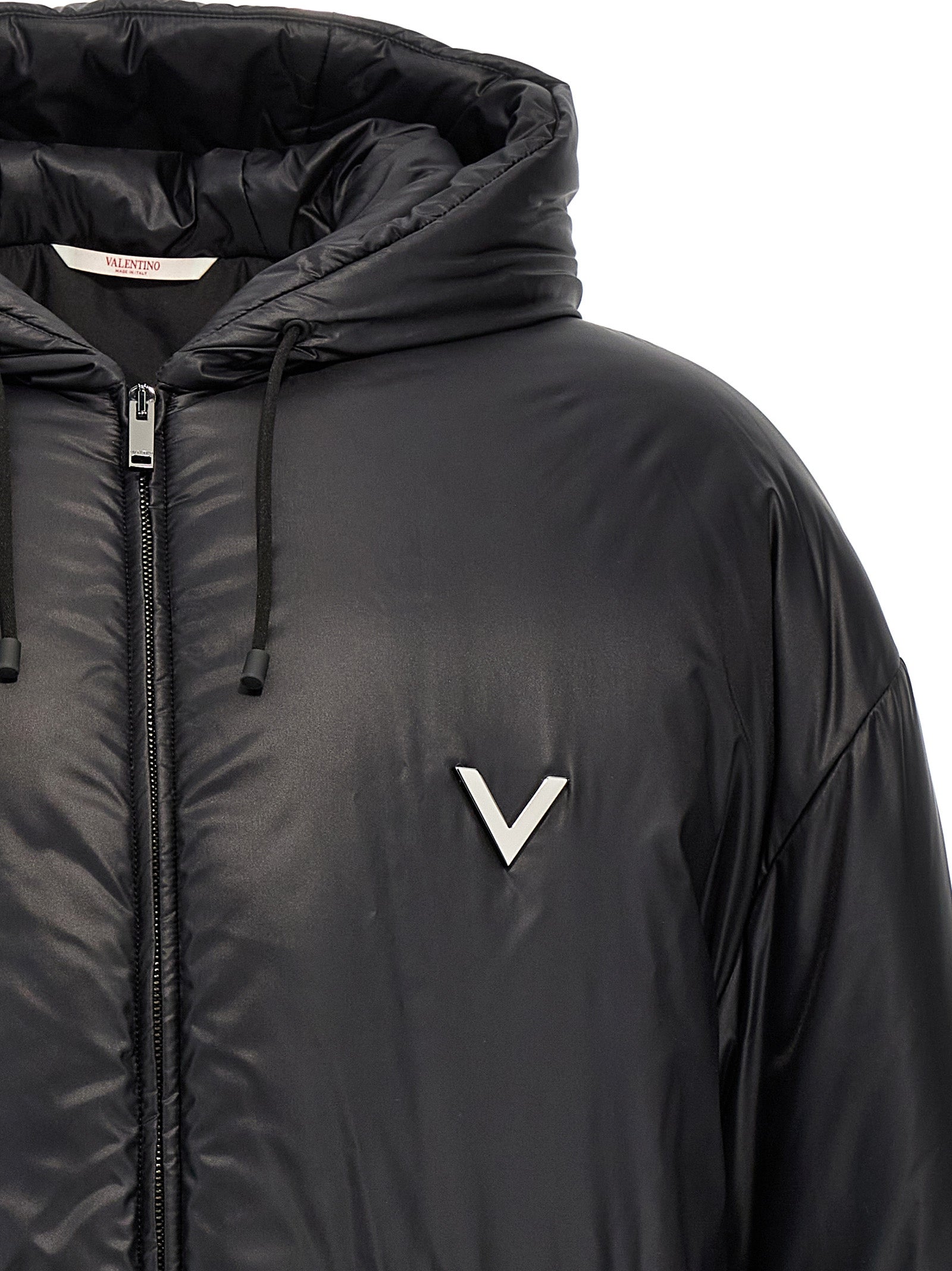 Padded nylon down jacket, front metal 'V Detail' application, hood, zip closure, pockets, long sleeves.