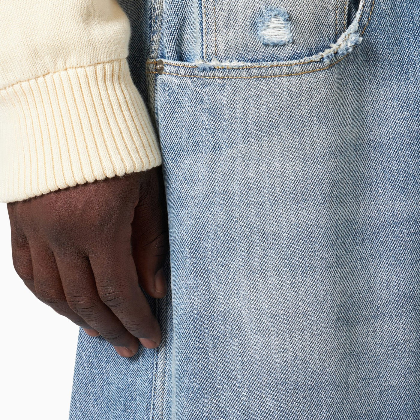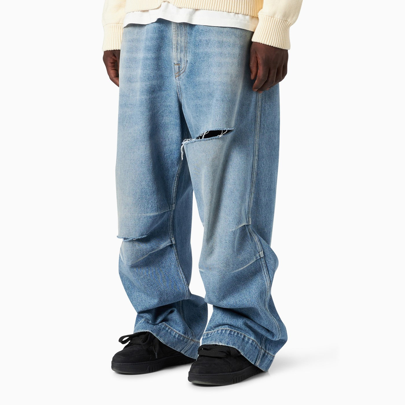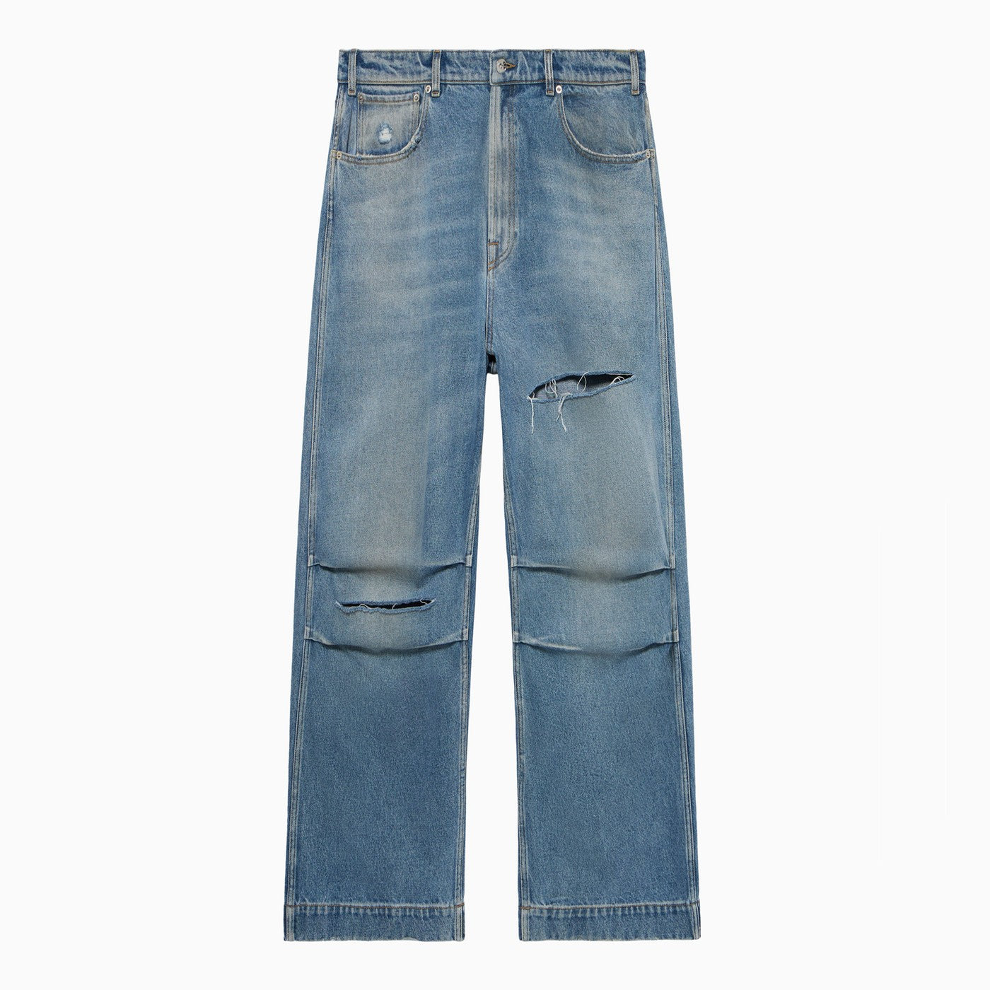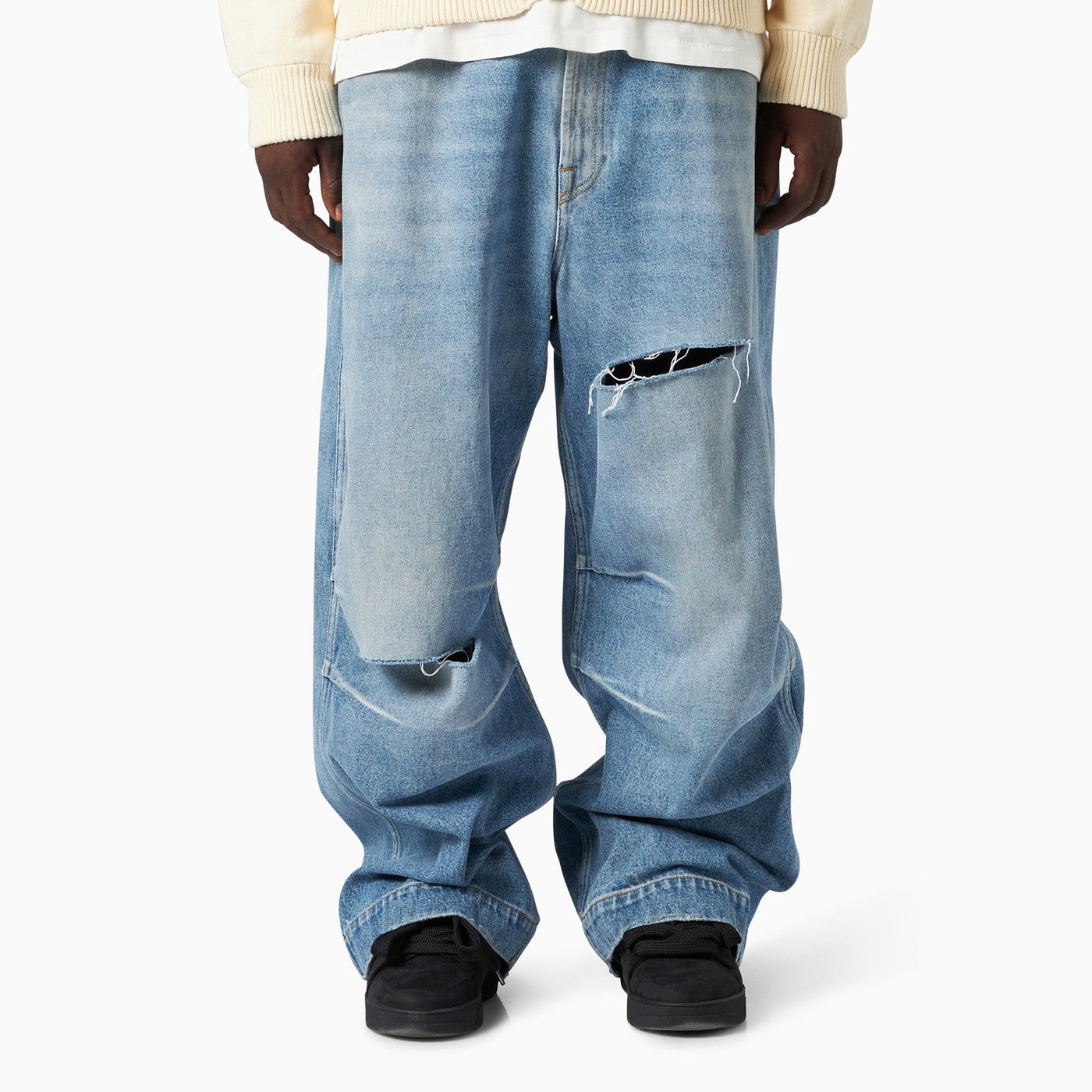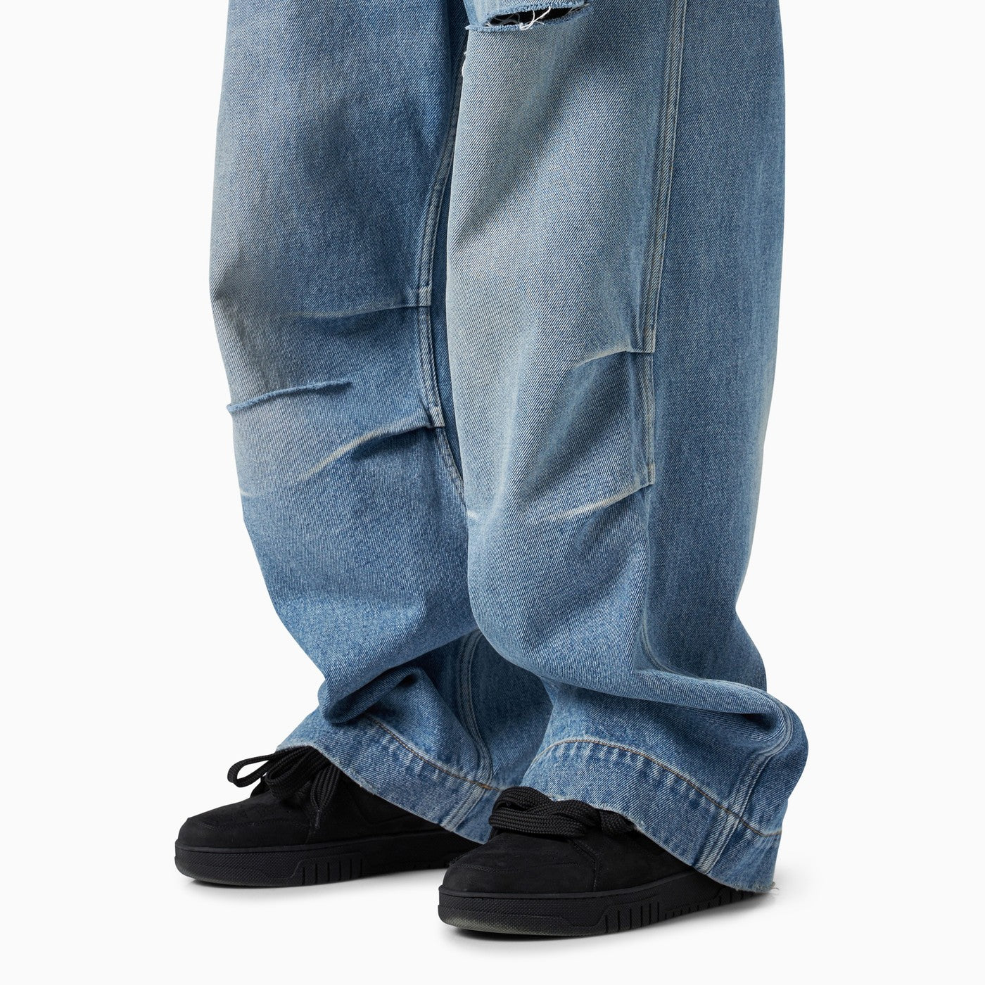 Wide leg cotton denim jeans by 1989 Studio featuring 5 pocket design, distressed details and knee darts to mantain leg shape