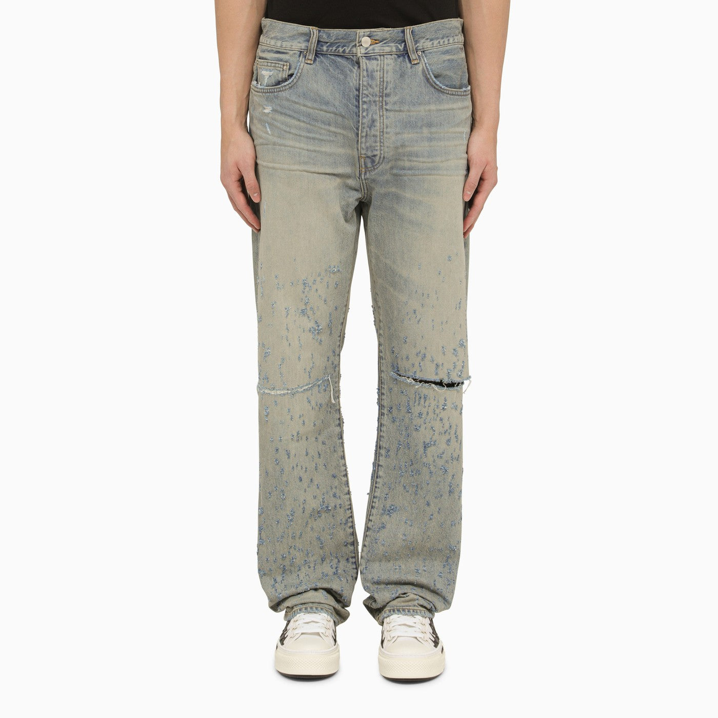 Jeans by Amiri in antique indigo cotton denim featuring allover rips, belt loops, a front zip and button fastening, five pockets and a logo label on the back.