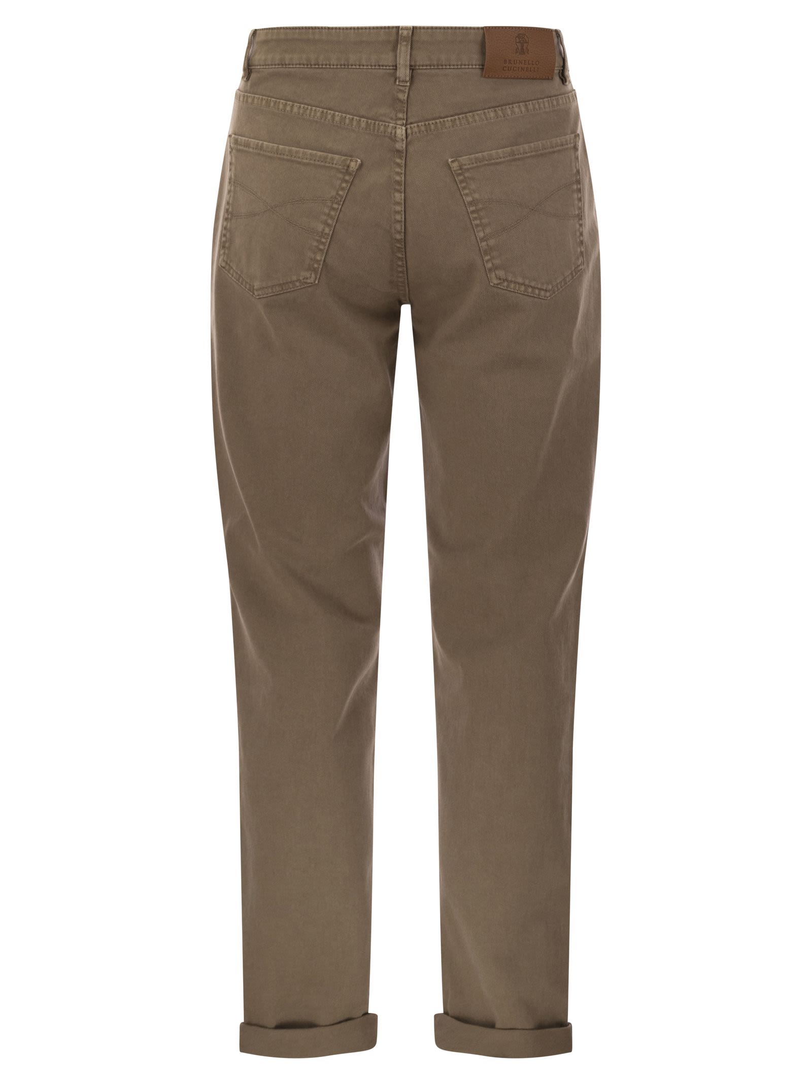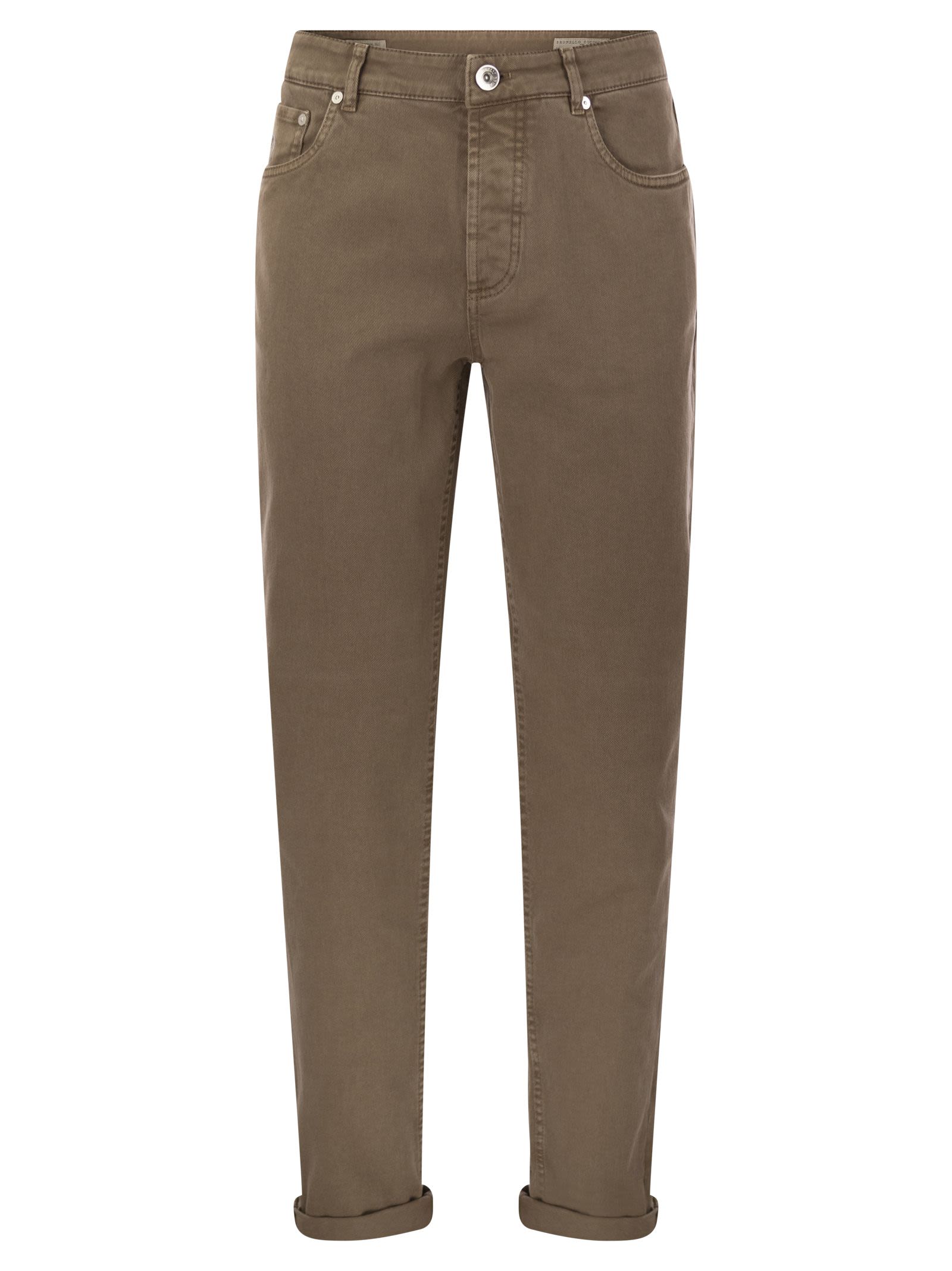 Seasonal nuances enrich the iconic style of the five-pocket trousers in garment-dyed denim, characterised by a pleasantly light and comfortable texture. The traditional fit expresses the most classic Brunello Cucinelli taste and features regular lines all along the leg. - Traditional fit: the fit is characterised by regular volumes on the pelvis and straight lines along the leg - Metal button fastening - Front pockets with breast pocket - Patch back pockets - Hem 18 cm DESIGNER ID: M277PD3210 C7403