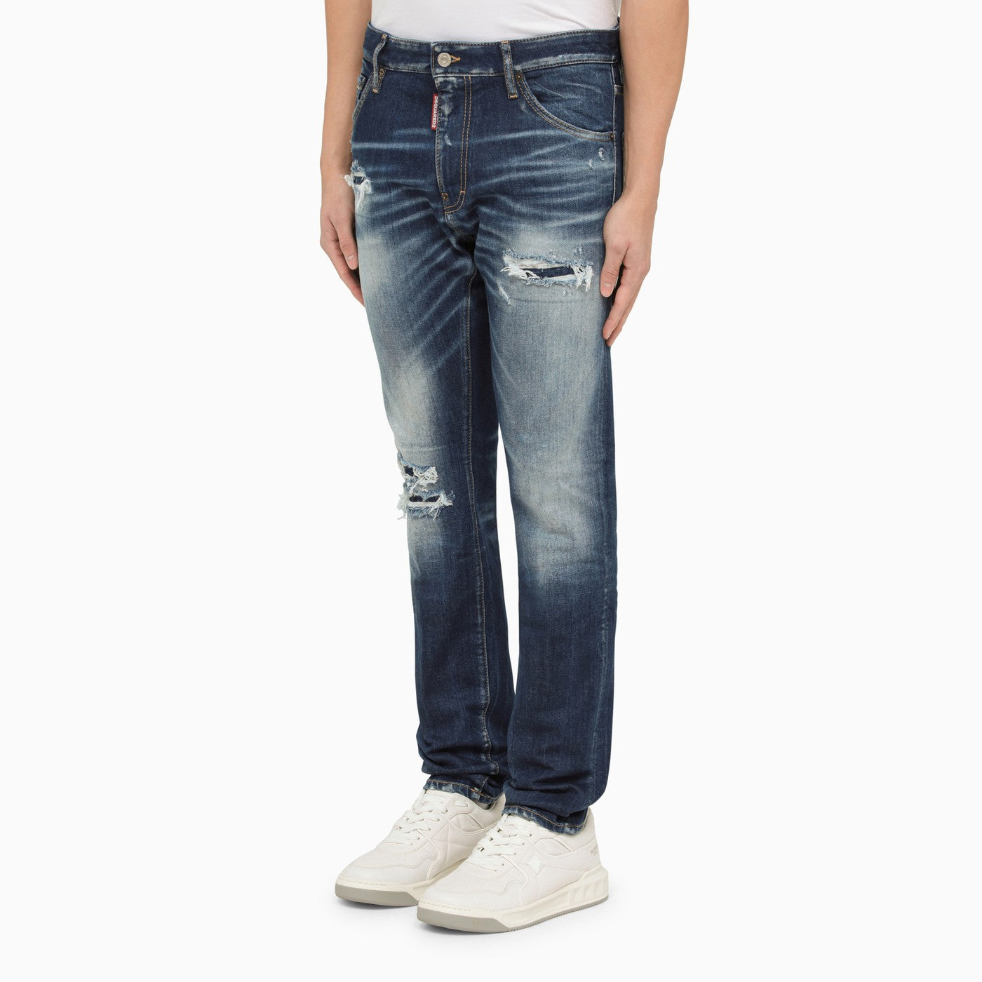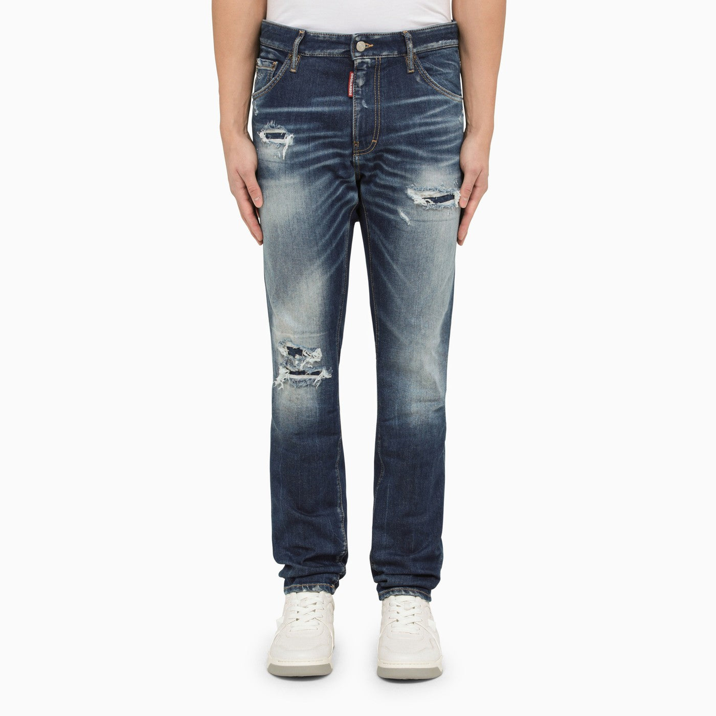 Washed-out blue cotton denim jeans from Dsquared2 featuring a button and zip front fastening, belt loops, two back pockets and three front pockets, localised wear, a logo patch on the back and a stitched logo plaque on the front.