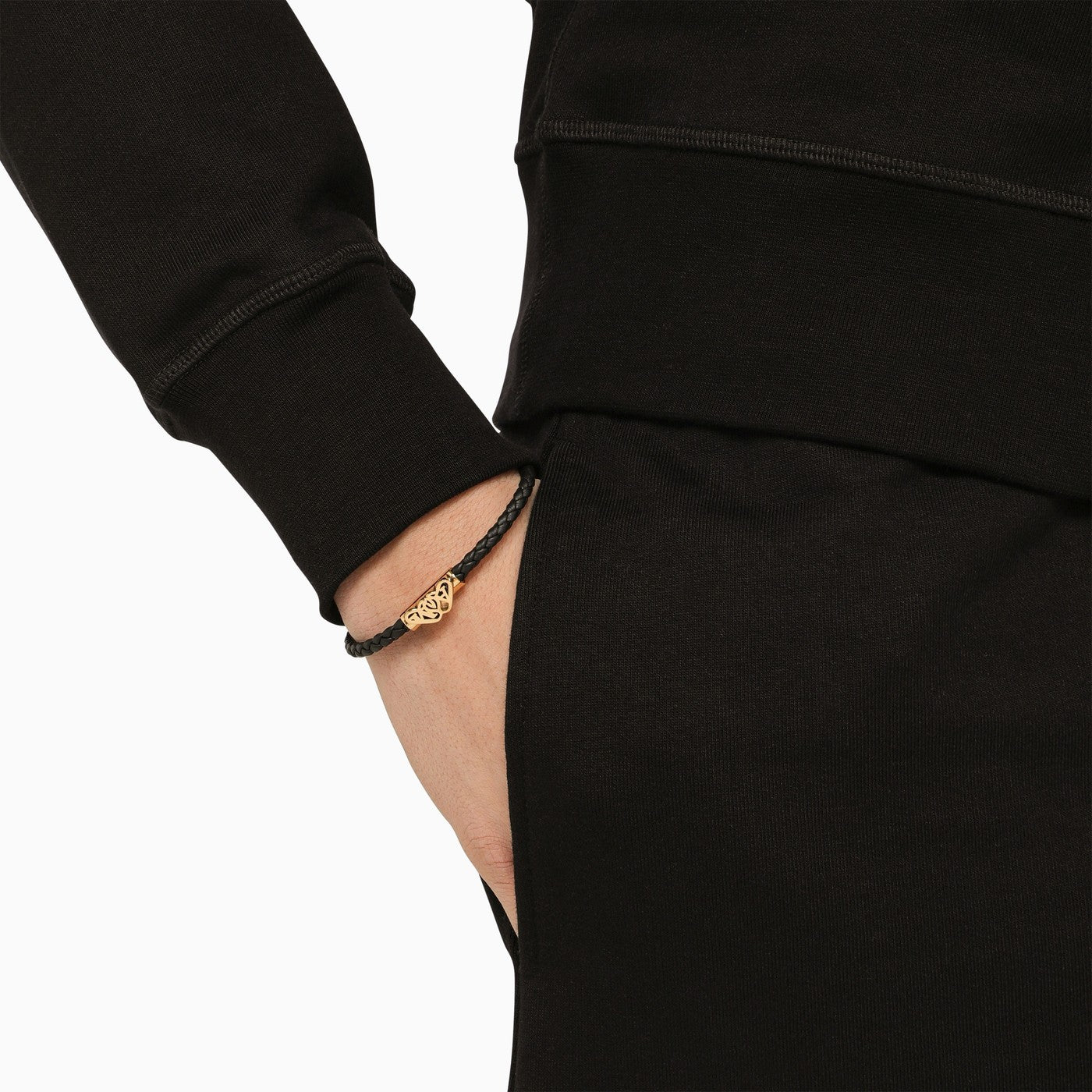 Black woven leather bracelet by Alexander McQueen featuring a magnetic logo fastening and gold-plated hardware.