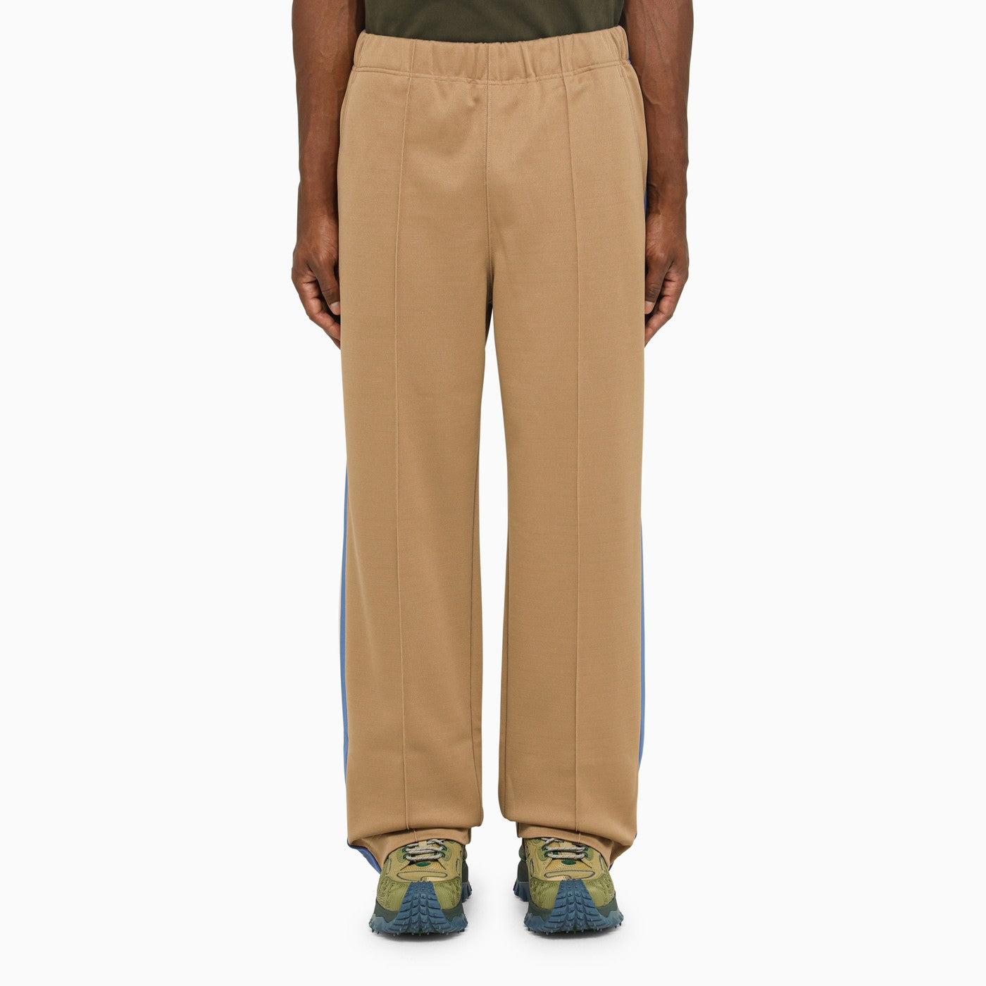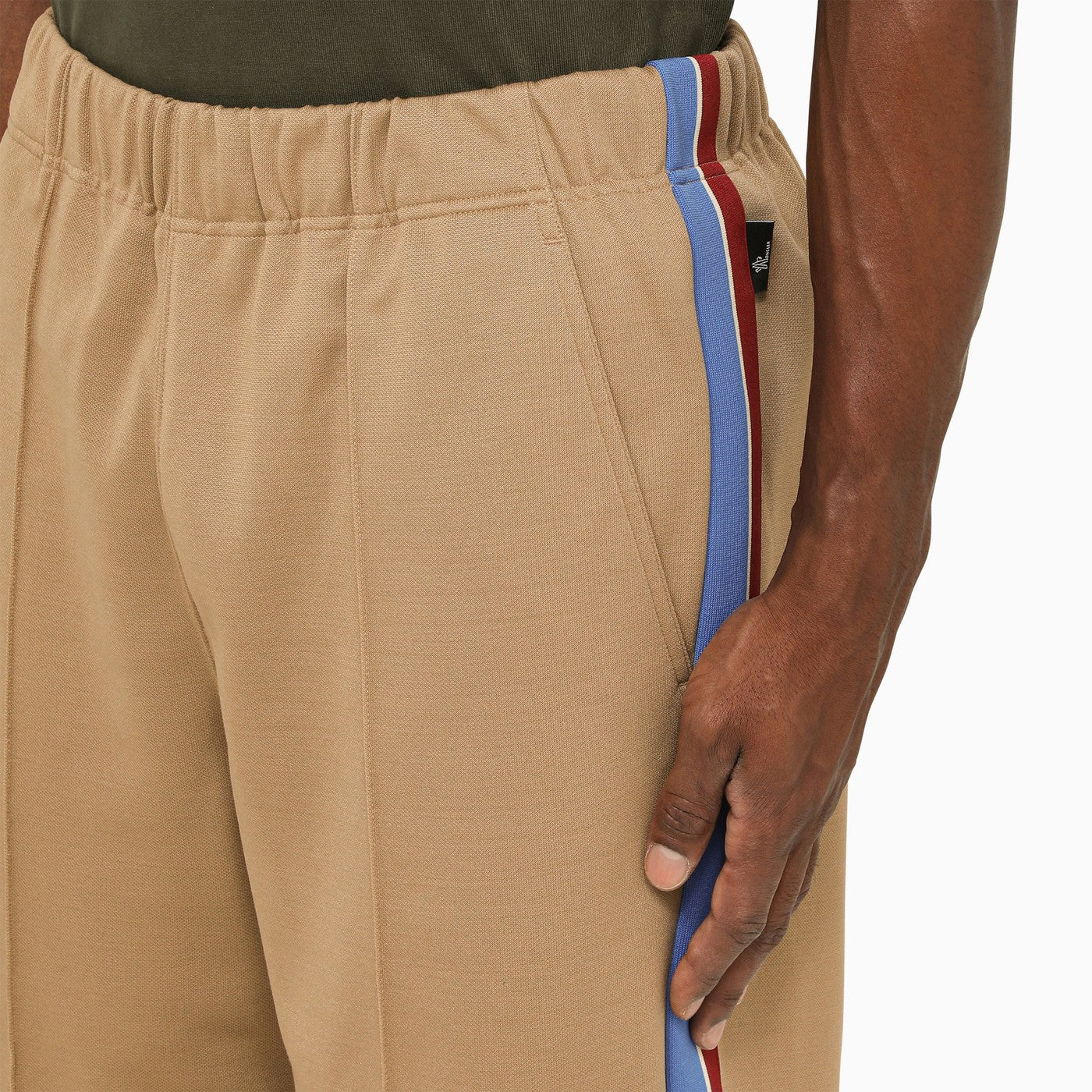 Trousers by Moncler in beige cotton blend, featuring a straight-leg design, an elasticated waistband, side welt pockets and a blue and red striped side band.