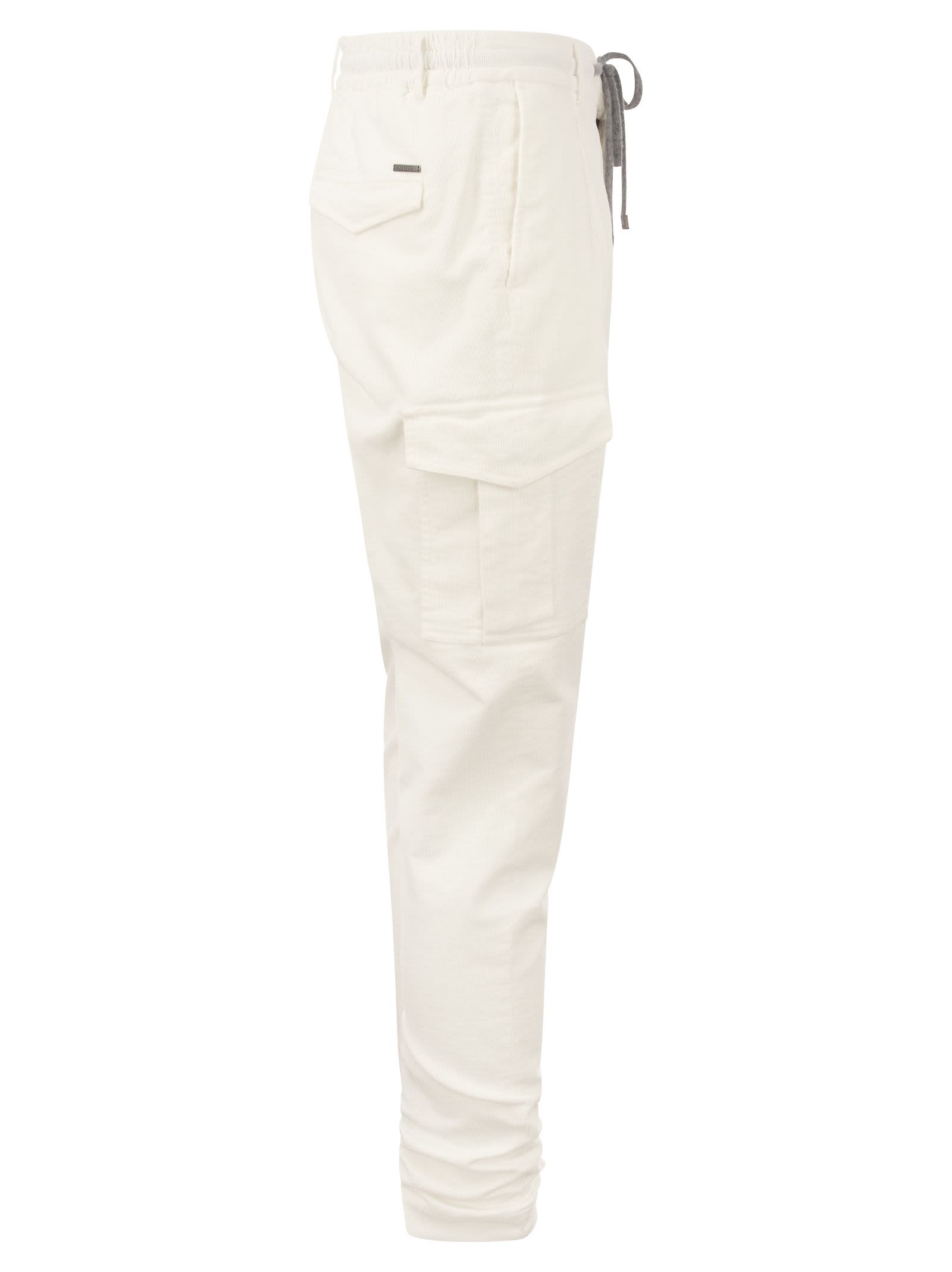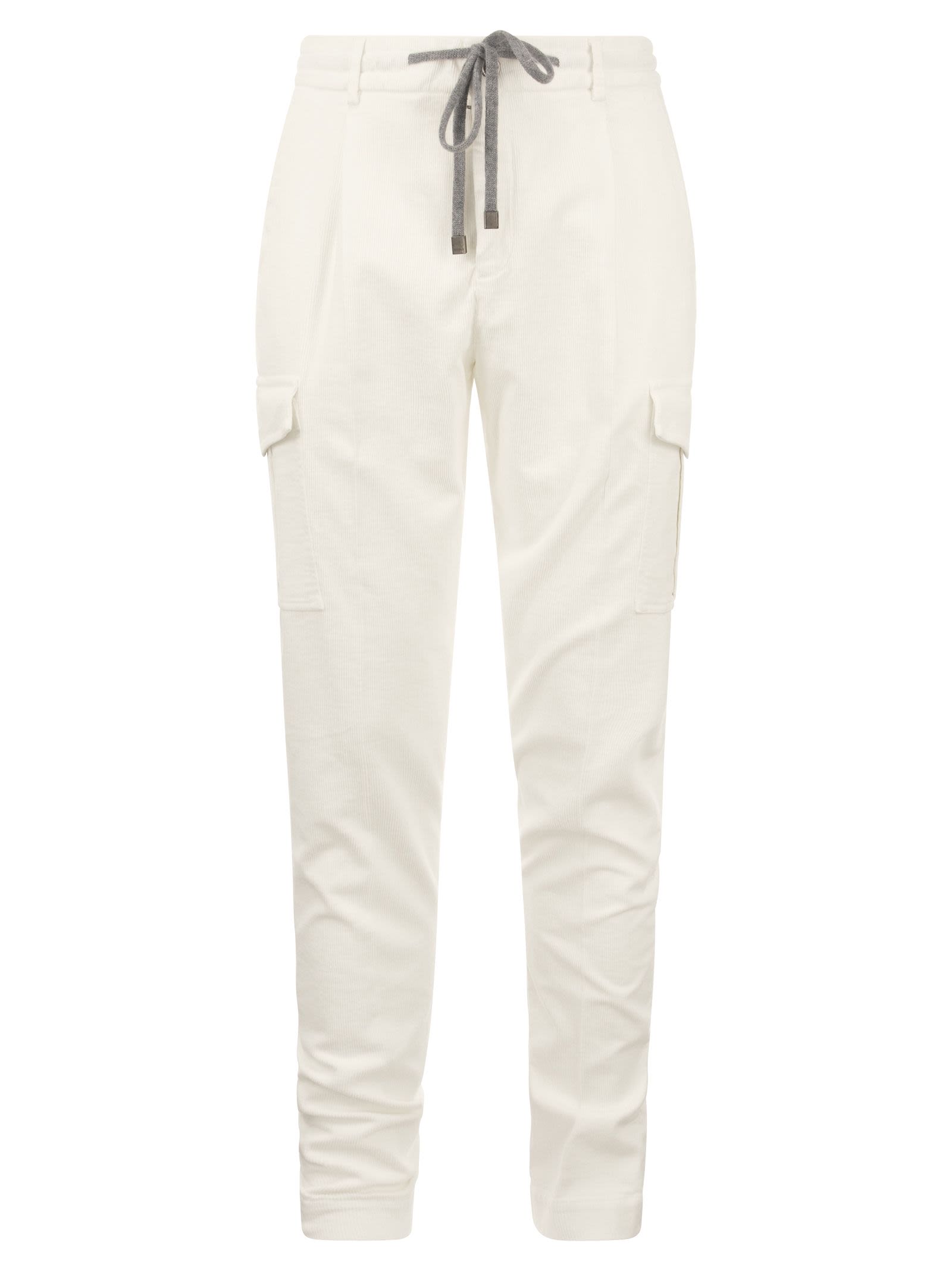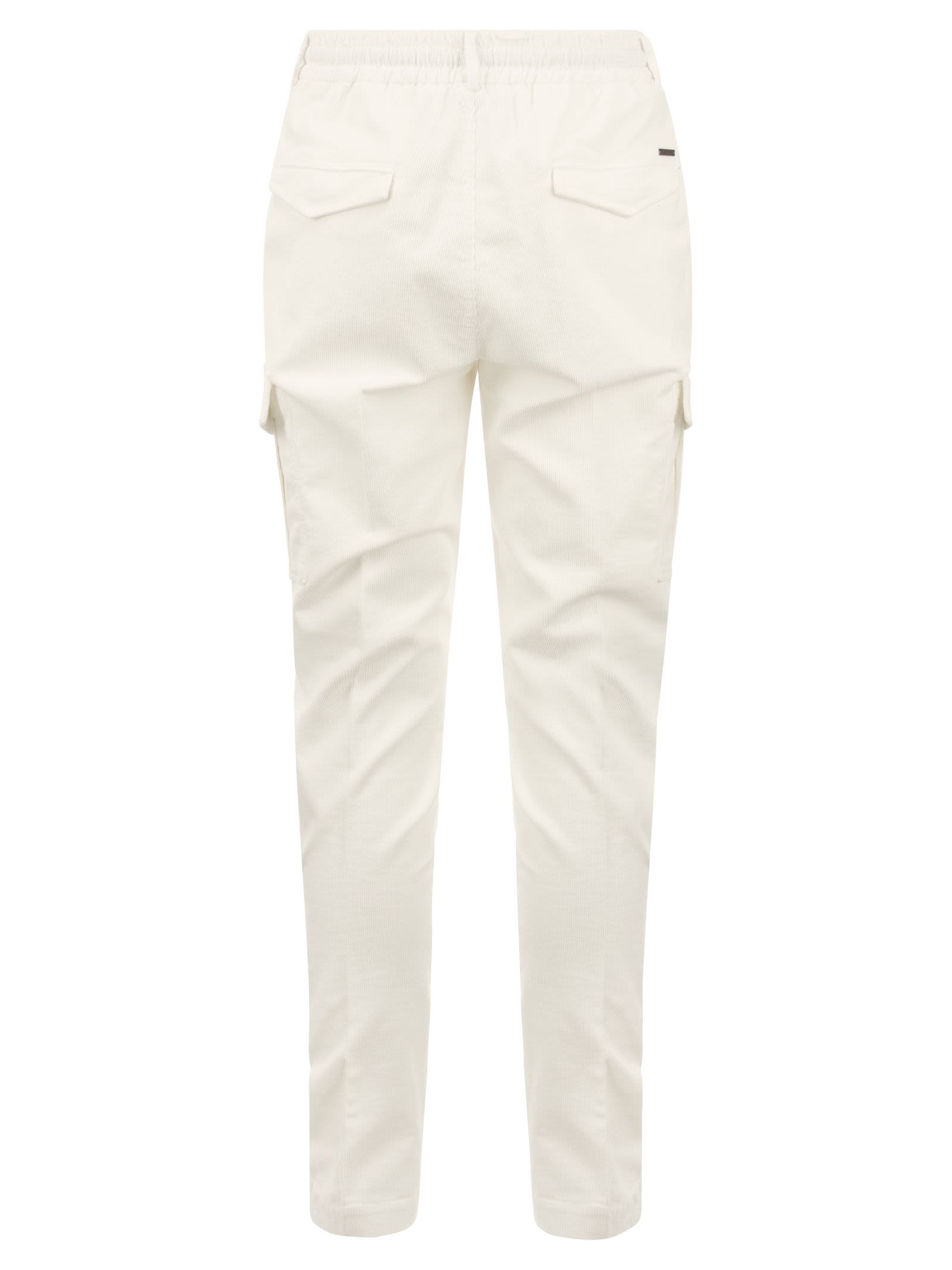 Cargo-style jogger trousers perfect for casual and sporty looks, this velvet model has an elasticated waistband with drawstring and America pockets at the front and flap pockets at the back. - Relaxed fit with 1 dart - Logo metal plaque DESIGNER ID: R54575T0 03277 401