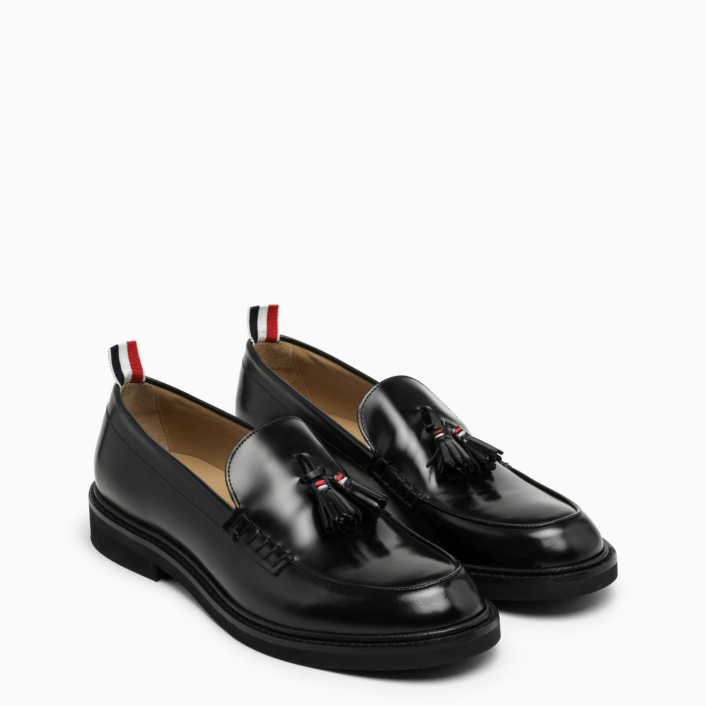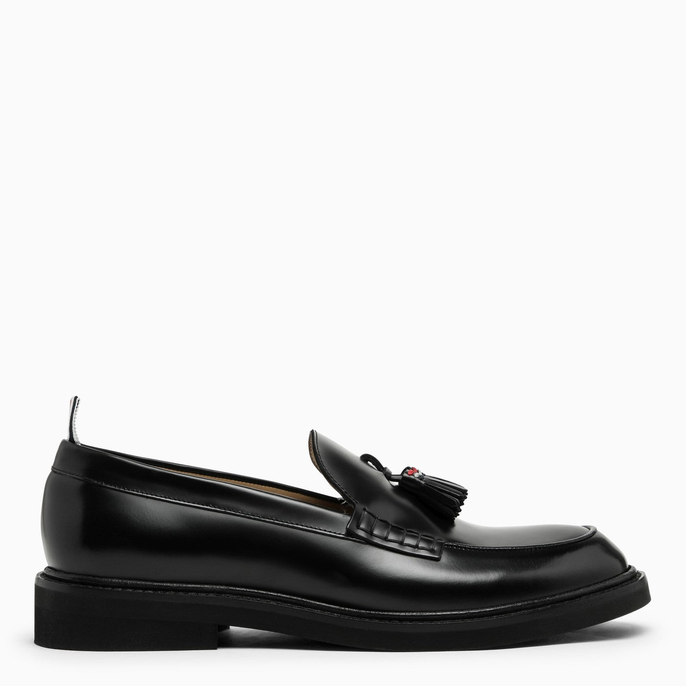 Black leather loafer from Thom Browne featuring a round toe, a tassel detail on the front, a striped logo detail on the back, a logo insole and a leather sole.