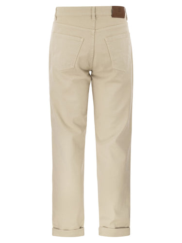 Seasonal nuances enrich the iconic style of the five-pocket trousers in garment-dyed denim, characterised by a pleasantly light and comfortable texture. The traditional fit expresses the most classic Brunello Cucinelli taste and features regular lines all along the leg. - Traditional fit: the fit is characterised by regular volumes on the pelvis and straight lines along the leg - Metal button fastening - Front pockets with breast pocket - Patch back pockets - Hem 18 cm DESIGNER ID: M277PD3210 C6233