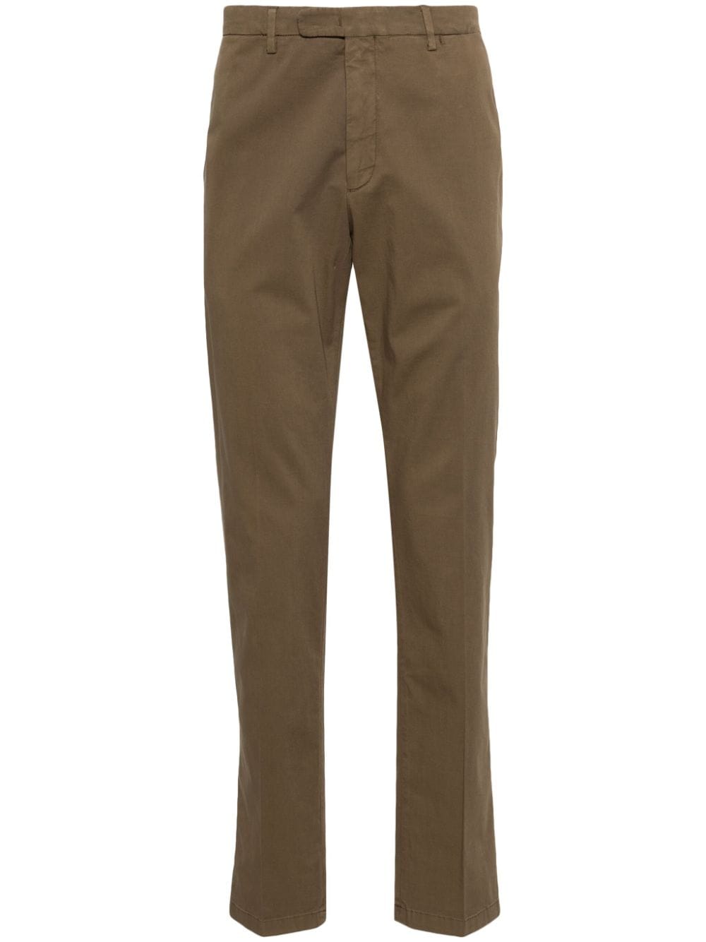 almond beige stretch-cotton twill weave button fly fastening belt loops pressed crease slim cut two side slit pockets two rear jetted pockets