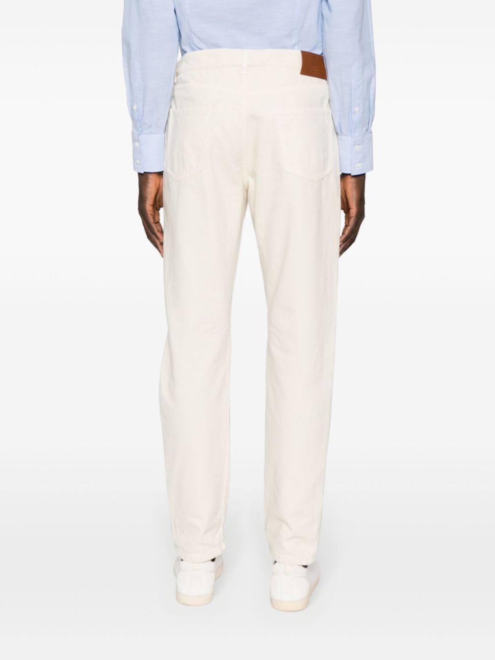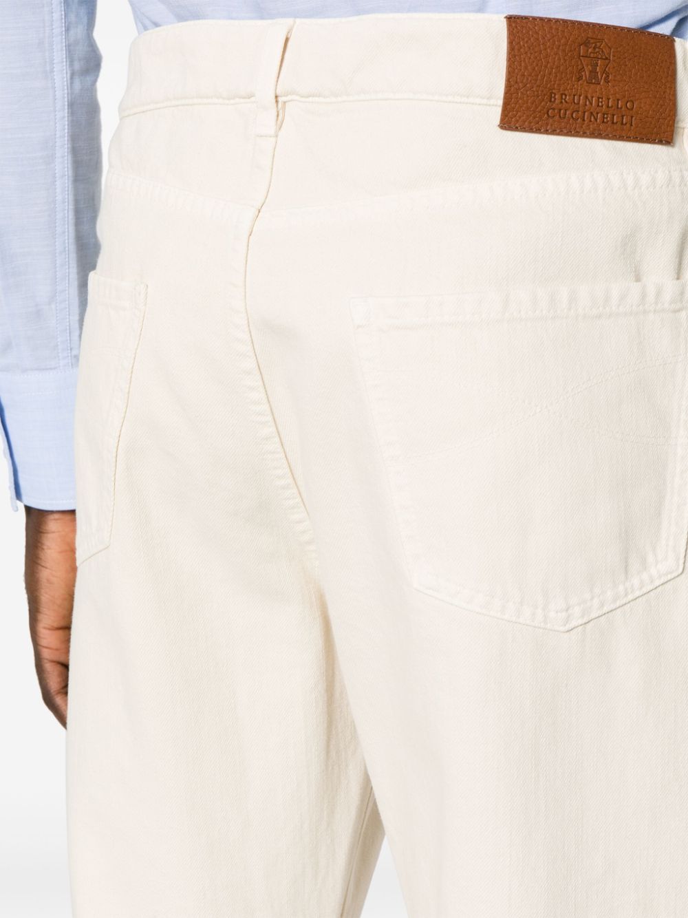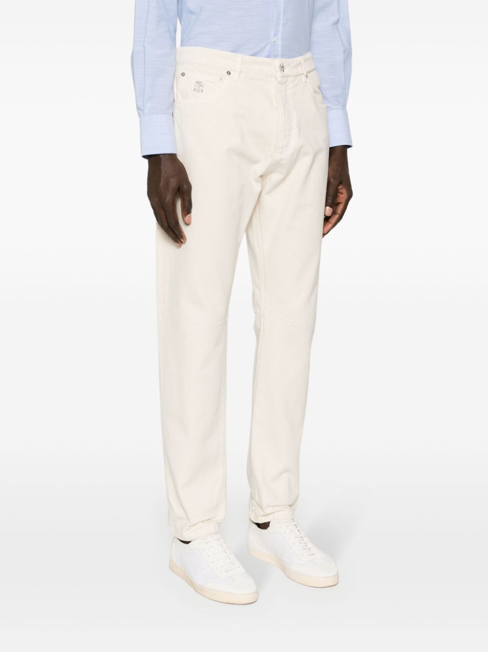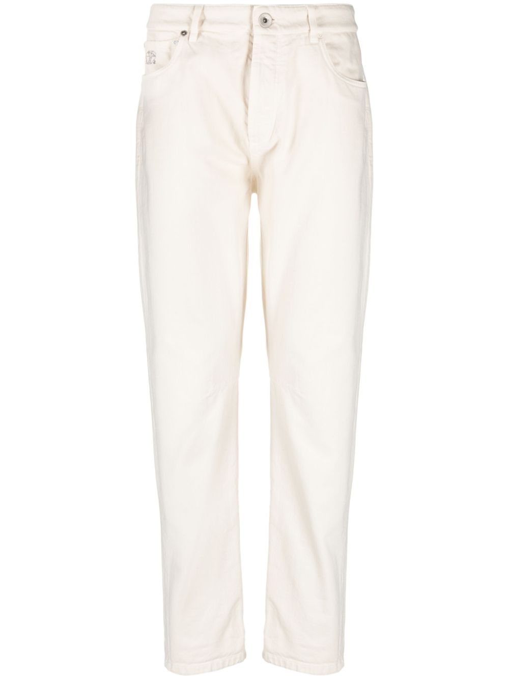ivory white cotton denim embroidered logo to the front logo patch to the rear straight leg mid-rise button fly fastening belt loops classic five pockets