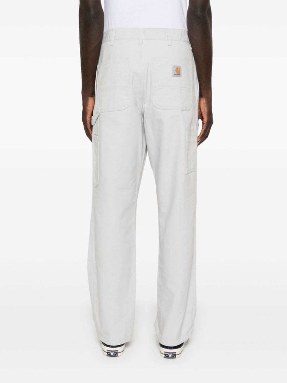 light grey organic cotton canvas straight leg mid-waist belt loops two diagonal pockets to the sides reinforced knees two rear patch pockets logo patch to the rear front button and zip fastening This item is made from at least 50% organic materials. Learn more about what makes a product Conscious on our Conscious Criteria page
