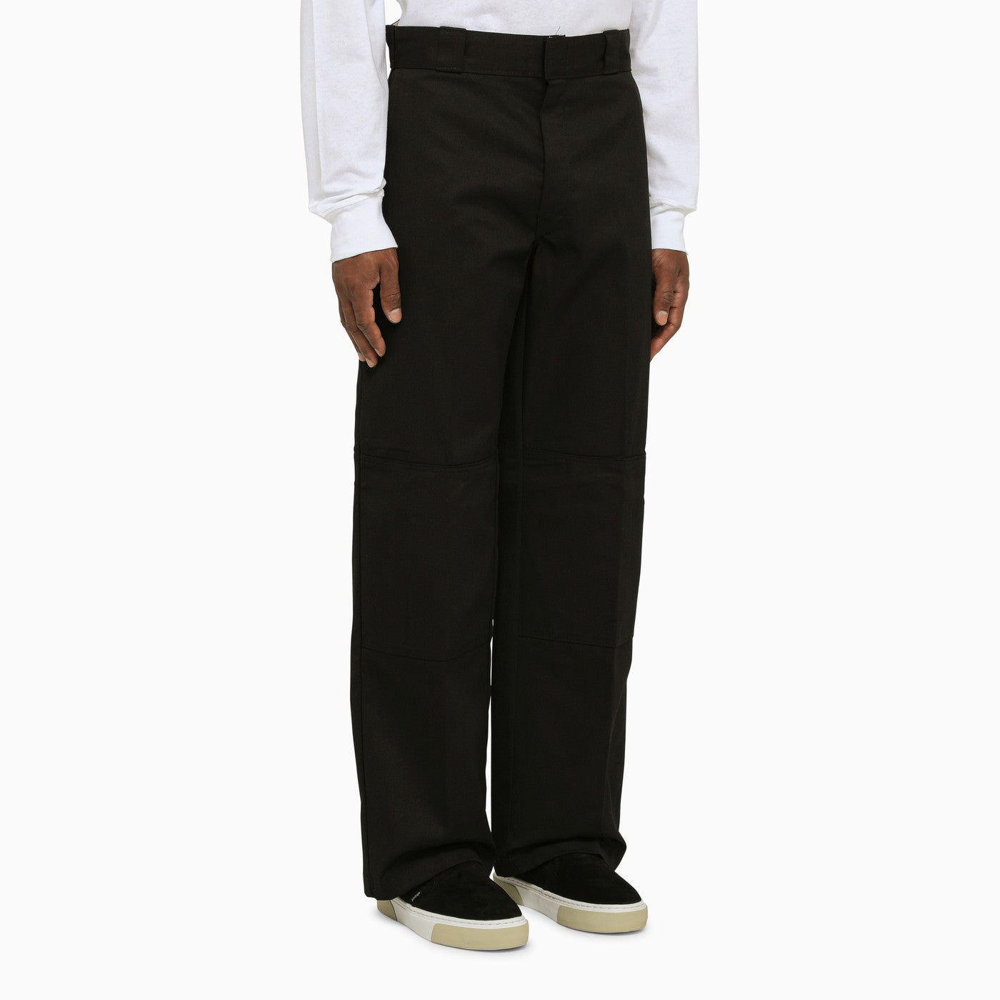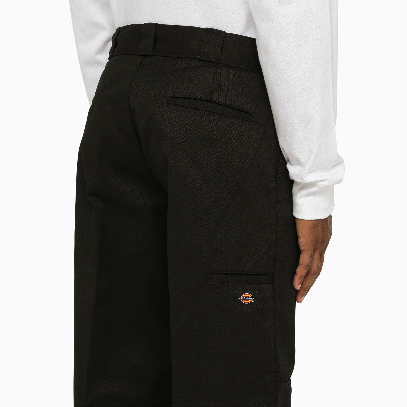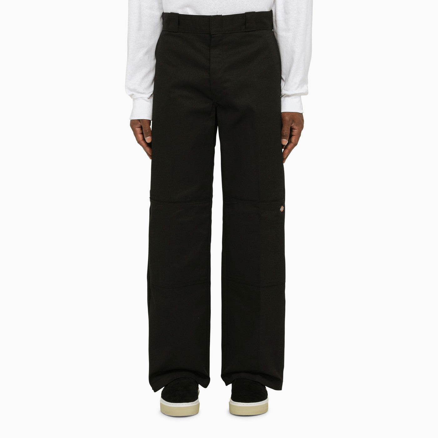 Work trousers by Dickies in black polyester and cotton blend, featuring belt loops, zip fastening, side welt pockets, thigh pockets, rear welt pocket, reinforced knees and logo patch on the back.