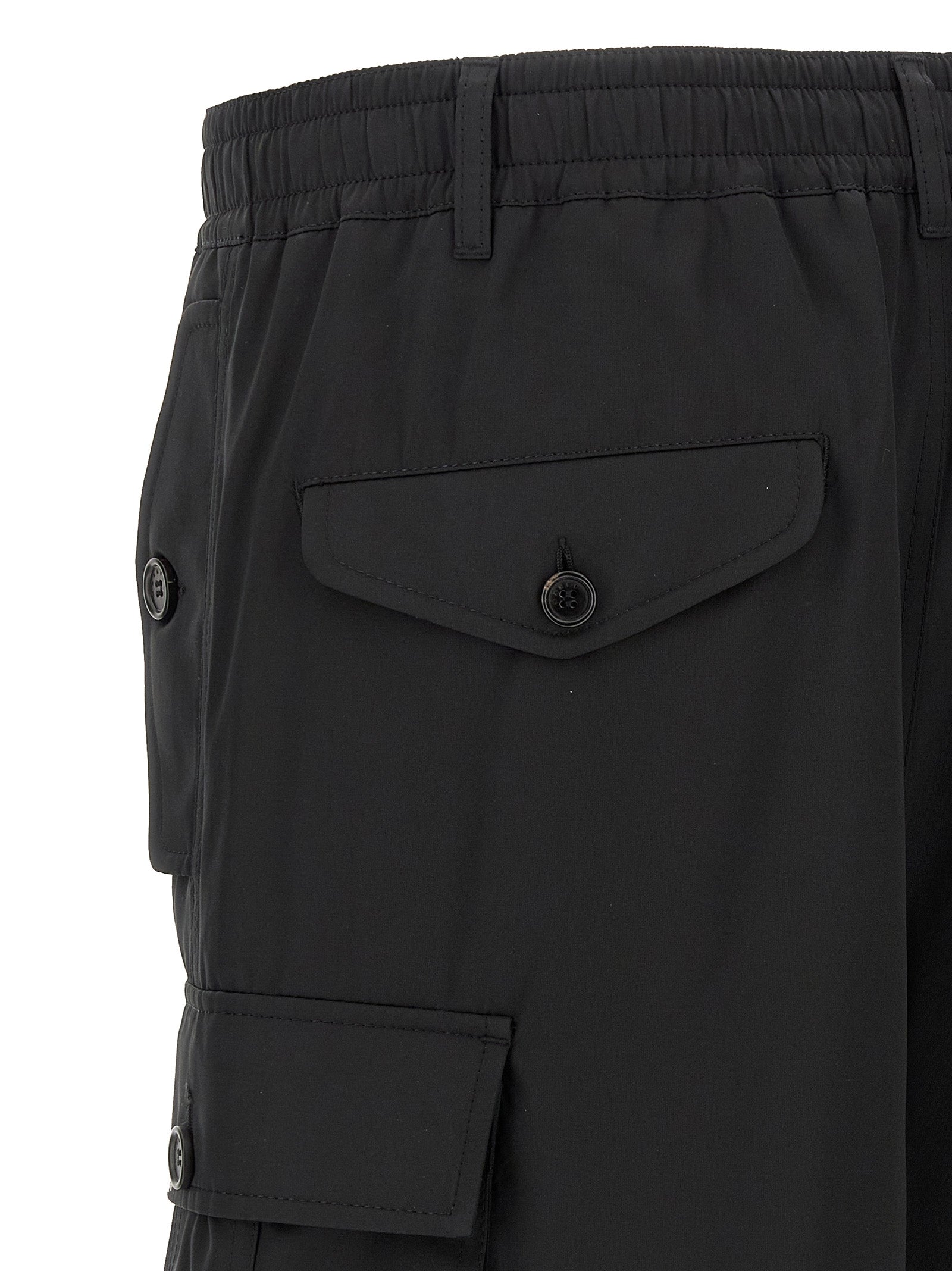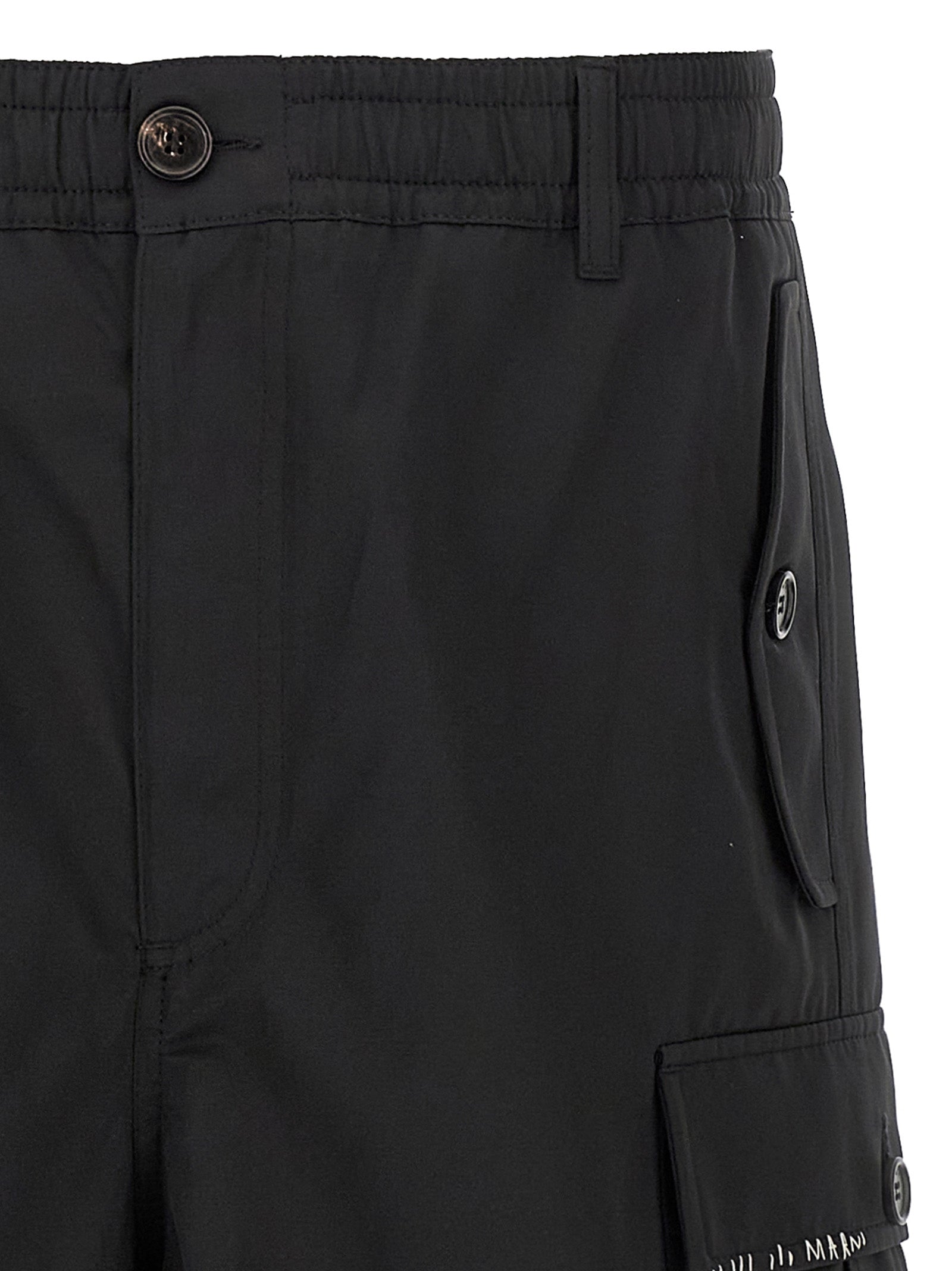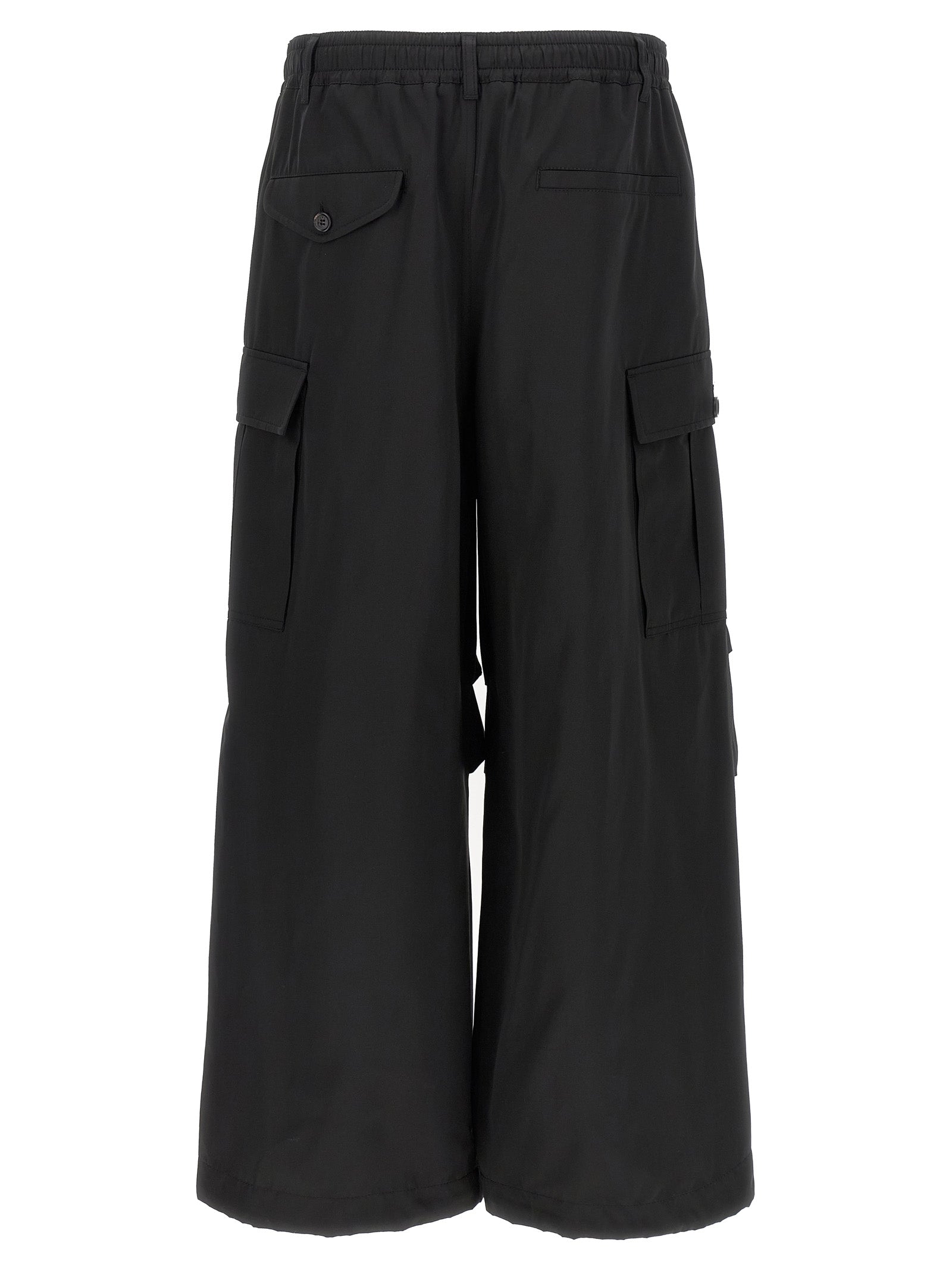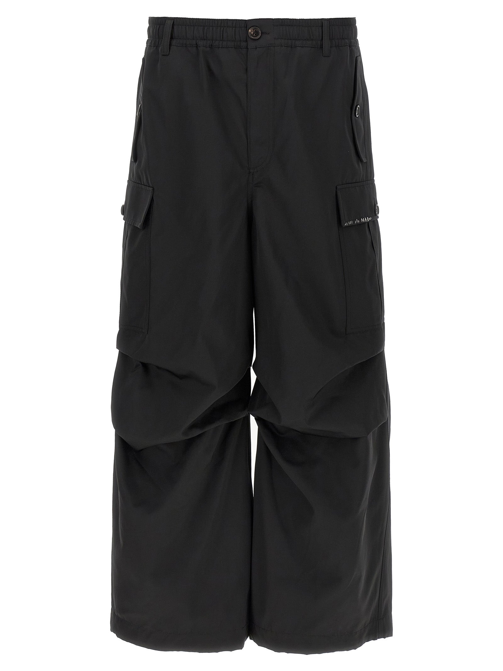 High-waisted pants in cotton and polyester taffeta with water-repellent finish, cargo pockets and contrasting embroidered logo, adjustable drawstring elastic at the waist, front zip and button closure, wide leg, pockets. SUSTAINABLE: Product made with recycled materials.