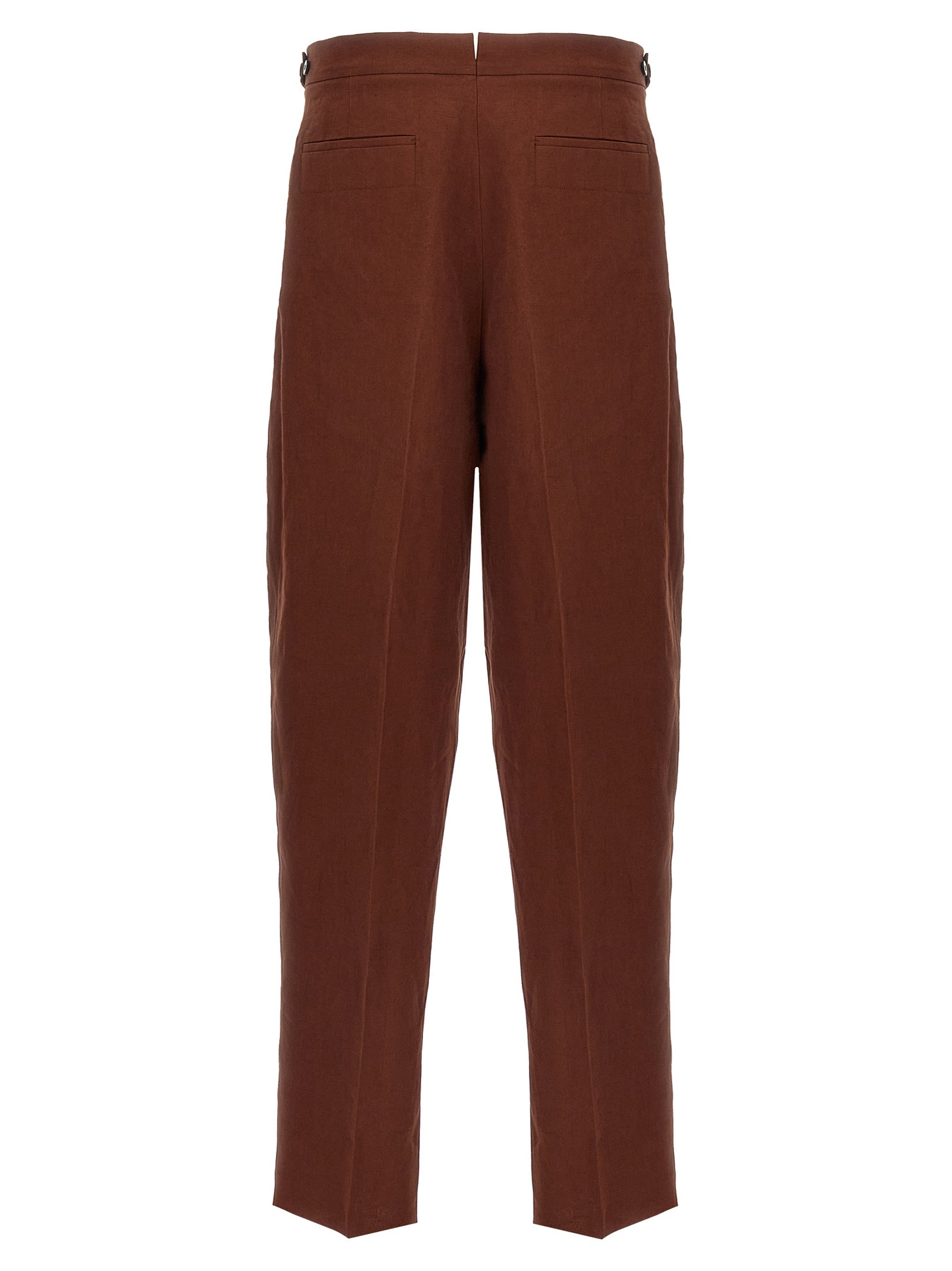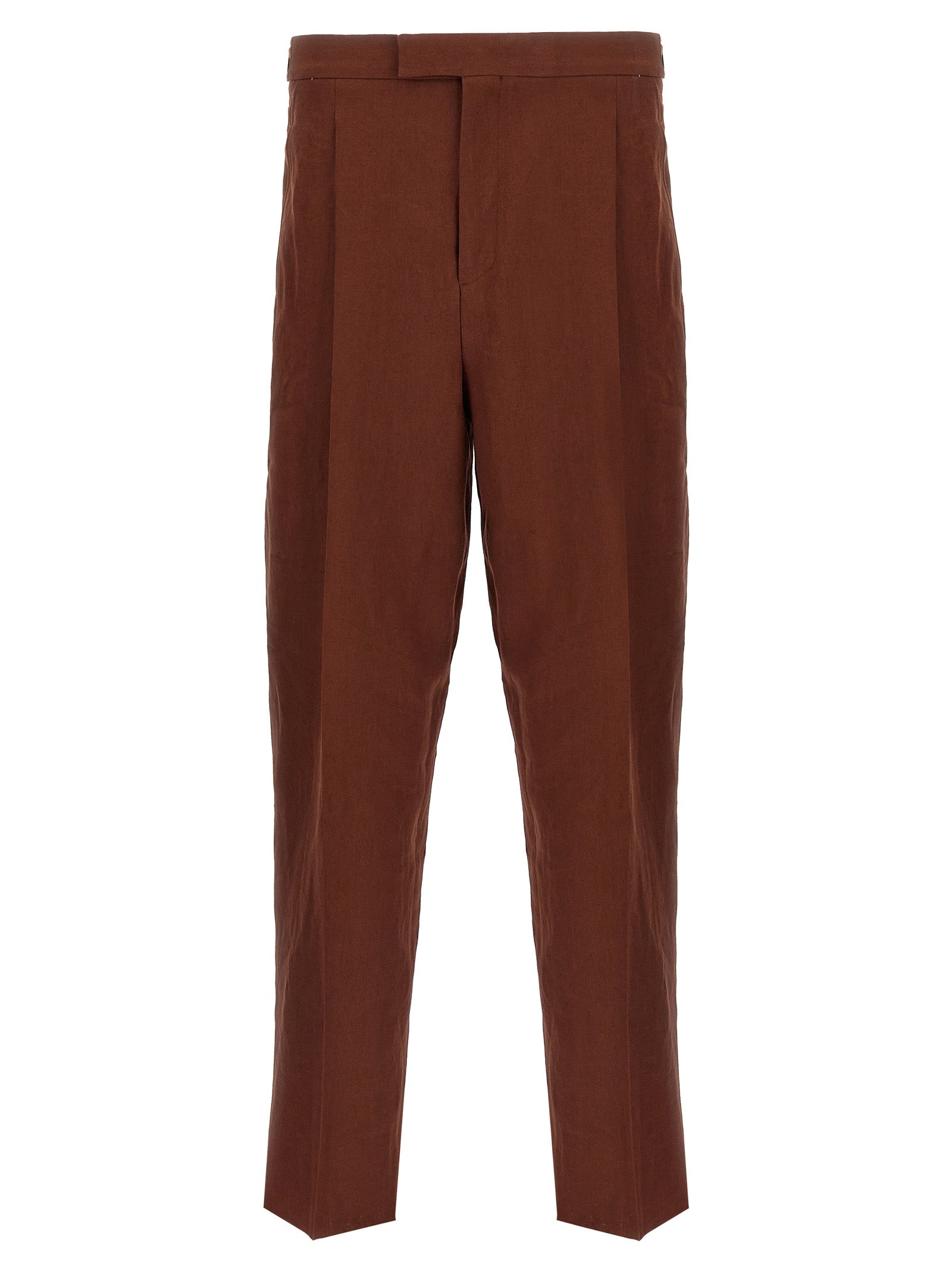 Linen Oasi fabric pants, pince, straight leg, stretched crease, hook and button zip closure, pockets, adjustable straps at the waist.