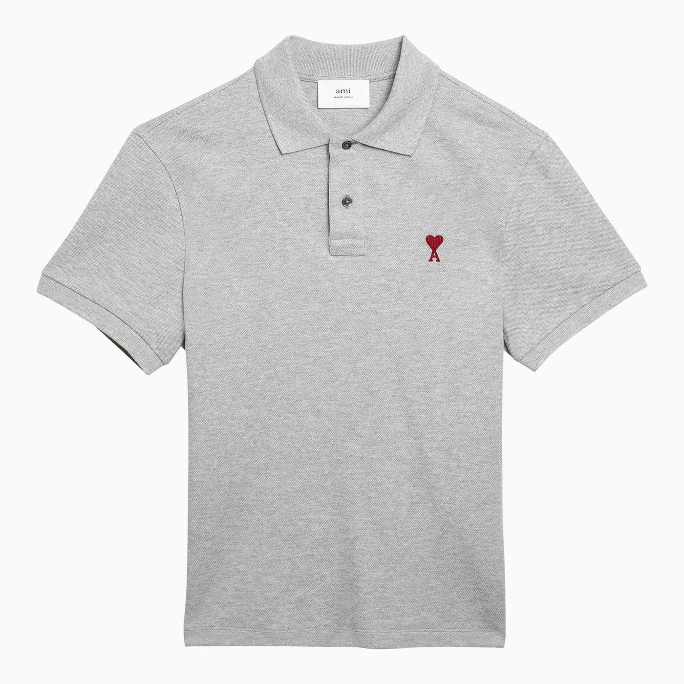 Ami Paris polo shirt in heather grey cotton with a front button closure, classic collar, short sleeves, red Ami De Coeur embroidery on the chest and regular fit.