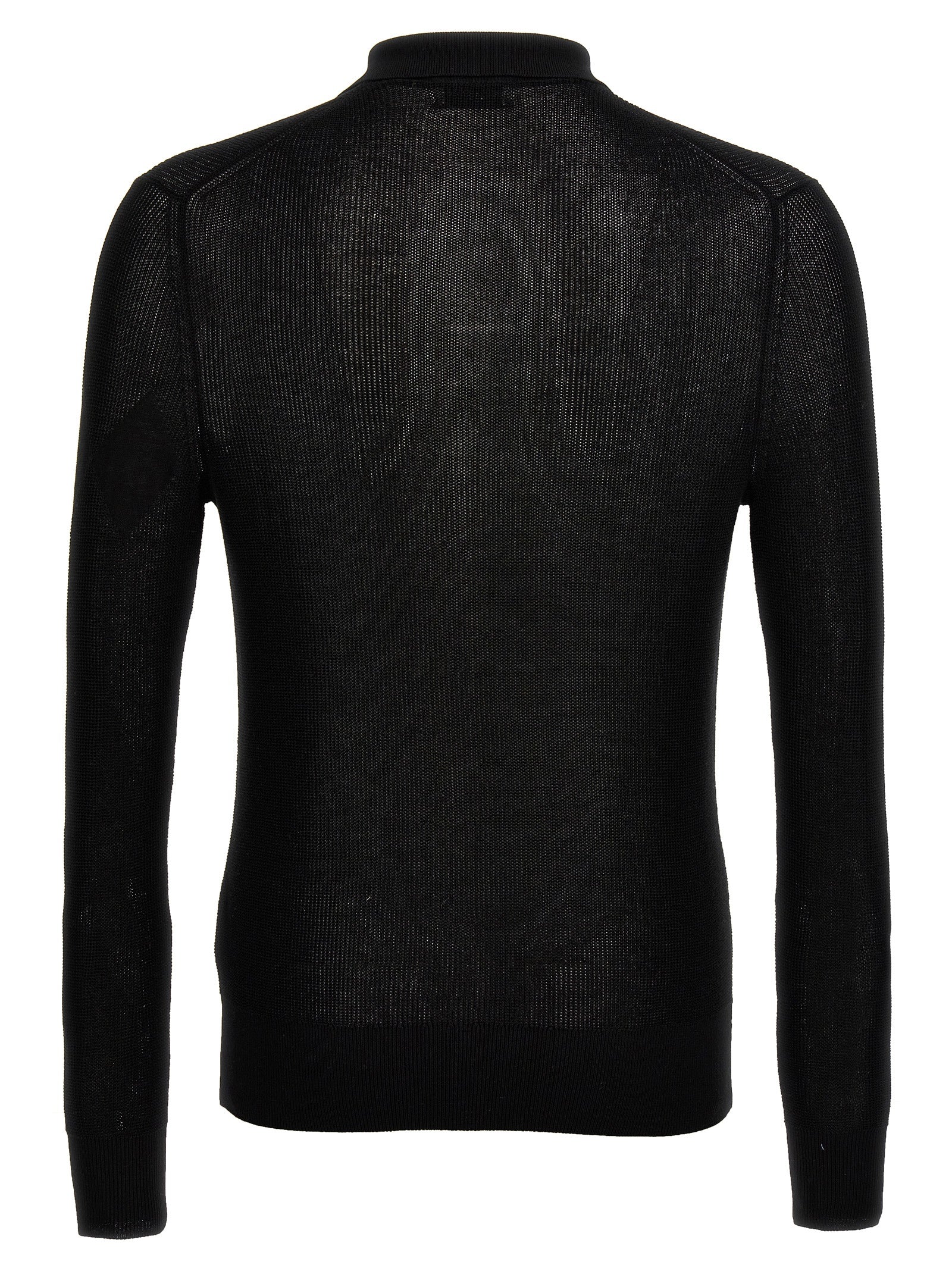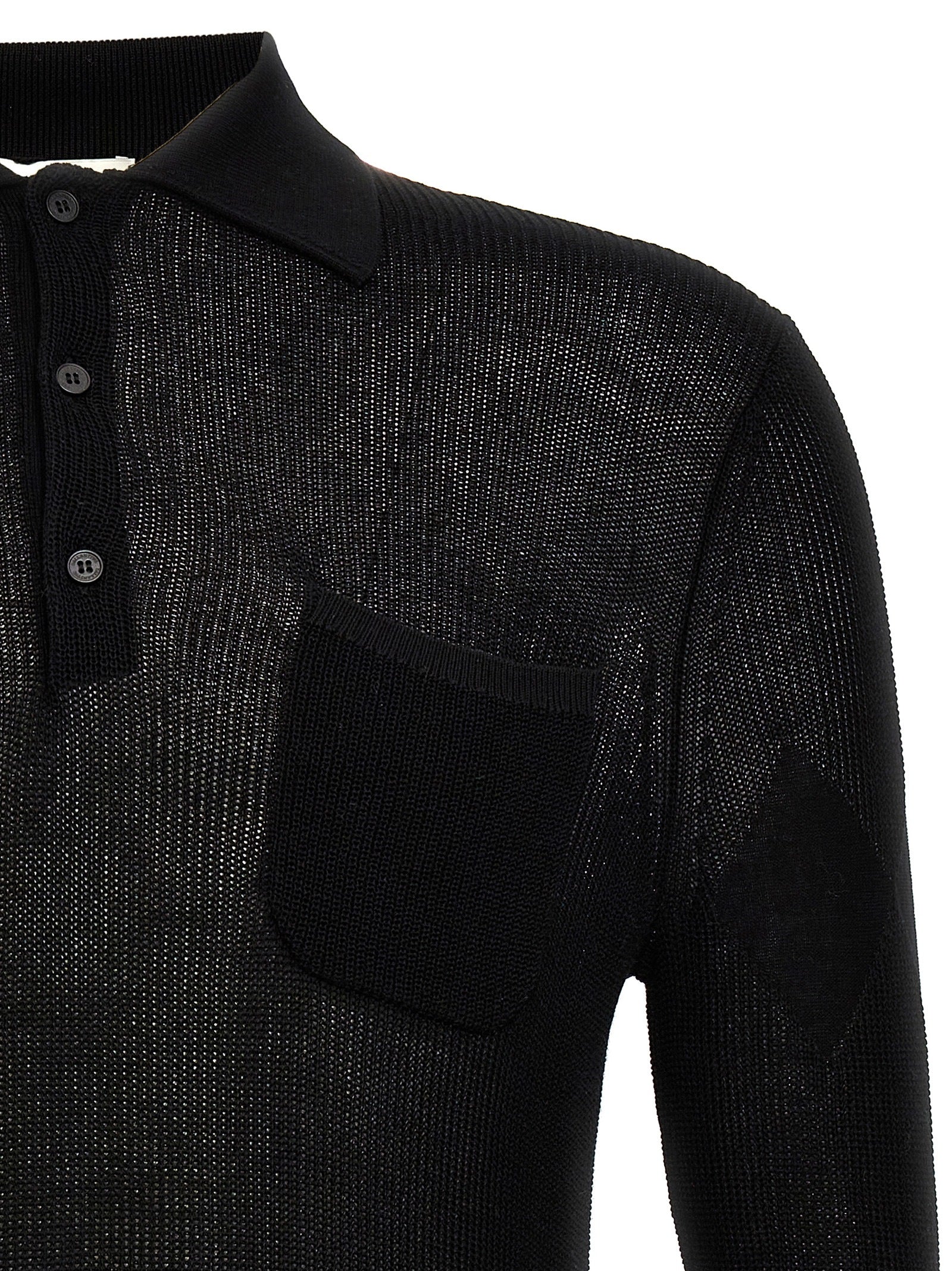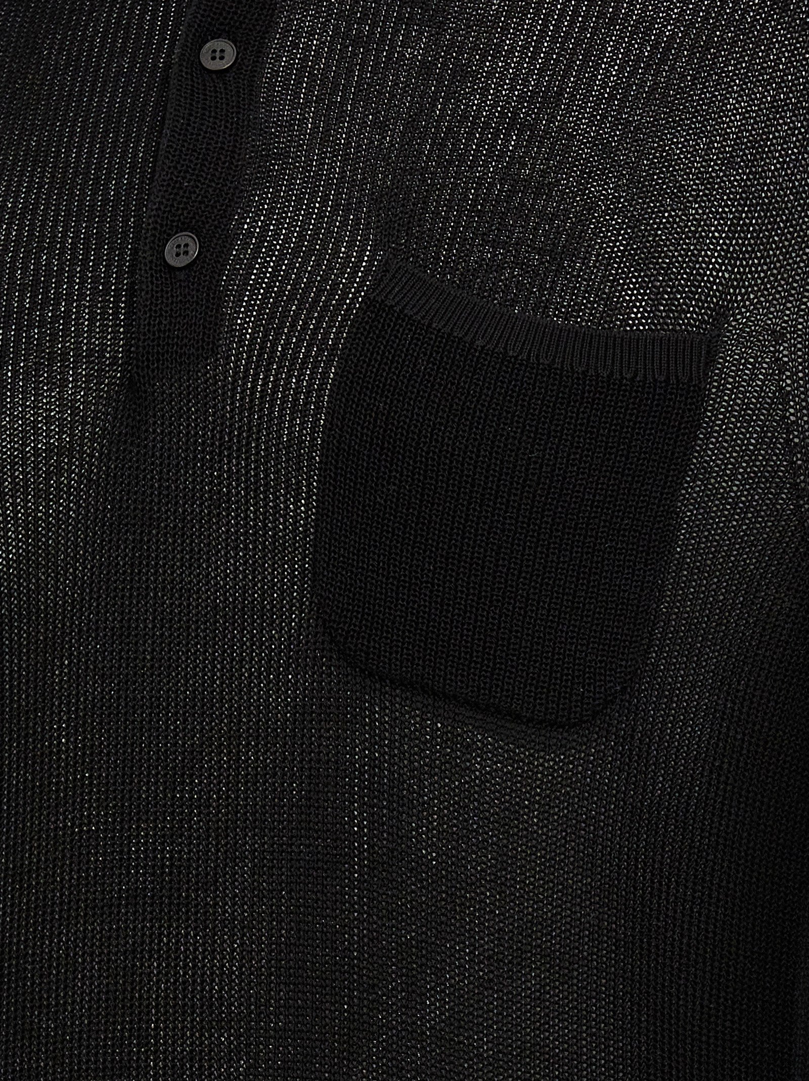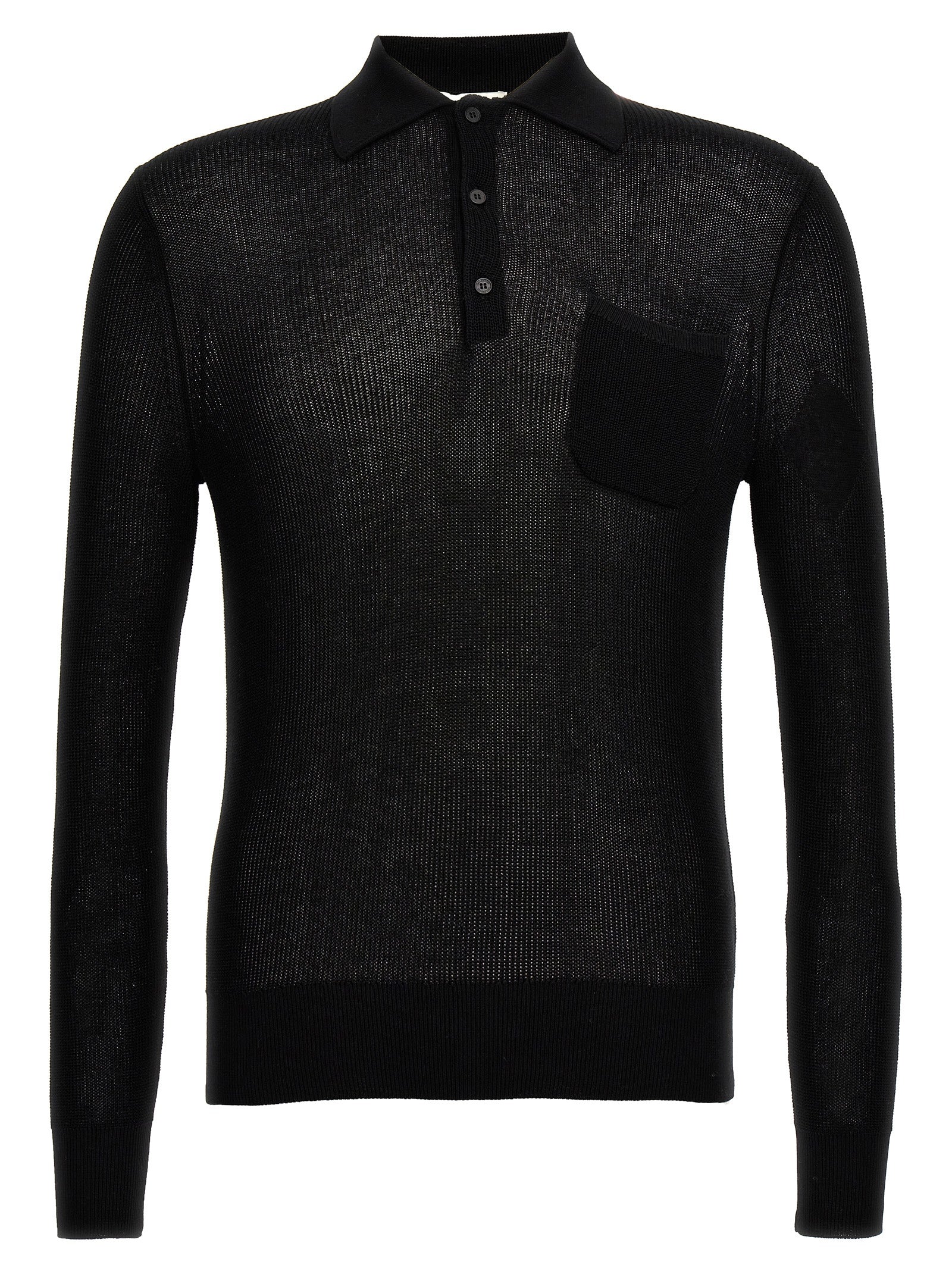 Cotton knit polo shirt with front pocket, long cuffed sleeves.