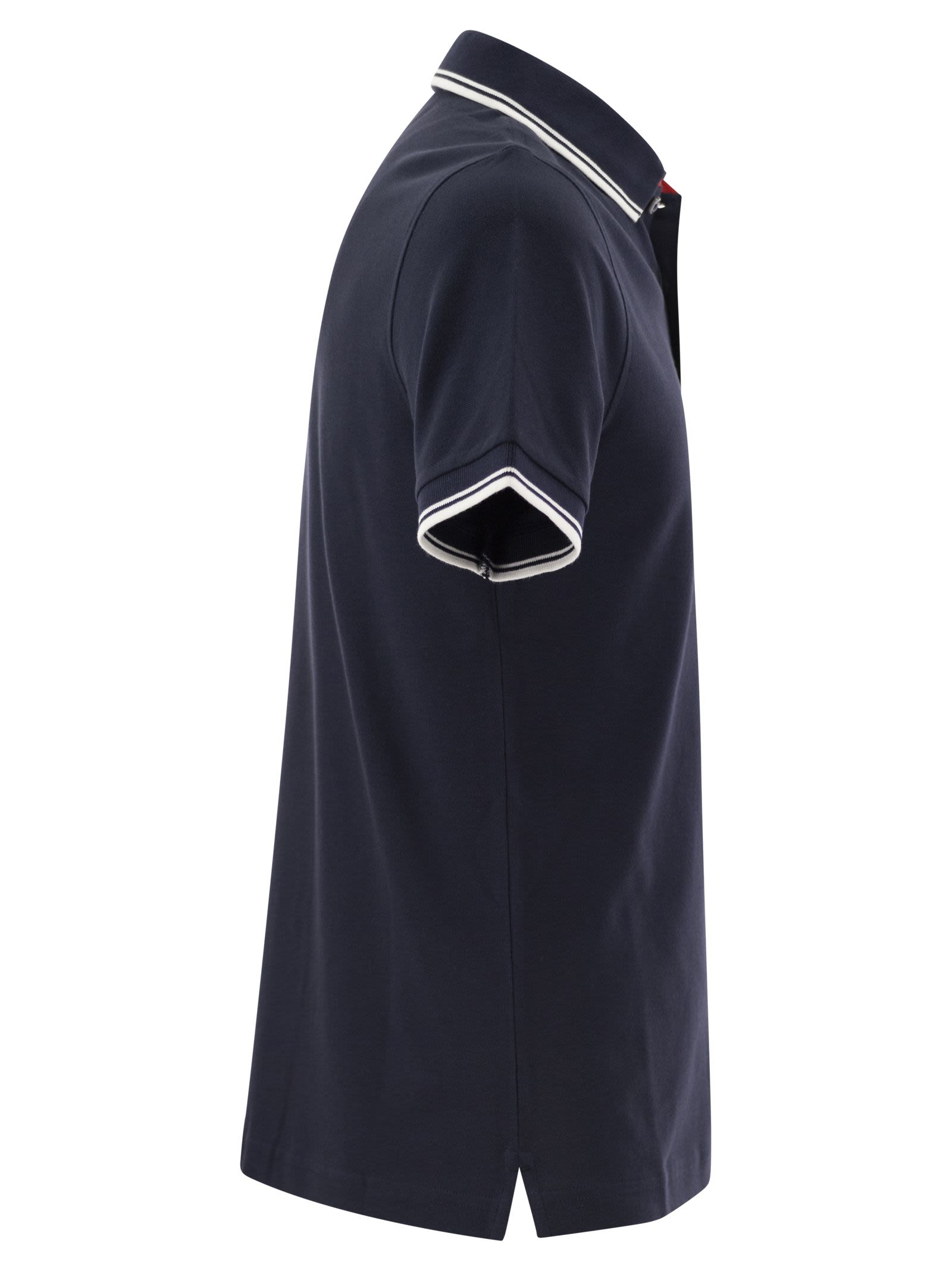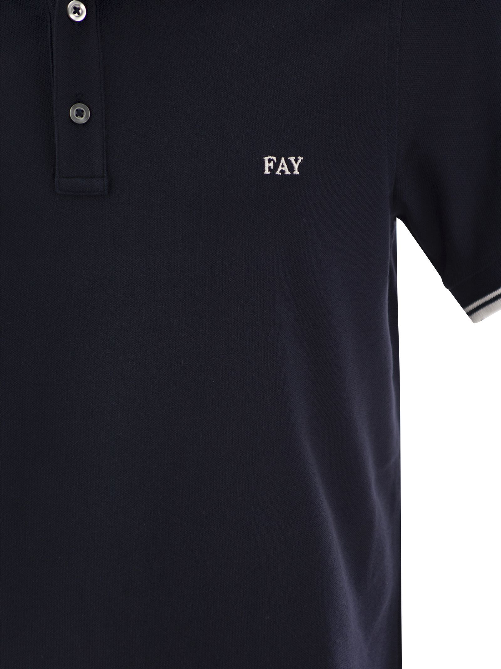 Short-sleeve slim fit polo shirt in stretch piquet, with contrasting piping. Characterized by a collar with double construction, a refined reference to the brand's typical stylistic features, it is enriched by the Fay logo embroidered on the chest. - Fitting: slim DESIGNER ID: NPMB248140STDWU806