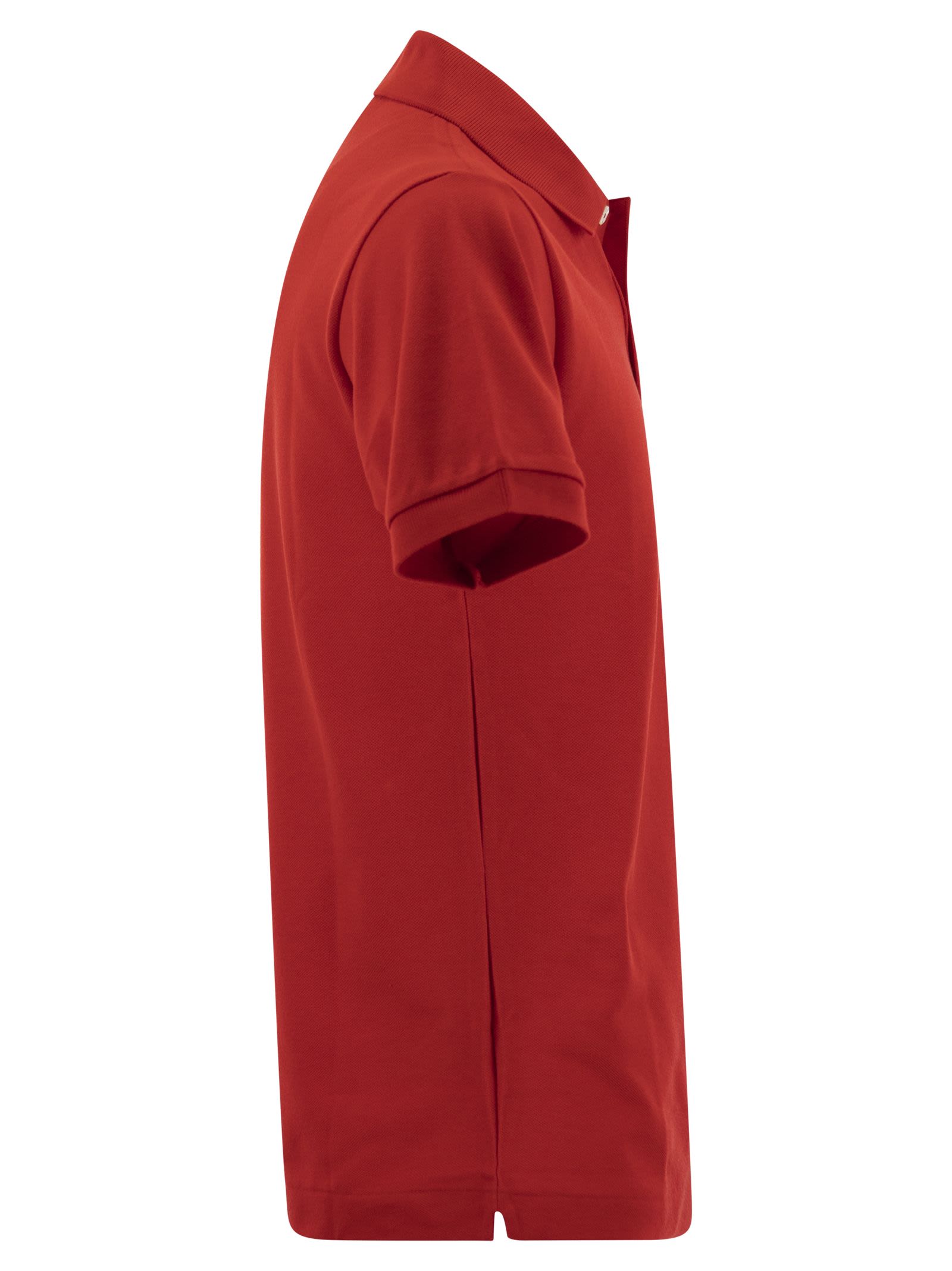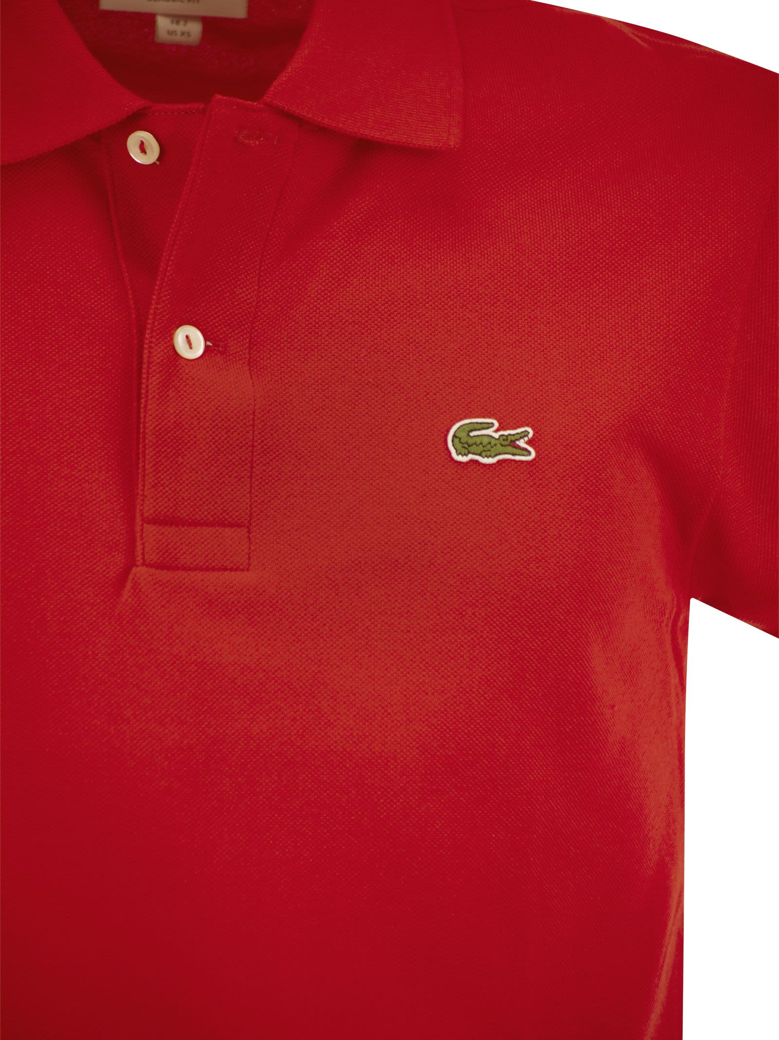An embroidered crocodile on the chest adds an irreverent touch to the otherwise understated look of this Lacoste polo shirt. Made from plain cotton pique, it features a comfortable straight cut, a classic collar with two mother-of-pearl buttons and tone-on-tone ribbed trims. A Lacoste must-have. - Cotton pique - Ribbed polo collar with two mother-of-pearl buttons - Classic cut - Ribbed trim on sleeve ends - Green crocodile embroidered on the chest - Classic fit DESIGNER ID: 1212 240