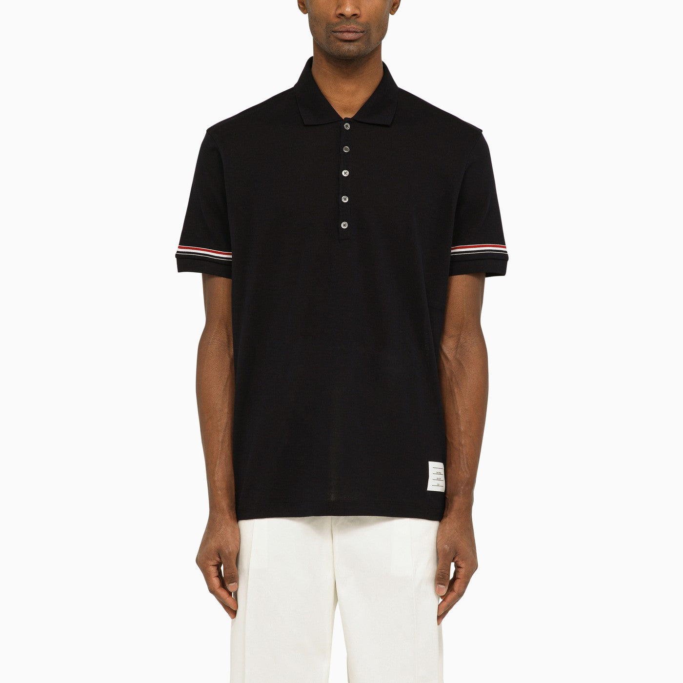 Short-skeeved polo shirt by Thom Bronwe in navy blue cotton feauturing classic collar, button front, short sleeves with tricolour detailing, stitched logo patch on the front and a straight hem.