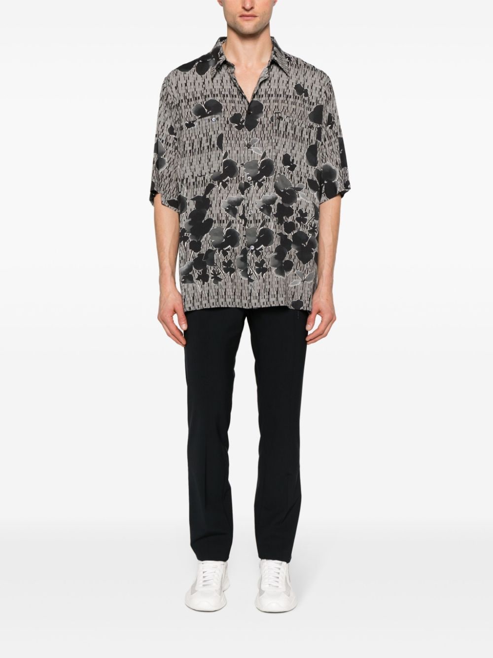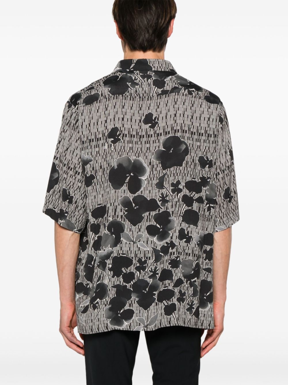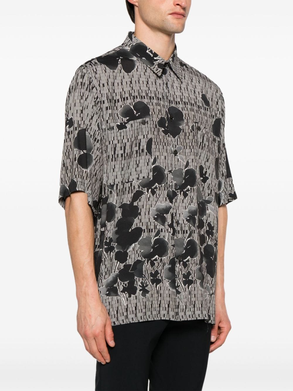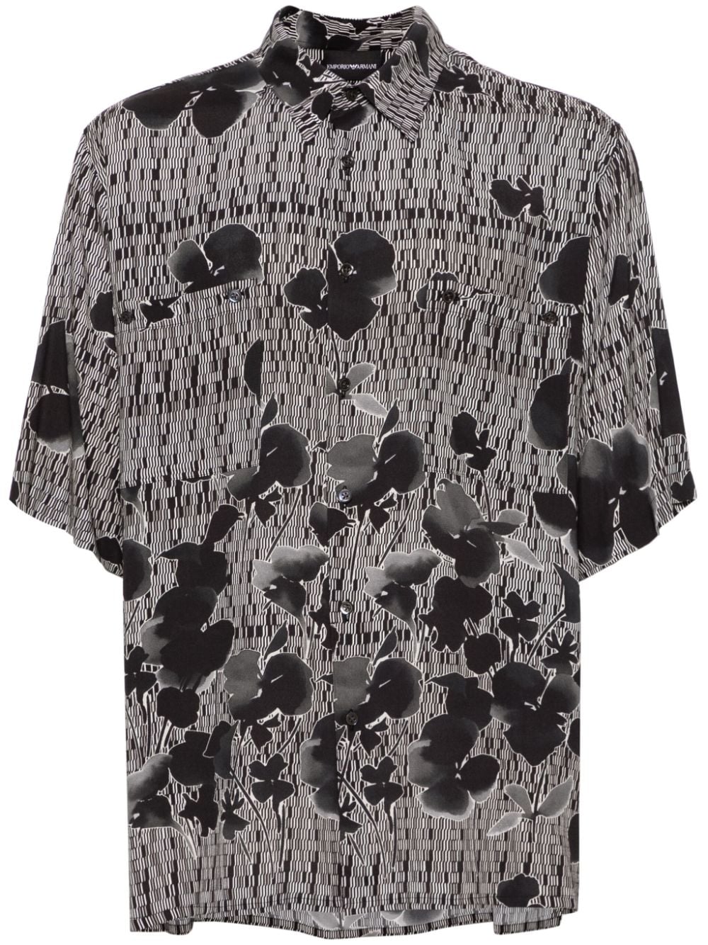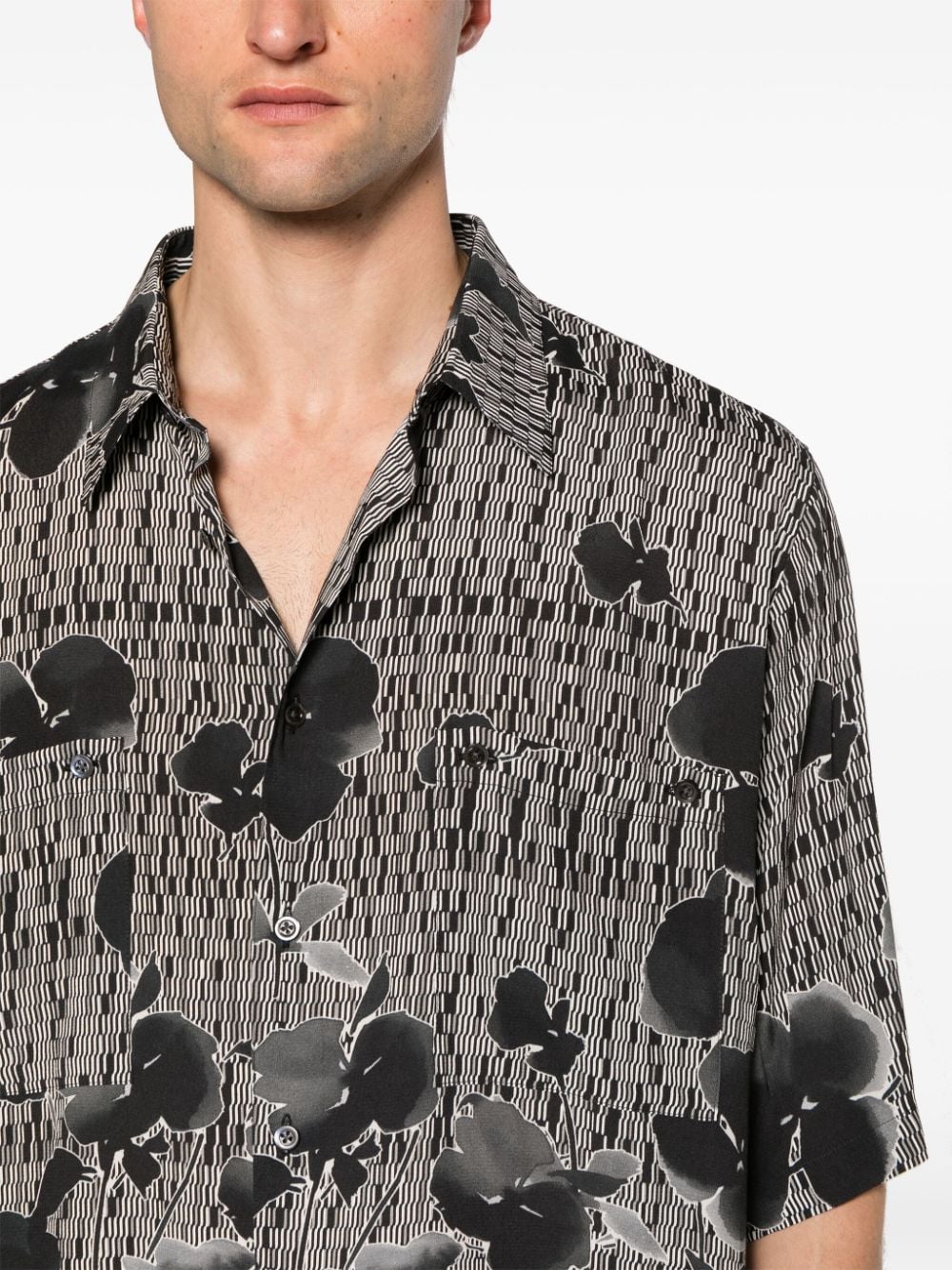 black/white all-over floral and stripe print classic collar front button fastening drop shoulder short sleeves two button-fastening chest pockets short side slits straight hem long length