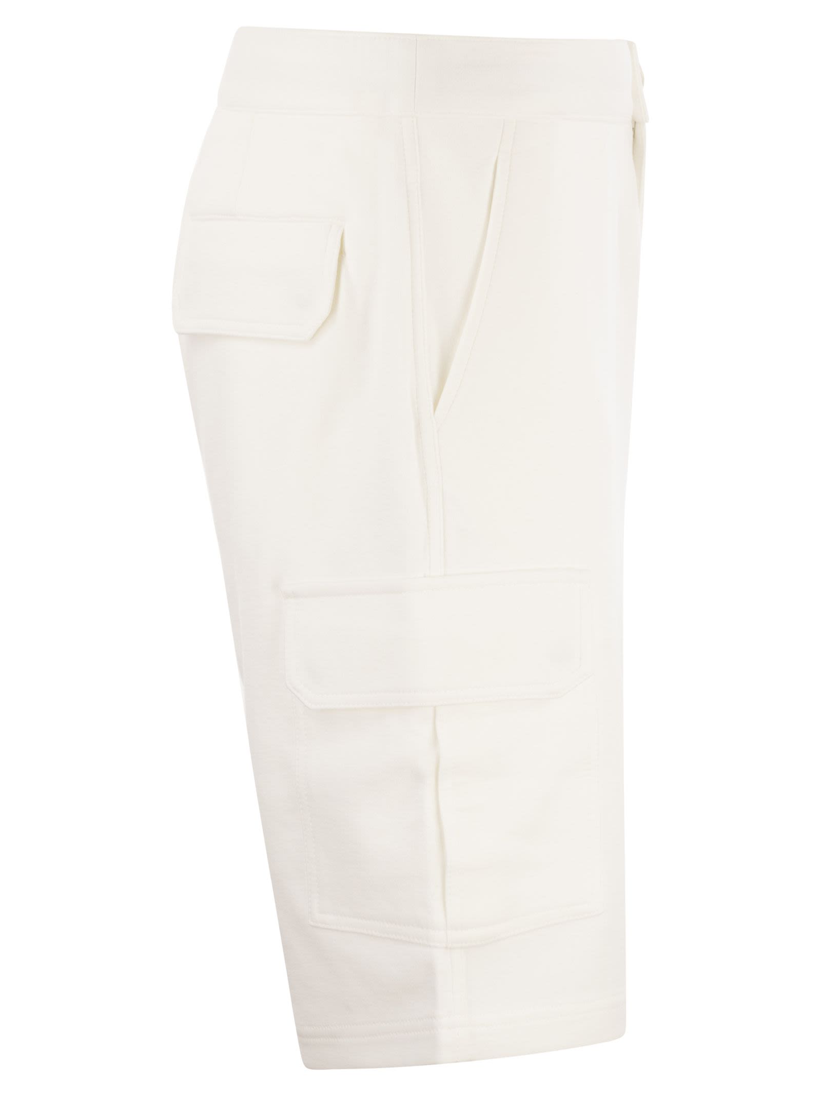 The quality of Brunello Cucinelli materials enriches the Travelwear line, dedicated to moments of relaxation and free time. The bermuda trousers in light techno cotton fleece are characterised by the sporty detail of the cargo pockets and the adjustable drawstring waist. The fit is regular, both on the pelvis and along the thigh. - Zip fastening with button and drawstring - Front pockets - Cargo pockets with flap - Back welt pockets with flap DESIGNER ID: M0T353222G C7220